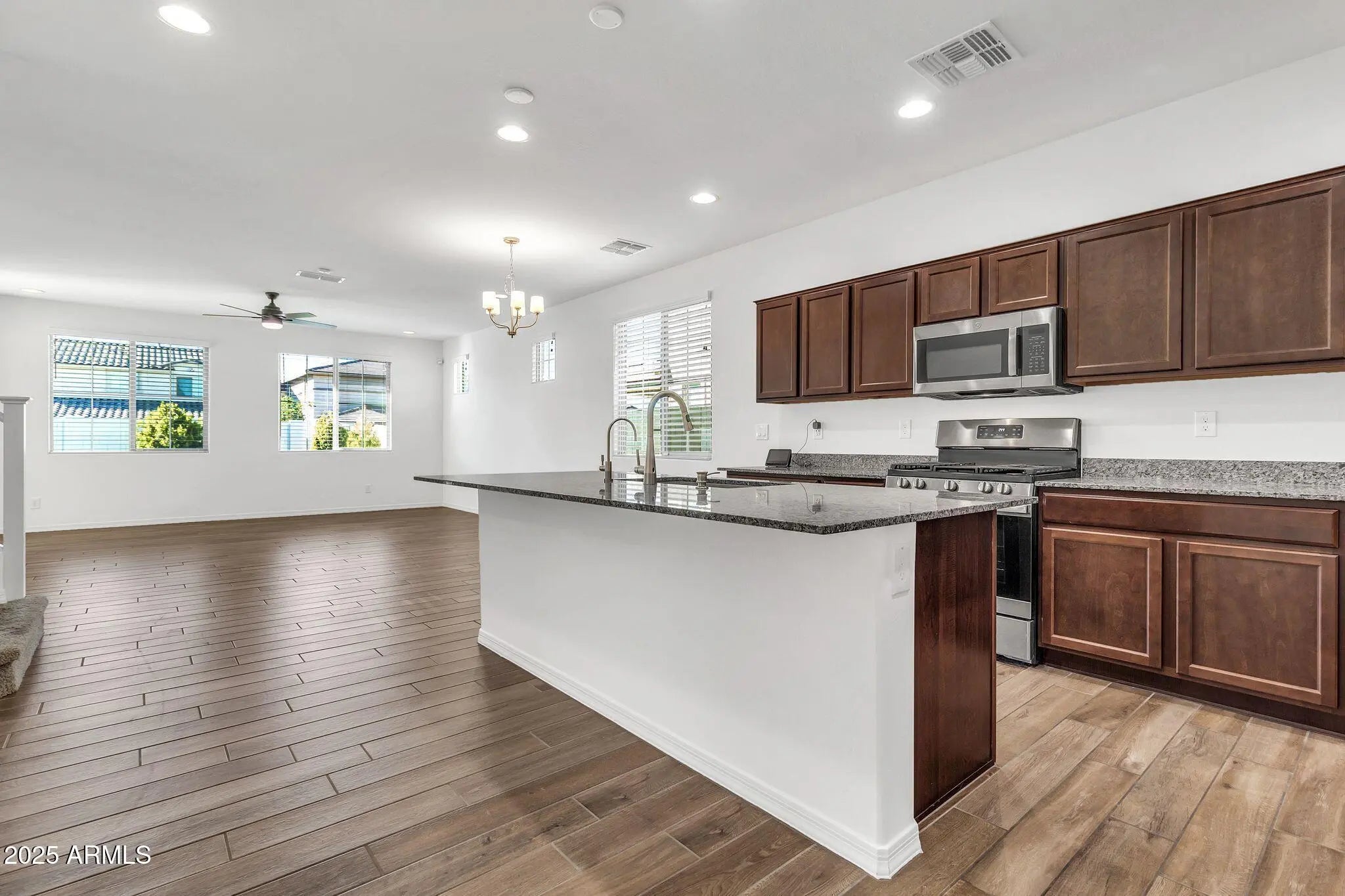 Discover this stunning two-story 5-bedroom, 3-bath home in Mesa, offering nearly 2,900 sq ft of upgraded living space on an oversized lot—perfect for families seeking room to grow! The main living areas feature durable and stylish wood-look tile flooring, while the bedrooms provide cozy carpeted comfort. At the heart of the home is a gourmet kitchen with a large island, abundant countertop and cabinet space, a convenient walk-in pantry, elegant granite counters, and premium stainless steel appliances. The oversized primary suite impresses with a luxurious en suite bathroom featuring dual sinks and a spacious walk-in closet. The generous guest bedrooms offer flexibility for offices, playrooms, or hobbies. Step outside to your private oasis: a beautifully designer-landscaped backyard with low-maintenance desert landscaping and an extended patio ideal for entertaining or relaxing in Arizona's sunshine. This wonderfully upgraded home combines modern amenities with thoughtful design in a prime Mesa location!