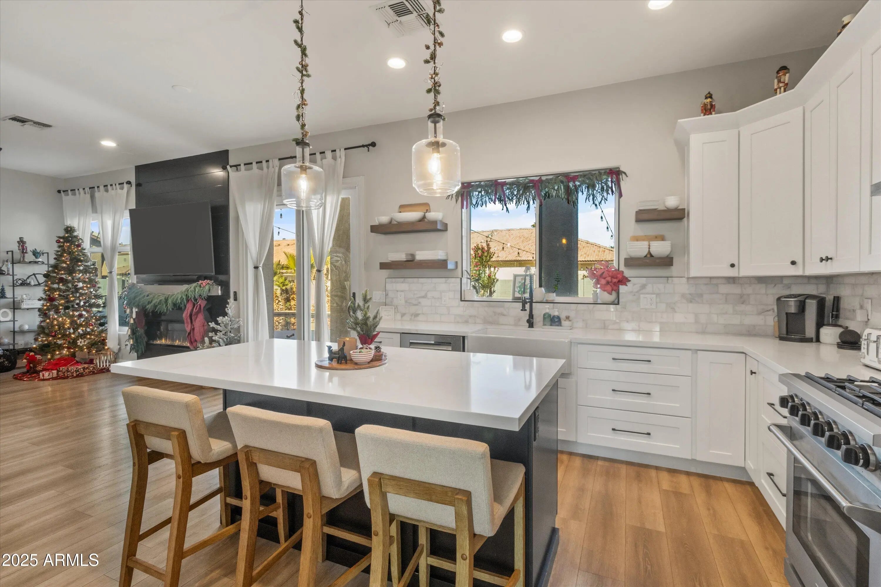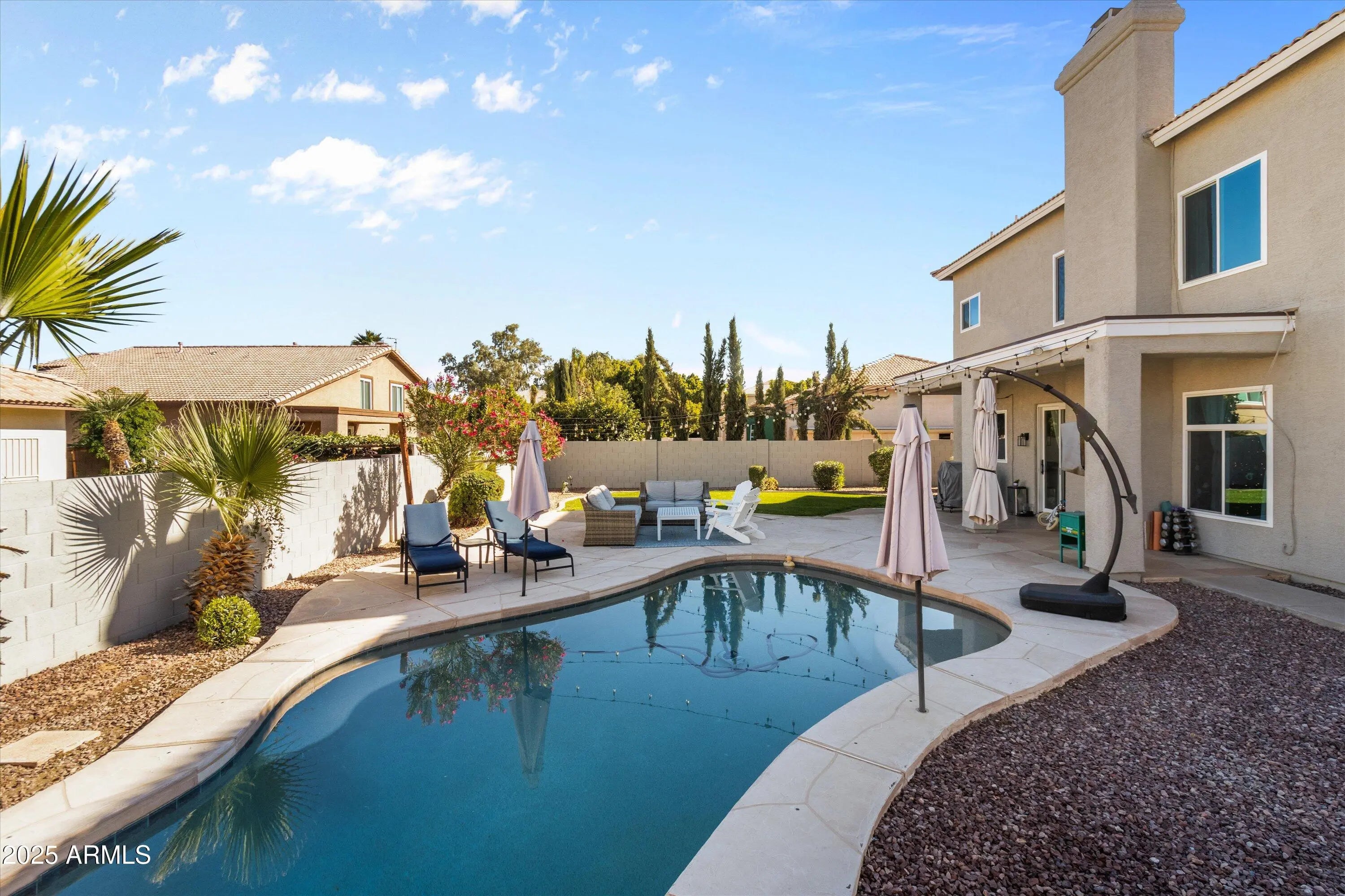 Welcome to your dream home in Gilbert's highly sought-after 85296 zip code, just minutes from vibrant Downtown Gilbert. This beautifully remodeled residence has over 200K in upgrades & offers 5 bedrooms, 3 bathrooms, and 2,735 square feet of luxurious living space on a large, quiet lot. With main level convenience featuring one bedroom and full bathroom downstairs, perfect for guests or multi-generational living. Step into a kitchen only a chef could dream of with Quartz countertops, gas range, spacious island, stainless steel hood vent, custom tile backsplash, and a huge walk-in pantry. The kitchen is open to the family room where you can enjoy a sleek linear electric fireplace set in a dramatic floor-to-ceiling custom black tile wall creating a cozy yet modern focal point. Heading upstairs you will find a double door entry primary suite w/a spa-like bathroom featuring a walk-in shower, soaking tub, and dual-sink vanity. In addition to the primary suite there are three generously sized bedrooms with a guest bathroom that rivals the primary suite in luxury and design. Enjoy the beautiful outdoors in your oversized private yard, complete with a sparkling play pool and a lush grass area, ideal for entertaining, family games, or for your furry friends. This home combines modern elegance with everyday functionality, offering the perfect setting for both relaxation and entertaining. Major mechanical upgrades to the home include: all new windows in 2021, new garage doors in 2021, Katch A Kid pool cover in 2022, full home remodel floor to ceiling in 2022!