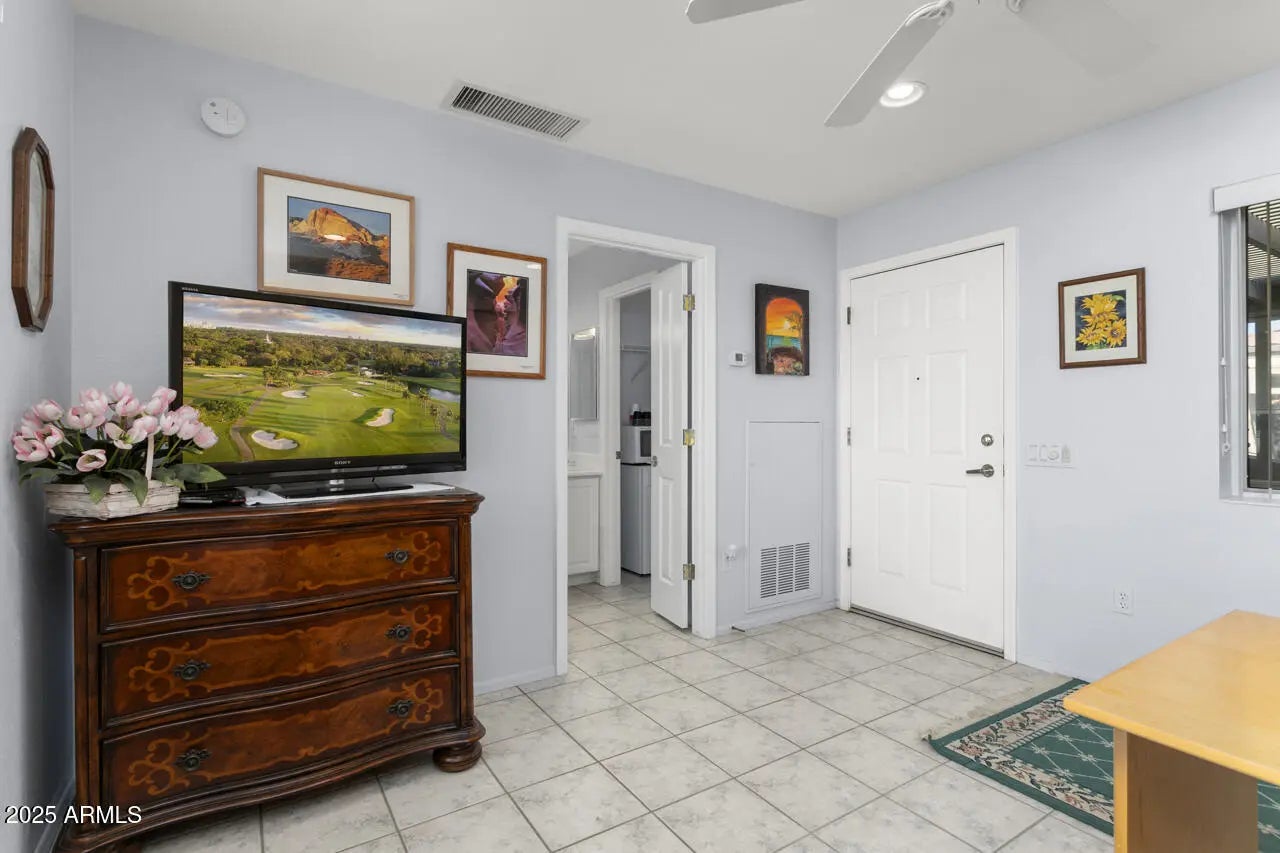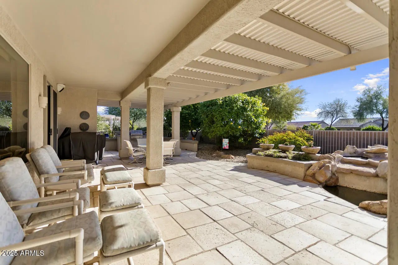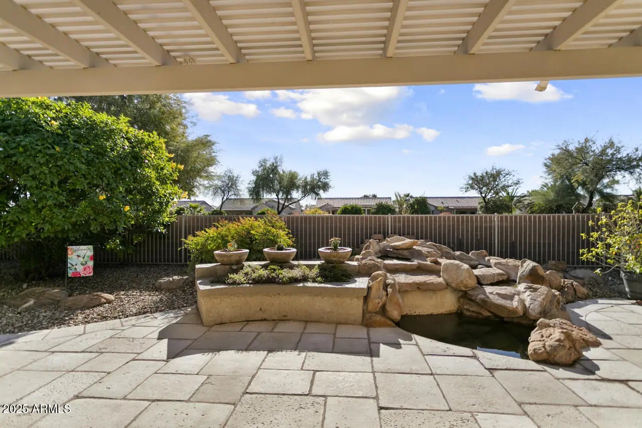 This popular Palo Verde offers great curb appeal with beautiful rock veneer and a Casita. The main house is 2 bedroom, 2 baths with a den. The den includes built-ins with drawers and a desk, perfect for an office or hobbies. The casita has a Murphy bed, offering that 3rd bedroom and bath, as a private guest retreat. Interior highlights include tile throughout, newer toilets, recirculation pump and a soft water system. The kitchen has an RO system, stainless LG appliances, including a newer refrigerator and a bay window for added dining space. The bay window in the primary suite adds space and lots of light. The ensuite bath is complete with a Jacuzzi tub and shower, and a walk-in closet with organizer system. A new roof (2025) and newer HVAC (2018) provide peace of mind. The laundry room was converted into a workroom with a small freezer. The washer and dryer are now located in the full 3-Car garage, complete with utility sink and cabinets for extra storage. Outdoor living is ideal with an extended patio and built-in BBQ. Patio slider has a new security door. Exterior of the home was painted approximately 4 years ago.