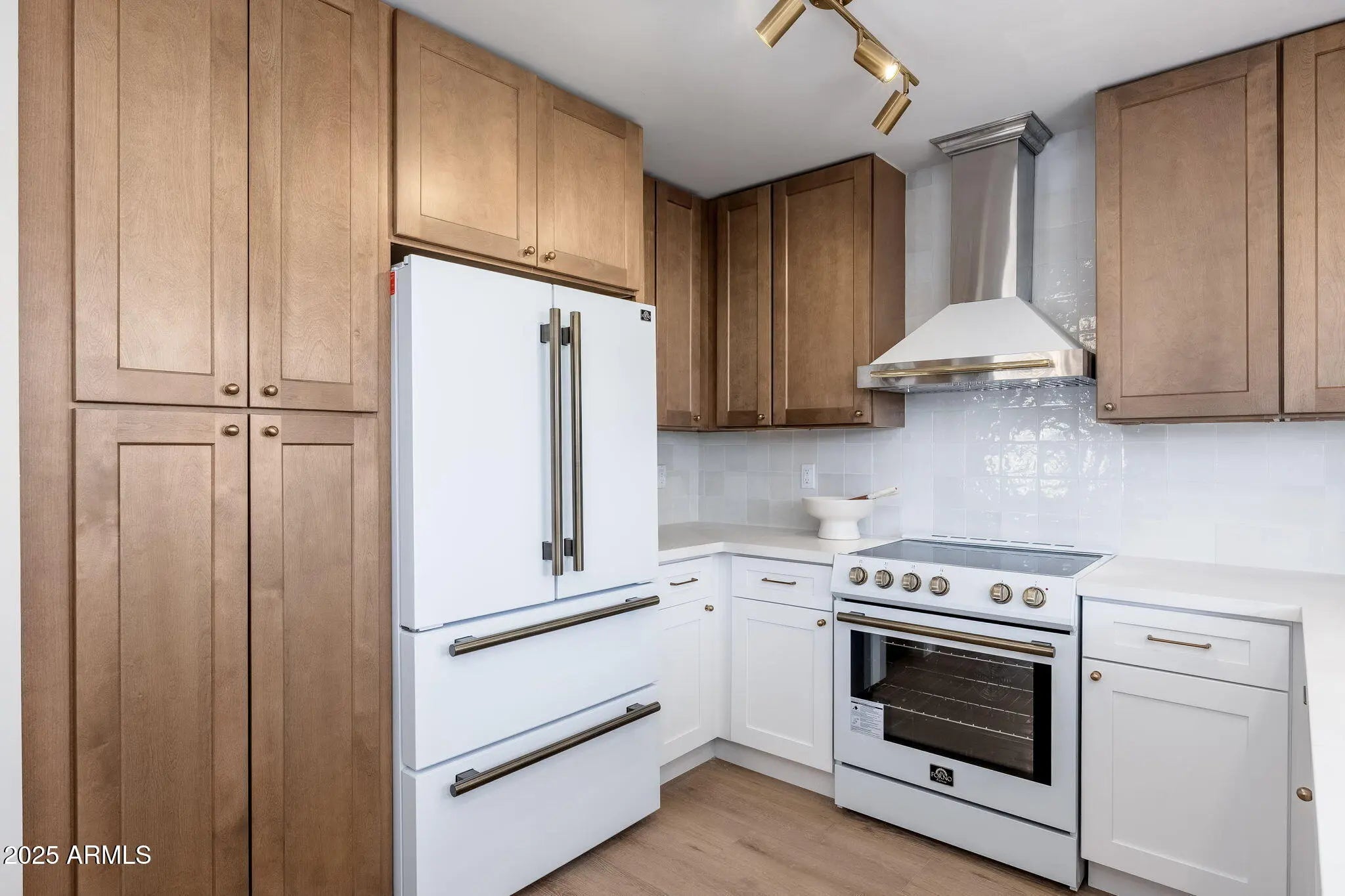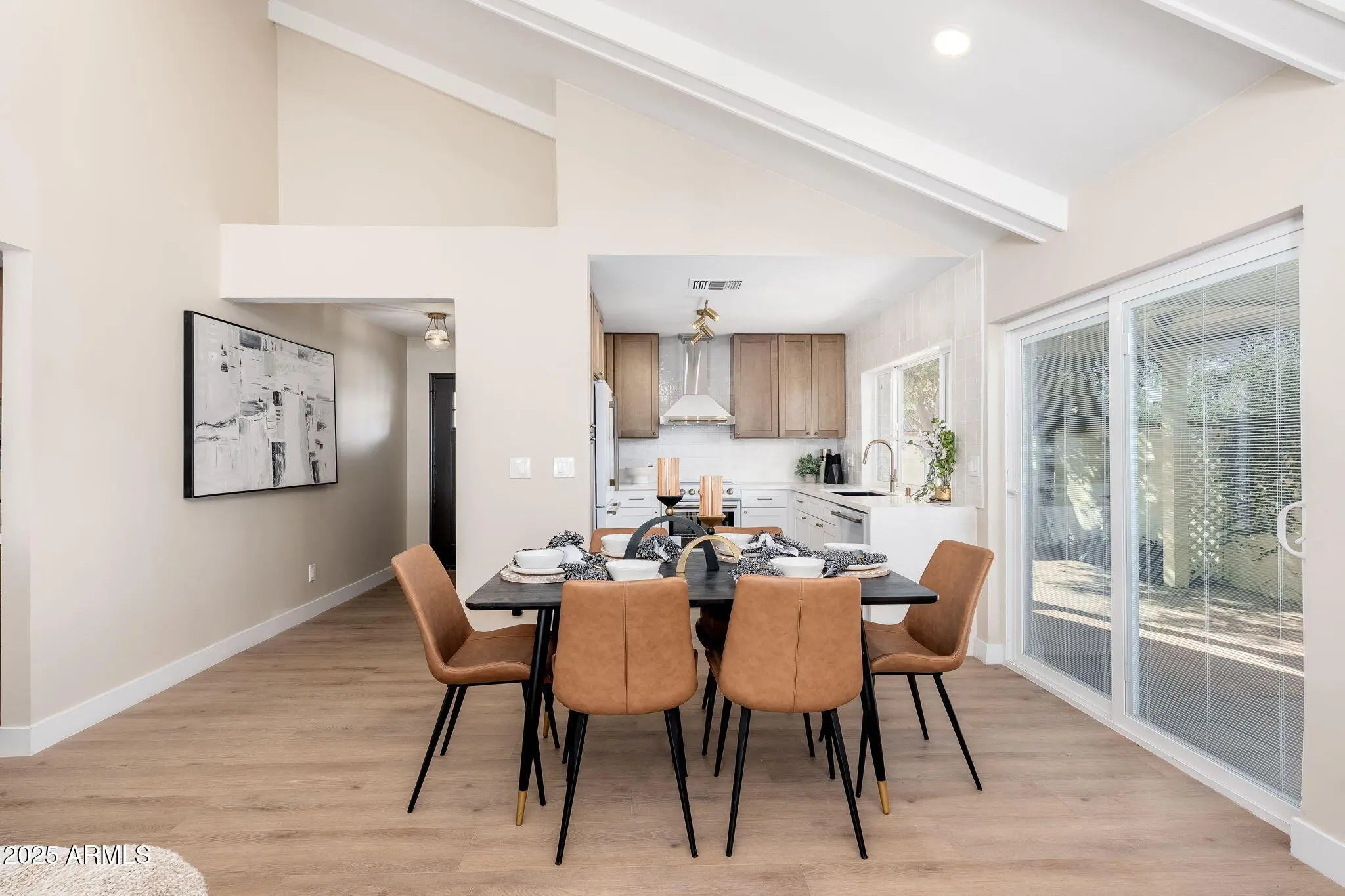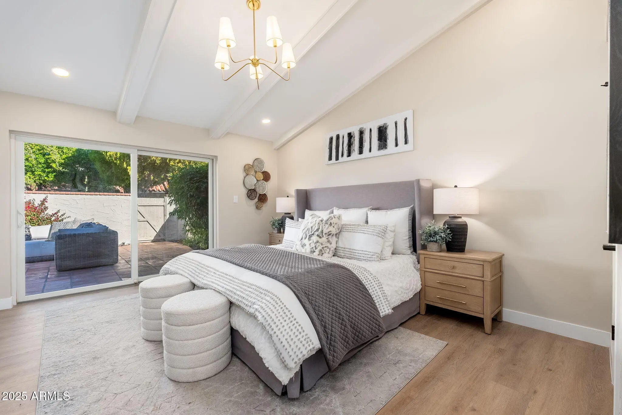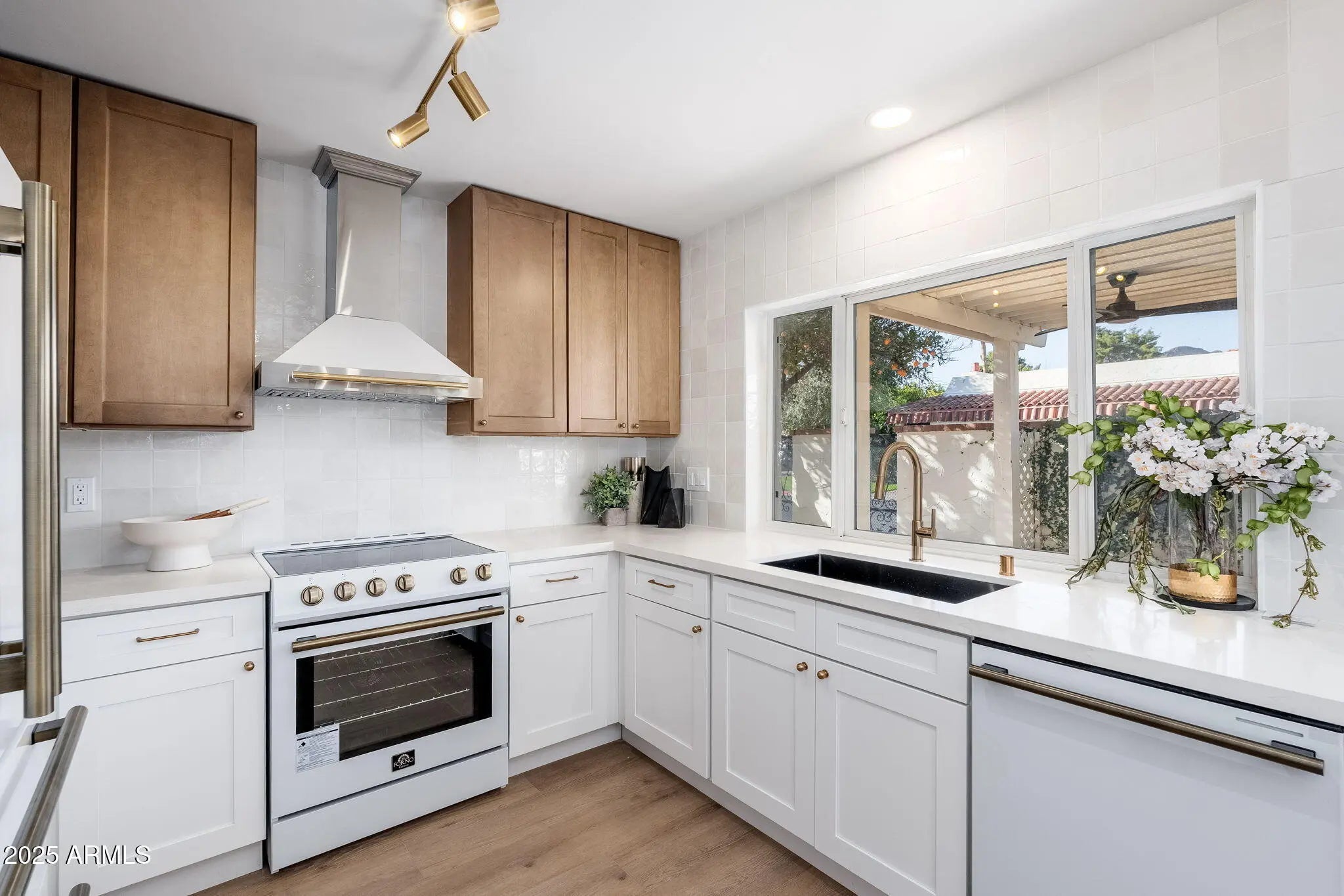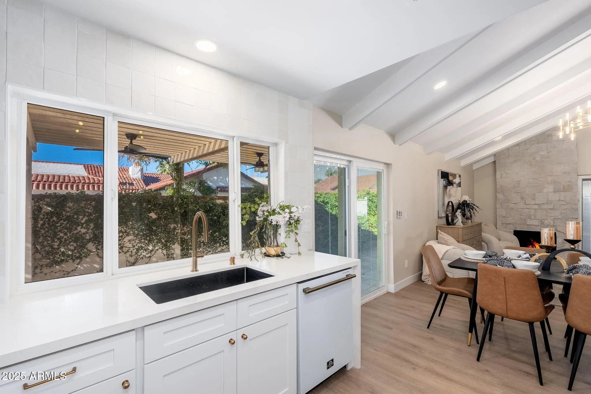 Beautifully remodeled single-story townhouse situated on a desirable corner lot, showcasing premium finishes and contemporary design throughout. The fully updated kitchen features brand-new shaker cabinets, Forno appliances, quartz countertops, and an elegant tile backsplash. Vaulted ceilings and brand-new vinyl wood flooring create an airy, inviting ambiance in every room. The spa-like bathrooms are thoughtfully upgraded with high-end shower systems, framed mirrors, shower niches, and custom vanities. Outside, the private, courtyard-style backyard includes a covered patio and Spanish tile—perfect for relaxing or entertaining.