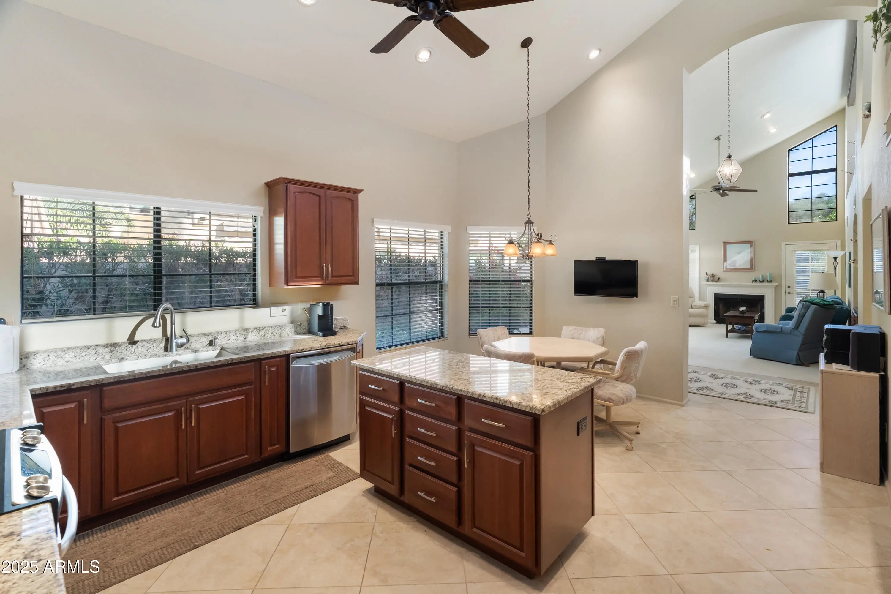 Charming 2 Bedroom 2 bath patio home that backs up to quiet lovely green space area. Soaring vaulted ceilings makes the1369 sq foot home feel very spacious. There is a fireplace in the living/family room, and a door to the quiet back patio. The kitchen has newer cabinets and granite counters with newer stainless steel appliances.