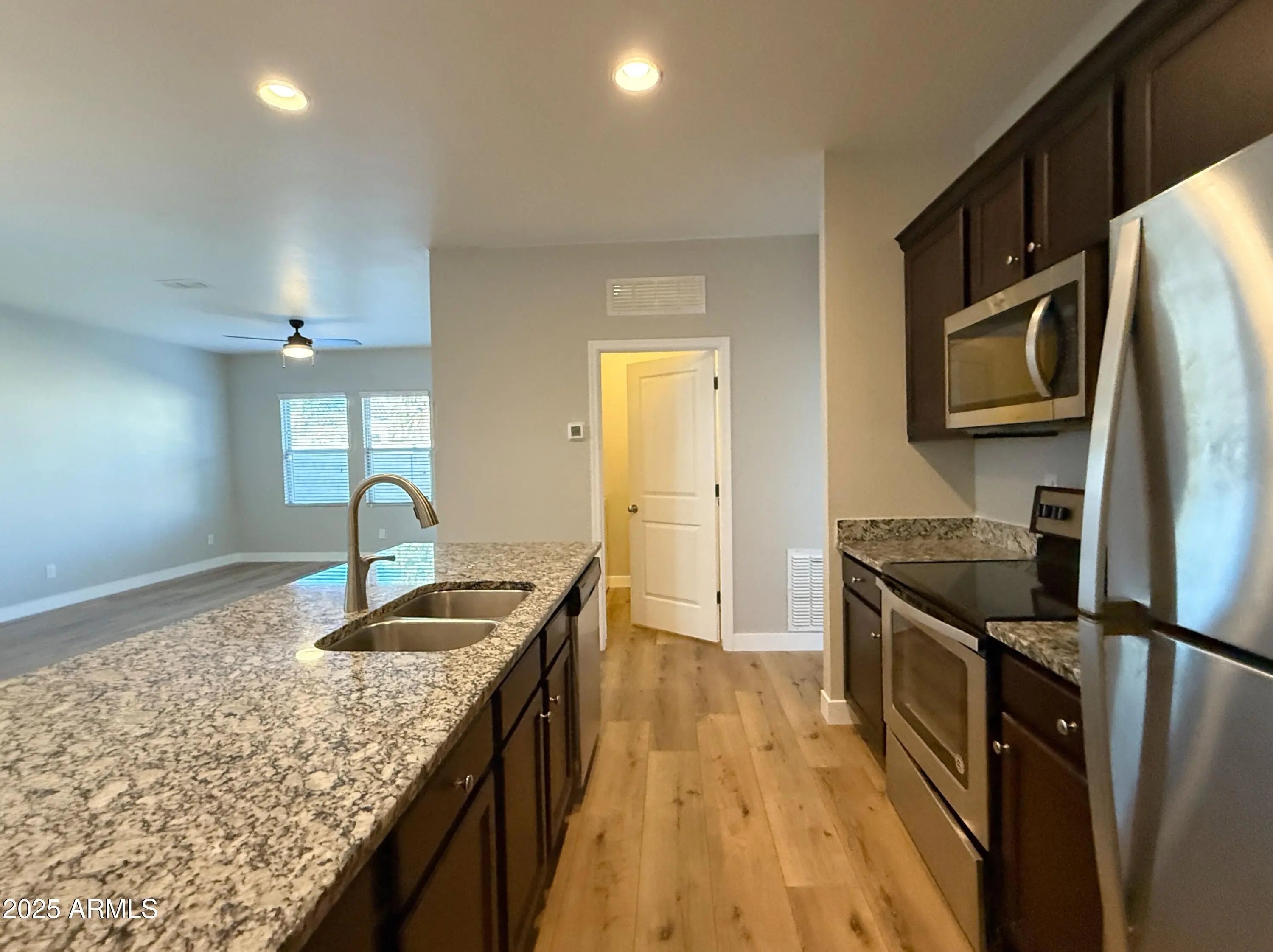 No Application Fees! Well-maintained 3 bedroom, 2 bathroom single level San Tan Valley home located in Rancho Bella Vista. This home features wood laminate flooring in all living and high traffic areas, upgraded baseboards, two-tone neutral paint, upgraded carpeting in each bedroom, 2'' faux wood window blinds, and ceiling fans in every room. The open living room offers great natural light and continues into the upgraded kitchen, which includes granite countertops and backsplash, upgraded cabinets with crown molding, a breakfast bar, separate pantry, and all stainless steel appliances. This split floor plan includes a larger primary suite with an extended walk-in closet and a private bathroom featuring an updated vanity and tiled shower. Washing machine and dryer are included. Two car garage provides ample parking and storage. Backyard features easy-to-maintain landscaping with covered patio, extended paver patio, and synthetic grass area. Rancho Bella Vista offers neighborhood parks, playgrounds, and greenbelt areas throughout the community. Conveniently located near shopping, dining, and everyday services at Ironwood and Bella Vista. Quick access to Hunt Highway provides easy commuting to Queen Creek, Chandler, and the Loop 202 corridor. All Denali Real Estate residents are automatically enrolled in the Resident Benefits Package (RBP) for $55.00/month which includes Renter's Liability Insurance, Credit Building to help boost the resident's credit scores with timely rent payments, up to $1M Identity Theft Protection, HVAC air filter delivery (for applicable properties), our best-in-class resident rewards program, and much more!