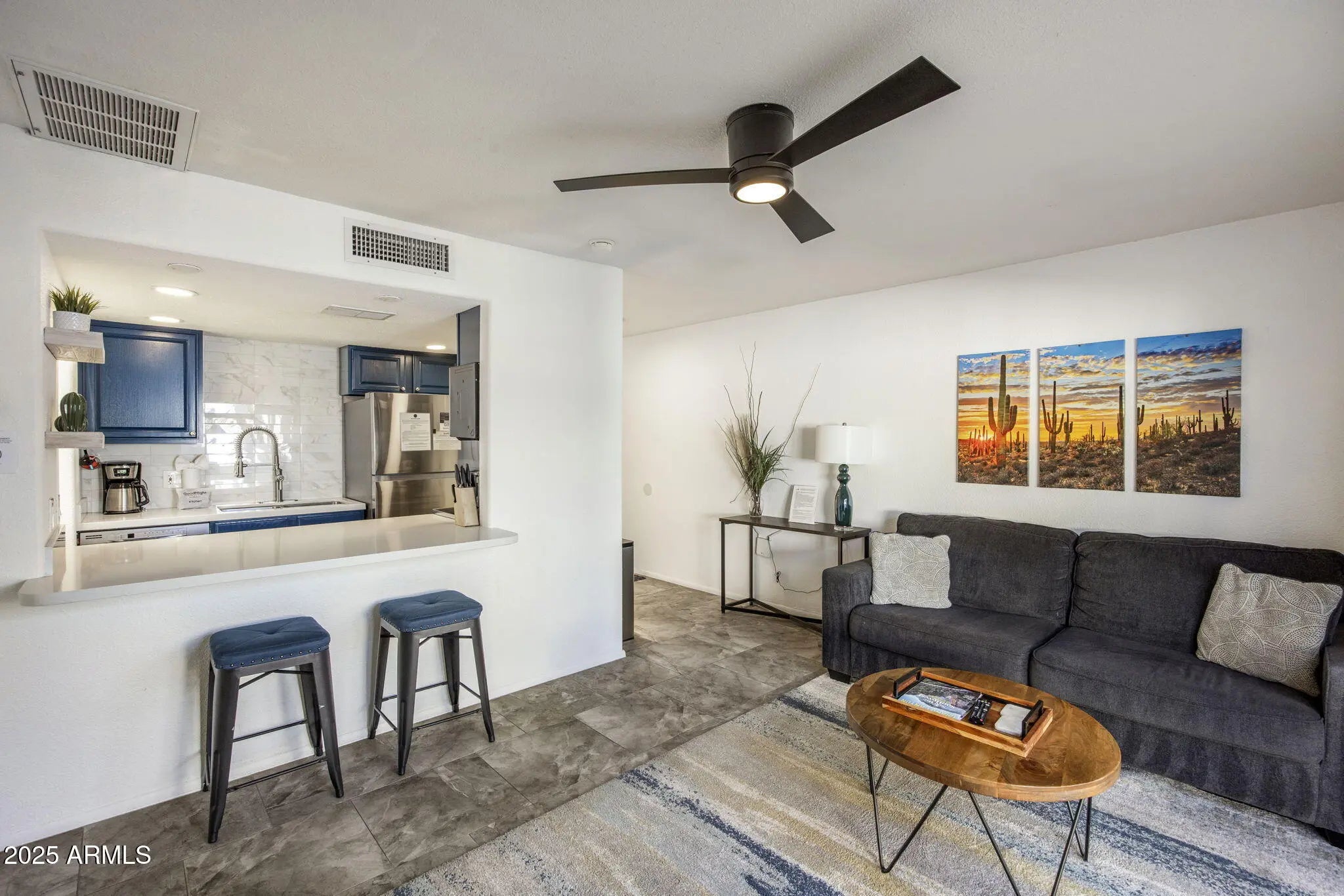 Private ground-floor unit in an excellent Old Town Scottsdale location. The interior features large-format tile flooring throughout, dual-pane sliding doors in the living room and bedroom, and many upgrades. The kitchen offers updated cabinetry, quartz counters and stainless steel appliances. The private backyard provides a comfortable outdoor space with pavers and room for dining or entertaining. The community includes a pool and spa. In-Unit washer and dryer included! HOA allows short-term rentals. Convenient access to Old Town, dining, shopping, entertainment, and the 101 freeway makes this an ideal full-time residence, second home, or investment property.