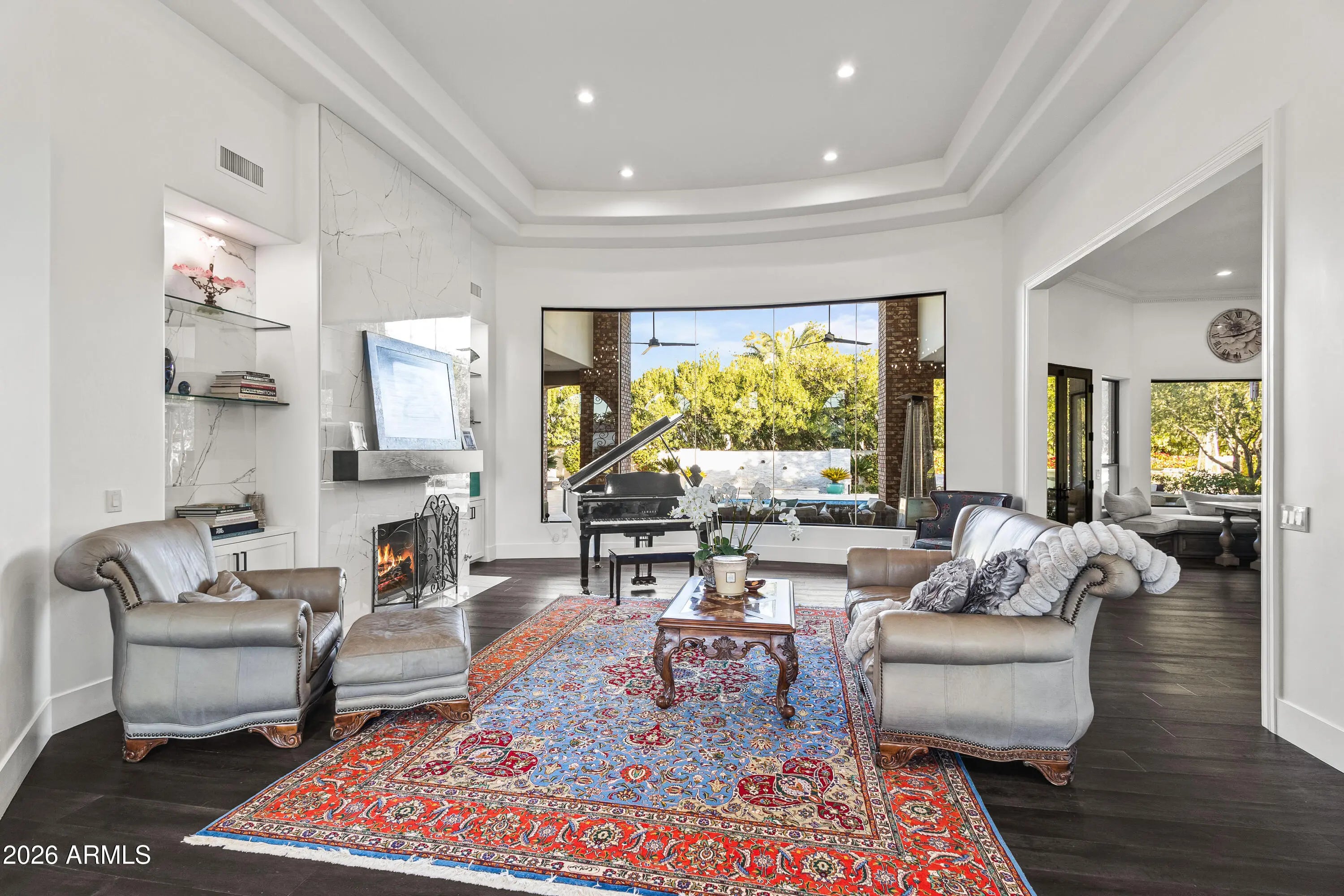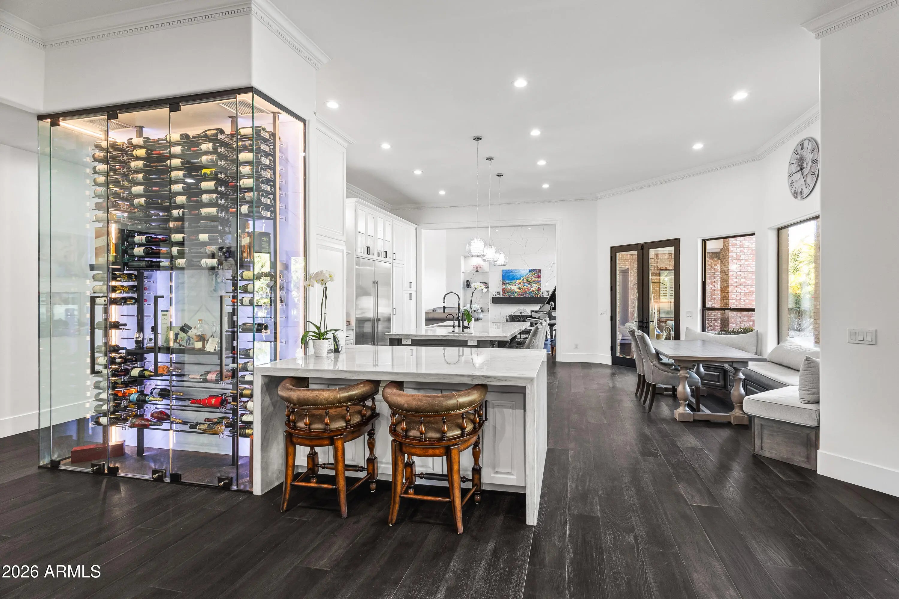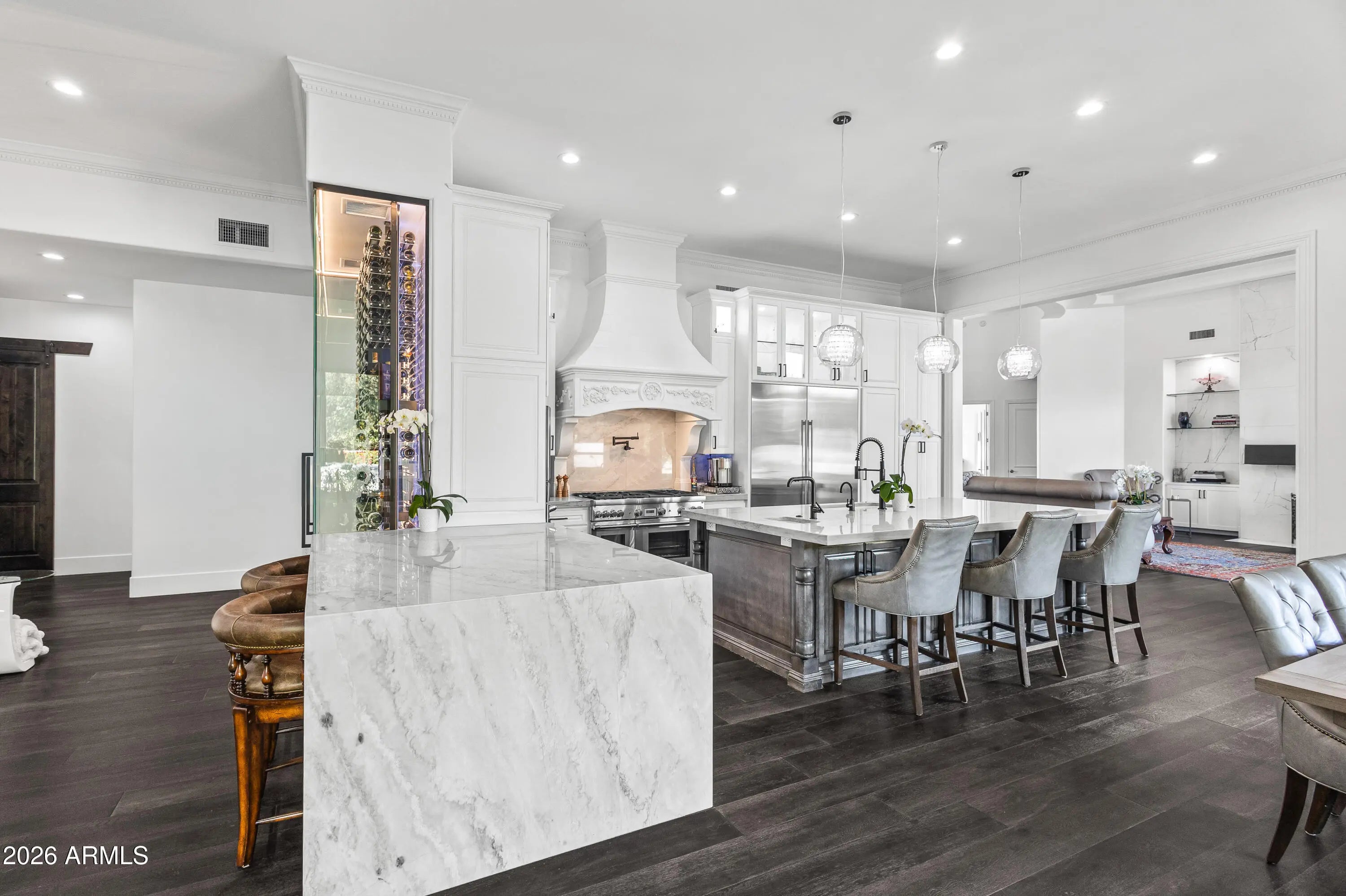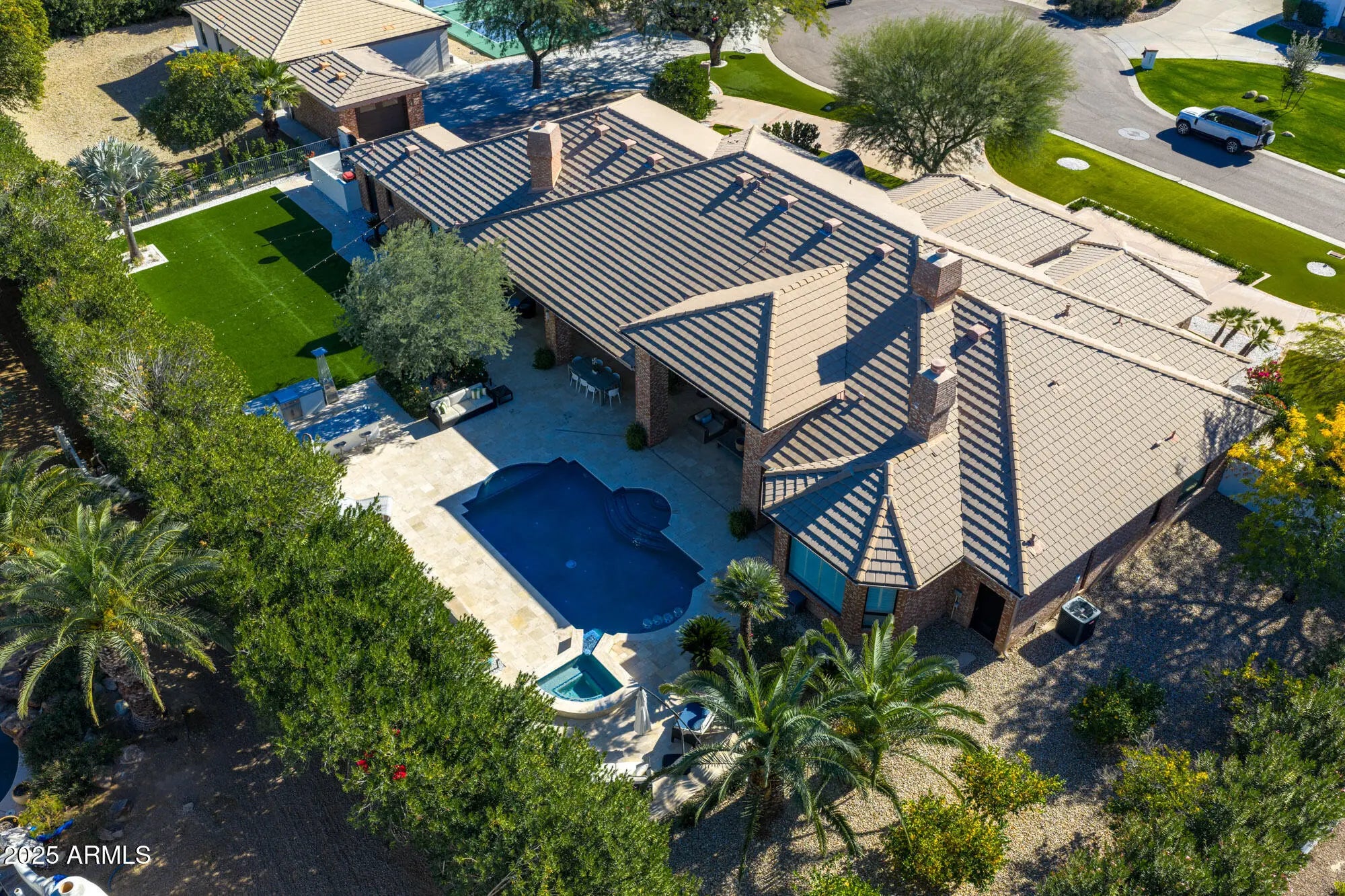 Situated on a quiet cul-de-sac in the heart of Paradise Valley, this exceptional estate presents a rare opportunity to own a highly versatile property in one of Arizona's most sought-after locations. The main residence features an open-concept design that seamlessly connects the family room, chef's kitchen, and formal dining area. Walls of glass sliders flood the home with natural light and create an effortless indoor-outdoor living experience. The chef's kitchen is thoughtfully appointed with a large island, breakfast nook, butler's pantry, and a striking glass, temperature-controlled wine room, ideal for both everyday living and entertaining. The primary suite serves as a private retreat, complete with a fireplace, dedicated den, spa-inspired bath with dual vanities, oversized shower, separate soaking tub, and a generous walk-in closet. Multiple bonus rooms provide exceptional flexibility for a playroom, home gym, or private office, in addition to a separate living room. A separate guest house offers outstanding versatility for multi-generational living or extended guest stays. It includes two bedrooms, a full kitchen, dining and living areas, laundry, a walk-in closet, and its own private garagedelivering comfort and privacy. Enjoy mountain views from the resort-style backyard, which enhances the main home with a heated pool and spa, water feature, built-in BBQ with island, and ample space for entertaining. A dedicated sport court features a basketball hoop and pickleball setup for year-round recreation. Additional highlights include a three-car garage for the main home and a thoughtfully designed layout that balances elegance, functionality, and privacy. Ideally located near top resorts and spas, championship golf, fine dining, and premier shopping.