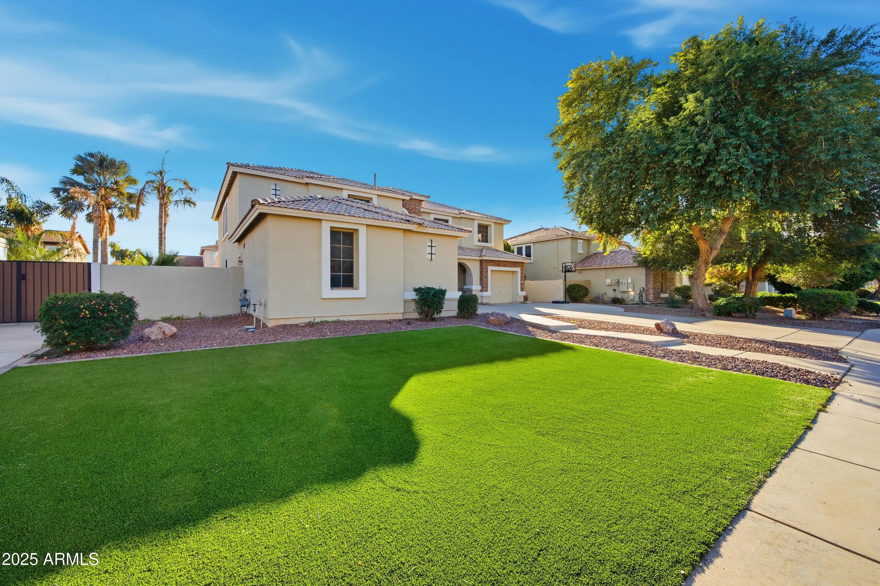 Prime Gilbert location in the highly desirable Allen Ranch community, situated on an oversized 11,000 sq ft lot with exceptional curb appeal. This beautifully maintained home offers 5 bedrooms, 3 bathrooms, and a 3-car garage, along with a sparkling private pool—perfect for Arizona living. The backyard is an entertainer's dream, featuring a full-length covered patio, outdoor fireplace, and built-in BBQ, ideal for gatherings year-round. North-south exposure and low-maintenance landscaping with artificial turf in both the front and backyard make this property practical and inviting. Inside, the home boasts a thoughtful and versatile layout with both formal living and family rooms, 9-foot ceilings, and a formal dining area that can easily function as a home office. The kitchen showcases upgraded white shaker cabinetry, granite countertops, stainless steel appliances (including refrigerator), and opens seamlessly to the family room with a cozy gas fireplace. A downstairs bedroom with a full bath provides the perfect setup for guests or multigenerational living. Upstairs, you'll find a spacious loft, three additional guest bedrooms, and a stunning primary suite featuring a large bedroom, dual vanities, upgraded tile flooring, a self-trimming soaking tub with floor-mounted tub filler, and a large tiled walk-in shower. Fantastic location near top-rated schools, parks, dining, and shoppingthis is Gilbert living at its best.