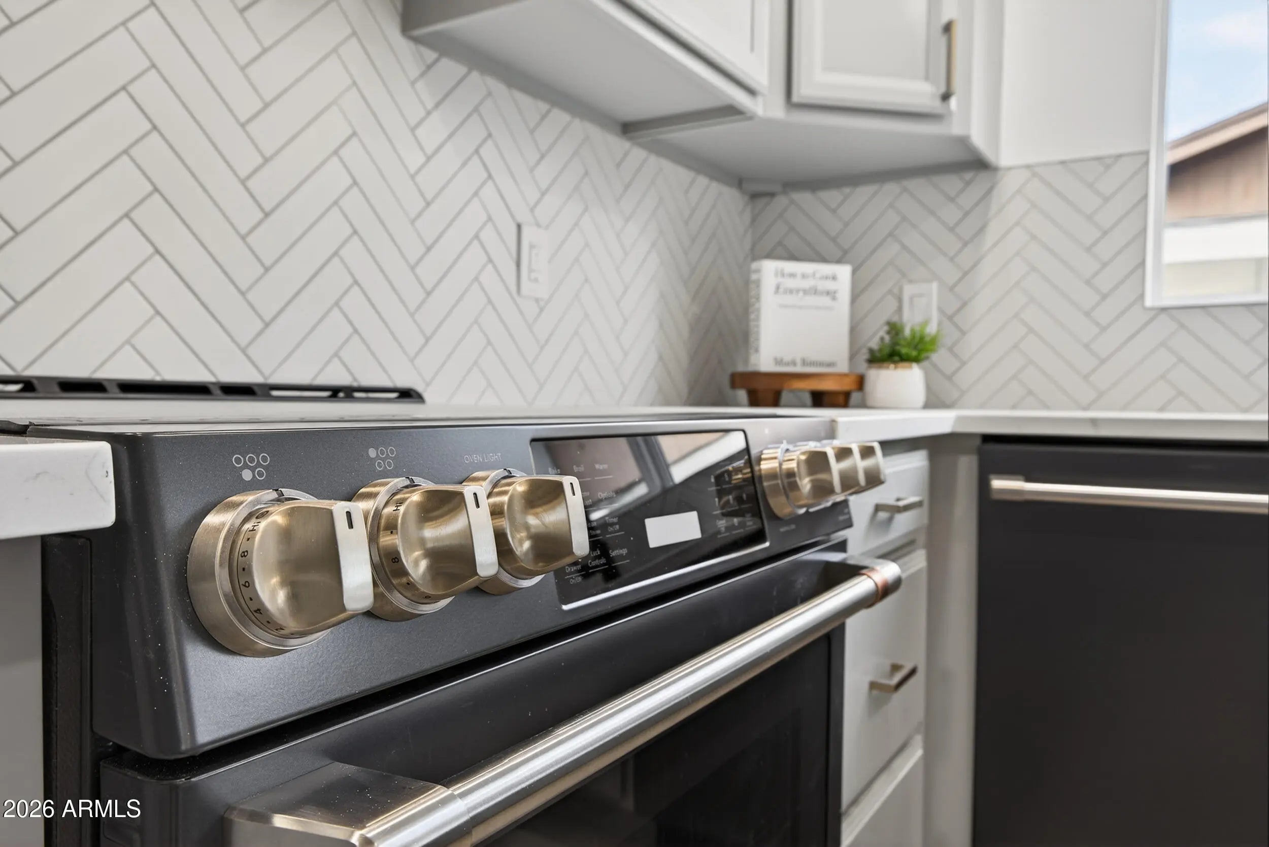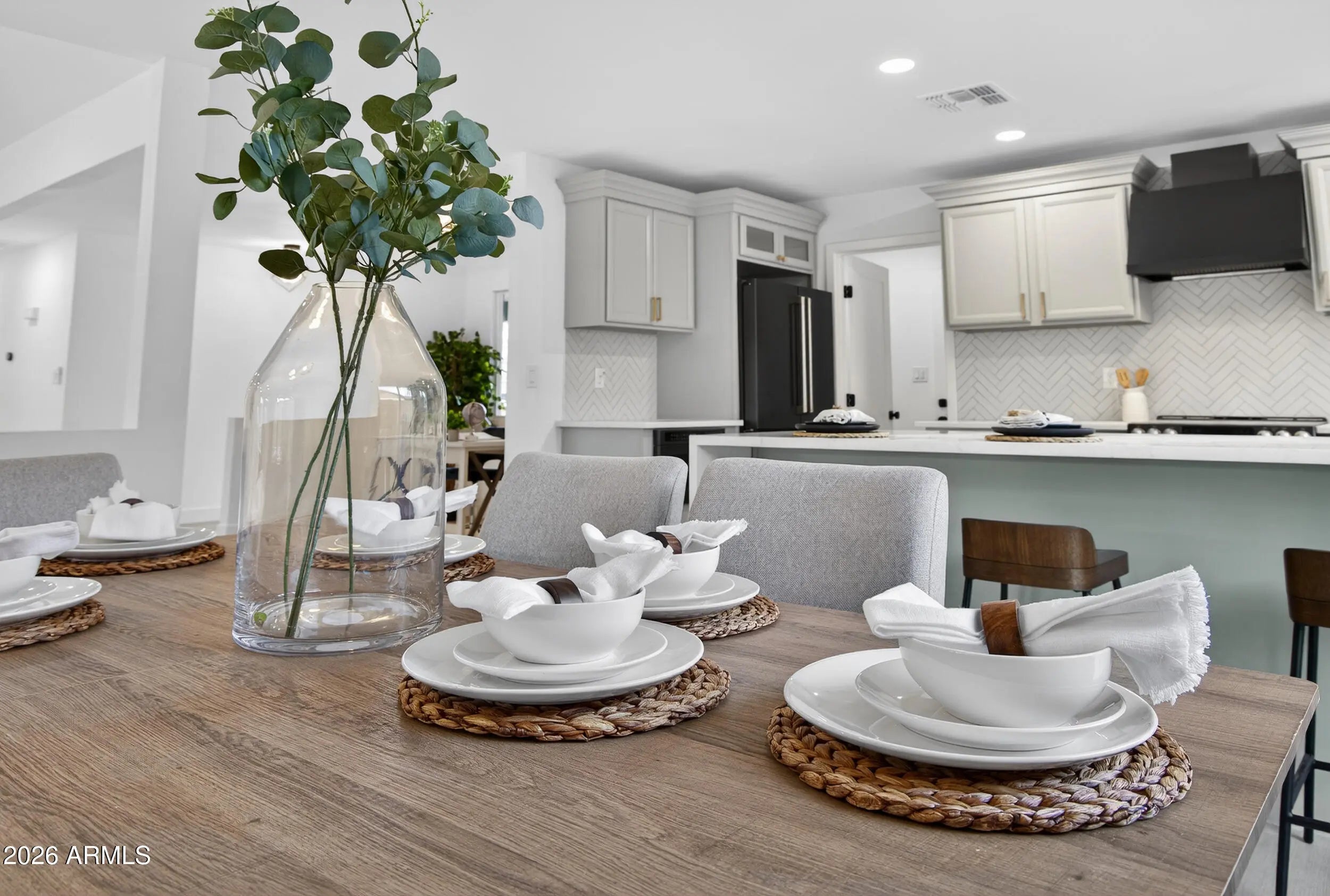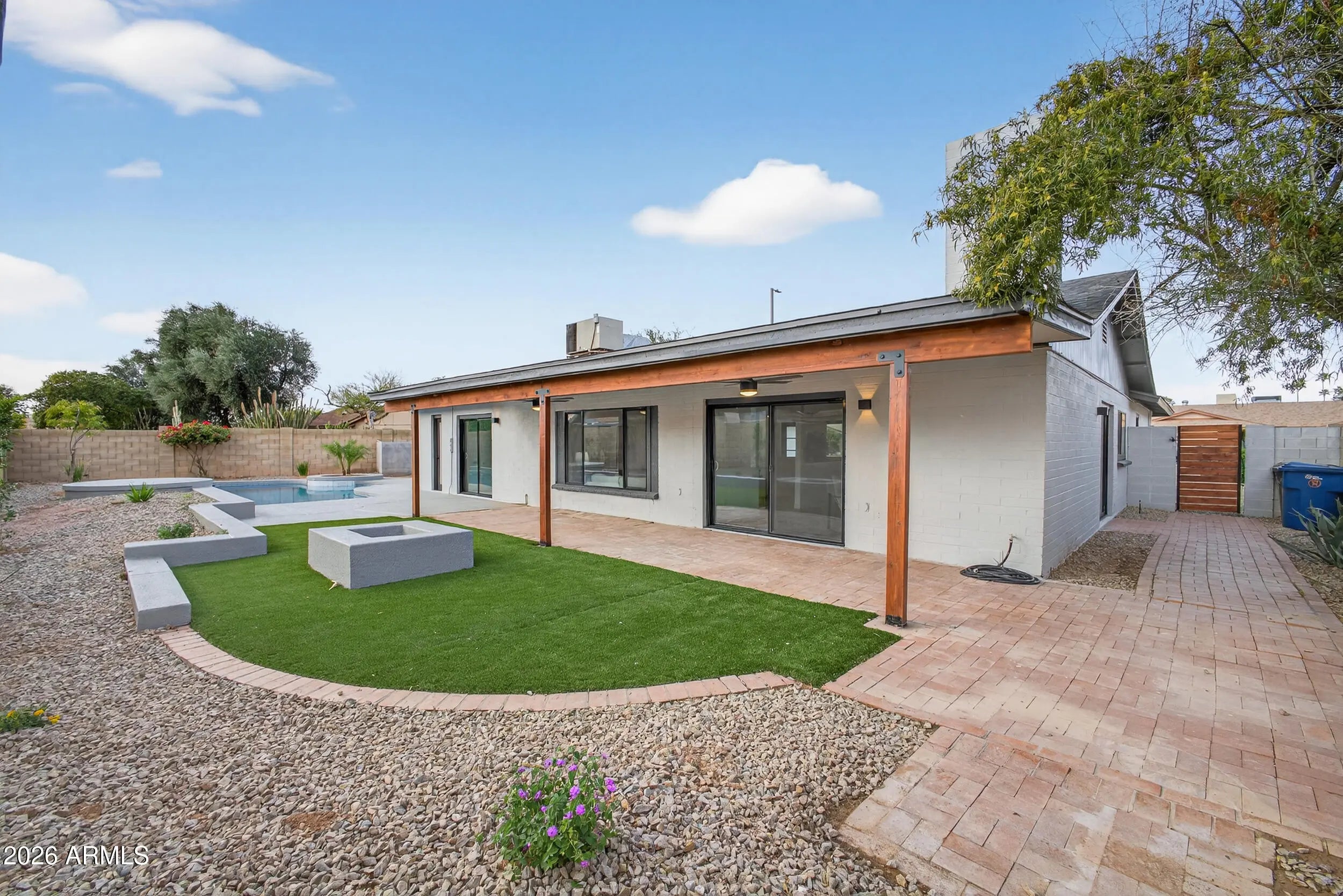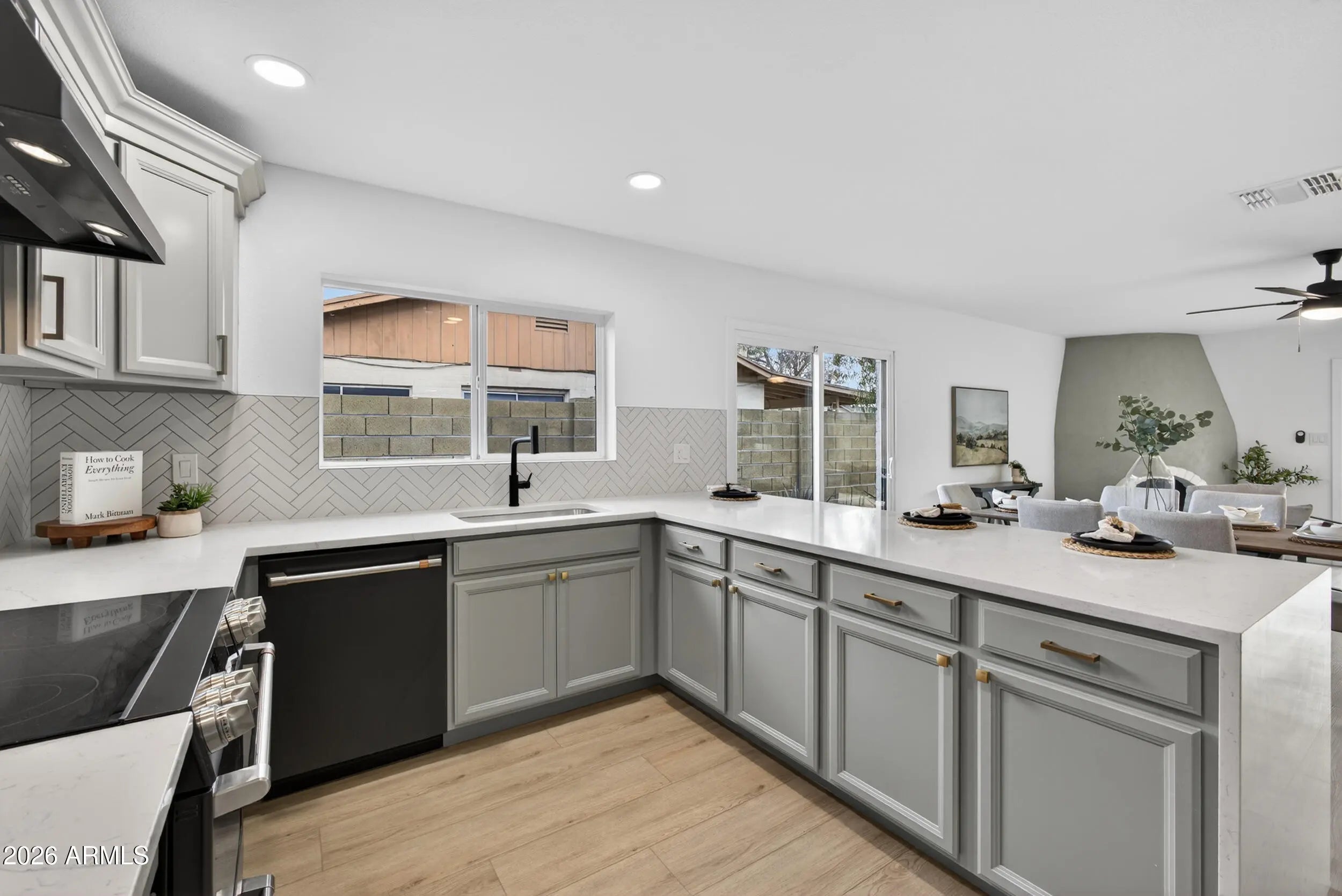 Re-imagined architecture and refined modern touches create a timeless, elevated vibe. Welcome to this gorgeously updated 3-bedroom, 2-bath residence with a stunning, light-filled open-concept design. The kitchen declares a statement, featuring a sophisticated palette, designer herringbone backsplash, solid-surface waterfall countertops, GE Café appliances, soft-close custom cabinetry, a walk-in pantry, and a generous breakfast bar. Wood-style plank flooring flows seamlessly throughout. Step outside to a private, resort-style backyard with an extended covered patio, crystal-blue pool, new turf, fire pit, and ceiling fans. Location is everything, with easy access to dining, shopping, freeways, and the airport—set within one of Mesa's most sought-after master-planned golf communities.