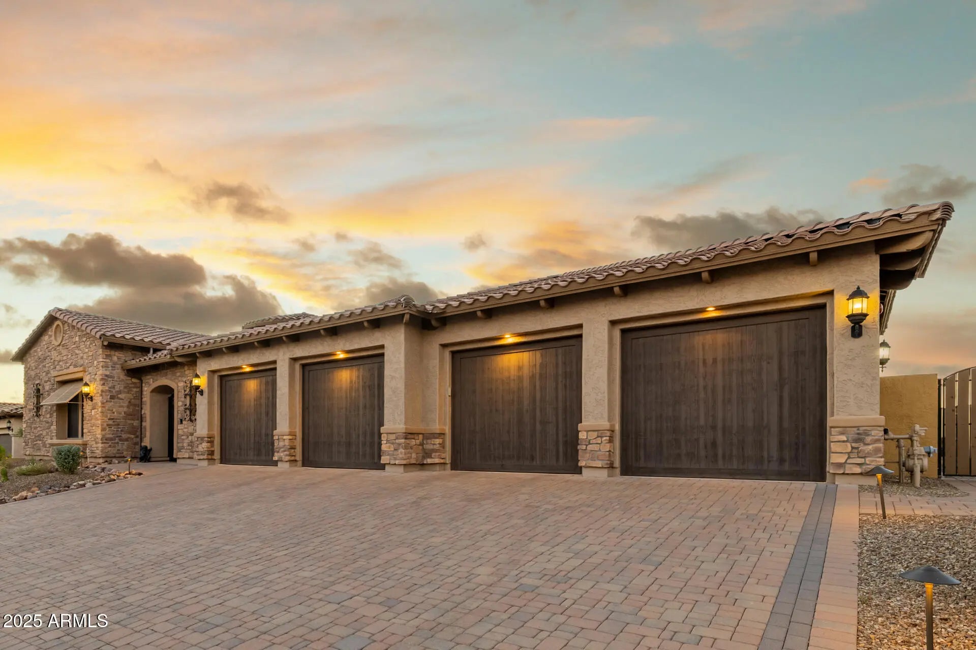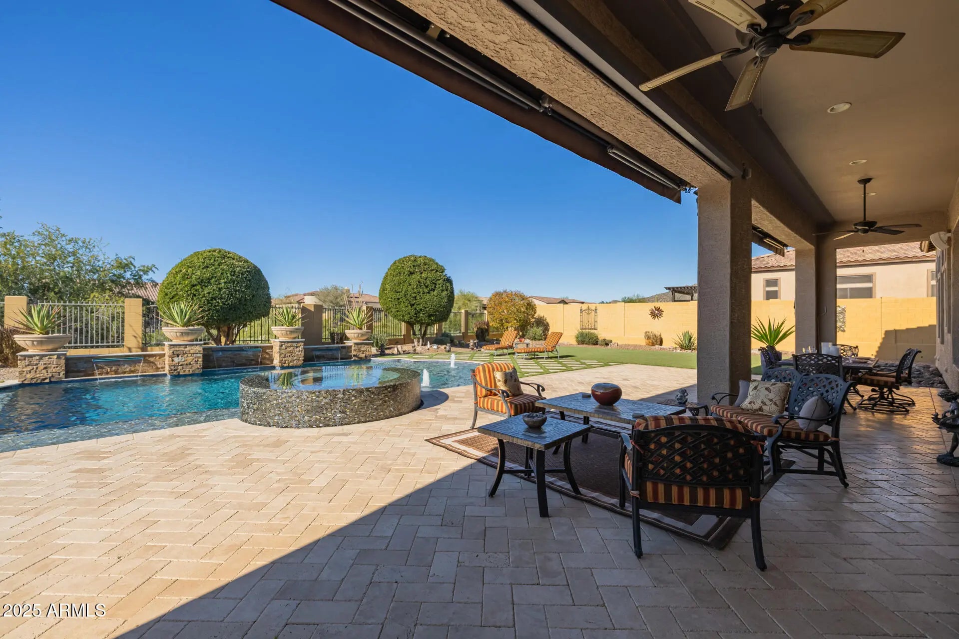 This single-level residence features 4 ensuite bedrooms, 4.5 baths, 12-foot ceilings, plantation shutters & designer finishes. Every detail of this home reflects quality, pride of ownership & timeless sophistication. Move-in ready with fresh paint in neutral-toned colors providing turn-key elegance. Set on a large premium lot backing to an open wash area, this property offers privacy, mountain views, and sunsets. A resort-style backyard designed for entertaining & fun, with a telescoping glass wall, electric blinds, & an extended covered patio with sunshades. Lounge by the unique heated tile pool with water features and a raised tiled heated spa. Travertine decking with turf inlay design, gas fire pit, and built-in kitchen BBQ complete this entertainer's outdoor oasis. Car enthusiast will appreciate the oversized four-car dream garage with epoxy flooring with built-in cabinetry. Fresh professional landscaping sets the tone as you enter a custom iron gate & front door, private courtyard, and dramatic rotunda foyer. Off the foyer, an attached oversized casita or second owner's suite with a full bath and walk-in closet provides ideal space for guests, multi-generational living, or a game room. The dramatic great room features a custom-designed feature wall with floating shelves, large media area, and fireplace. The master bath is a spa-inspired sanctuary with two spacious walk-in closets. Located within an exclusive gated enclave of Riviera at Mountain Bridge, a prestigious master-planned community in Mesa. Residents enjoy resort-style amenities including a beautiful clubhouse, organized activities, heated pool, spa, fitness center, tennis and pickleball courts, and numerous parks and green spaces throughout the neighborhood. With the Tonto National Forest and Usery Mountain at your doorstep, you have instant access to the valley's best hiking and lakes, while being served by top-rated schools. Mountain Bridge offers the perfect blend of luxury, lifestyle, and location.