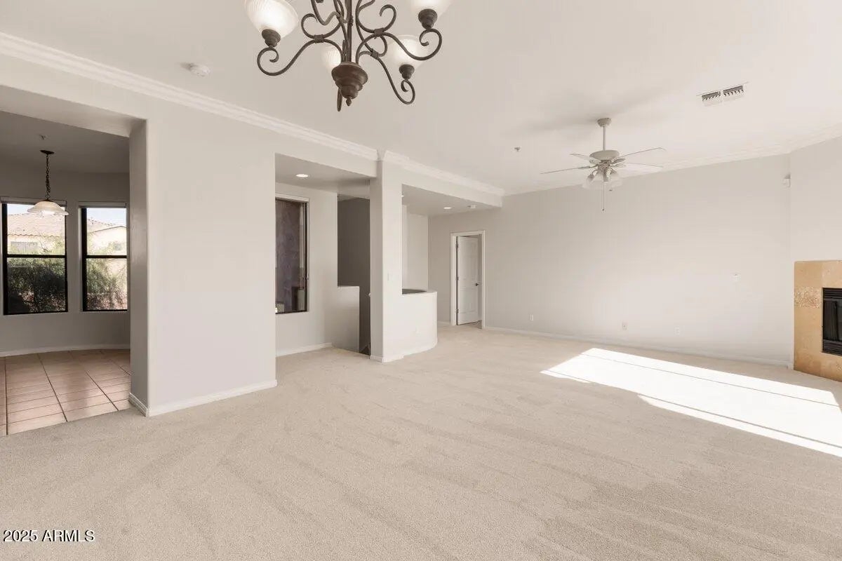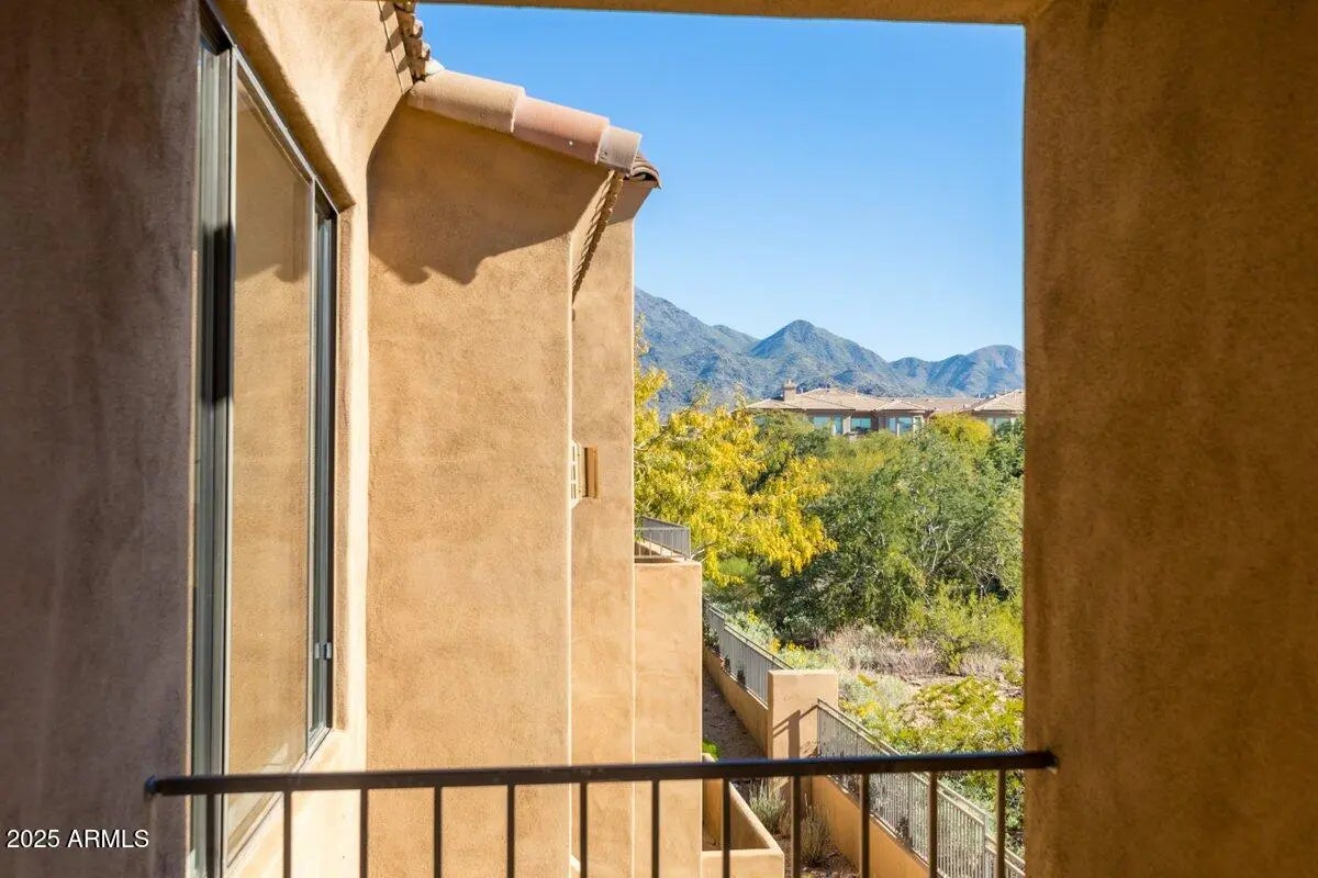 Beautifully updated 3 bedroom 2 bath condo in McDowell Mountain Ranch has all new interior paint with contrasting trim and crown moulding. Brand new plush carpeting just installed in this upper level split floorplan. Large kitchen with 42'' upper cabinets has tons of storage, counterspace and gorgeous Volcano granite countertops. Adjacent laundry room has been updated with granite, storage and a large sink. Large primary bedroom suite has granite countertops, a jetted tub and walk-in tiled steam shower. Enjoy morning coffee from your private balcony. Great room with gas fireplace and dining area enjoys south-facing views with covered balcony overlooking the desert wash and mountains and city light views. The community also offers a pool, spa, work out room and rec room and homeowners enjoy the privileges of McDowell Mountain Ranch with lap pool and spas, tennis and pickleball courts, playgrounds and miles of trails. This community is conveniently located next to McDowell Mountain Marketplace - walk to Basha's grocery store, seven different restaurants, vet clinic, UPS store and lots more!