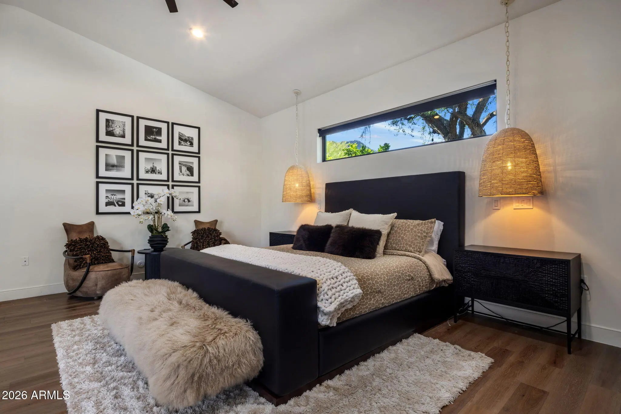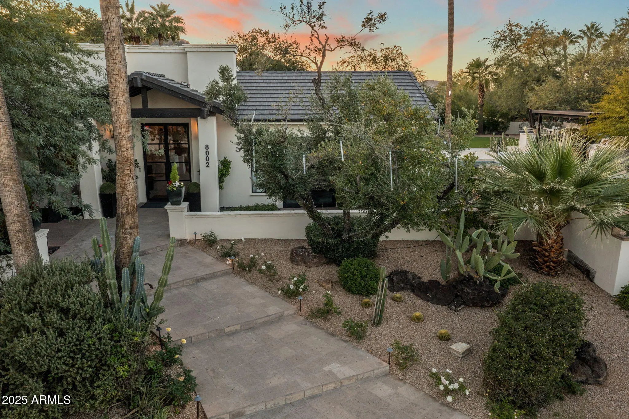 Stunning modern transitional estate on over an acre in one of Paradise Valley's most sought-after neighborhoods. Recently remodeled with exceptional attention to style and comfort, this 5-bedroom, 5.5-bath residence features soaring 12-foot ceilings, a dedicated large flex room, spacious den, and an open-concept kitchen and great room with a custom indoor outdoor bar. A dramatic wall of glass doors opens seamlessly to a resort-style pool and expansive outdoor living. Plenty of room to add garages or pickleball Nestled among mature trees the grounds offer a private outdoor pavilion with fireplace, intimate dining patio and fountain, and Mummy Mountain views. Designed to feel like a true retreat, this remarkable property blends elegance, space, and tranquility in a coveted PV settin