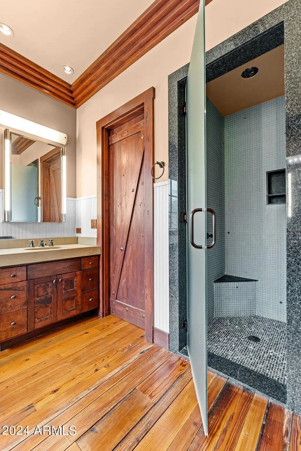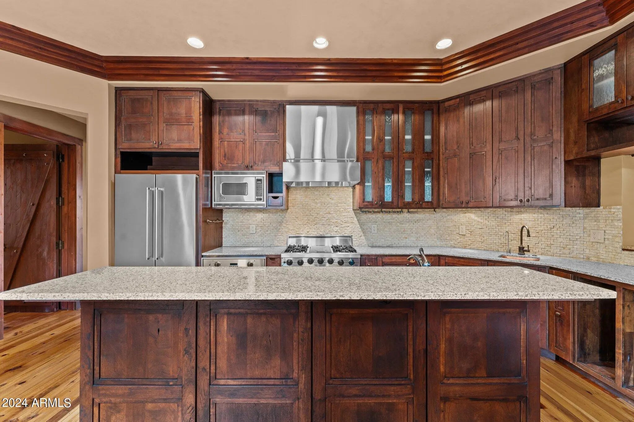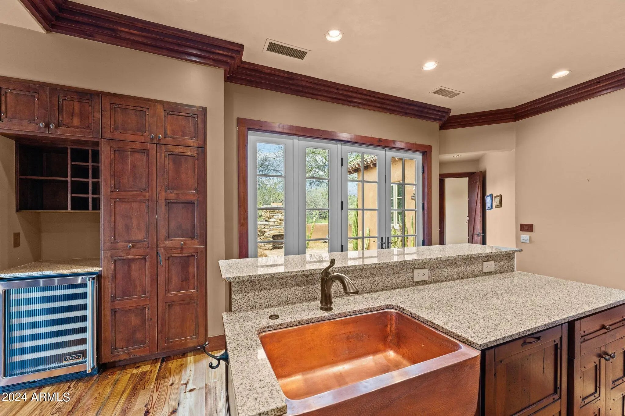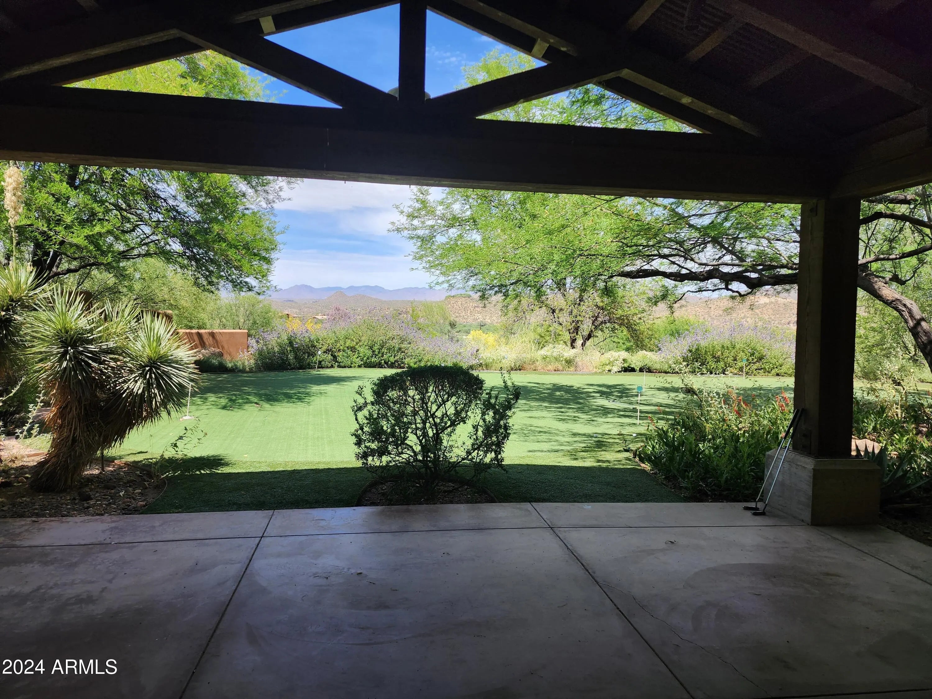 Beautiful high country luxury ranch villa in gated community! The interior is accented with crown molding throughout and custom solid mesquite doors. Kitchen features mesquite cabinets, antique pine floors, Viking appliances and granite countertops. The master suite has wainscoting, natural polished concrete countertops with dual vanities, and custom shelving in spacious master closet. Spacious guest casita with private entrance. Outdoor entertainment area includes multiple fireplaces, covered patios, and a large jacuzzi big enough for everyone!