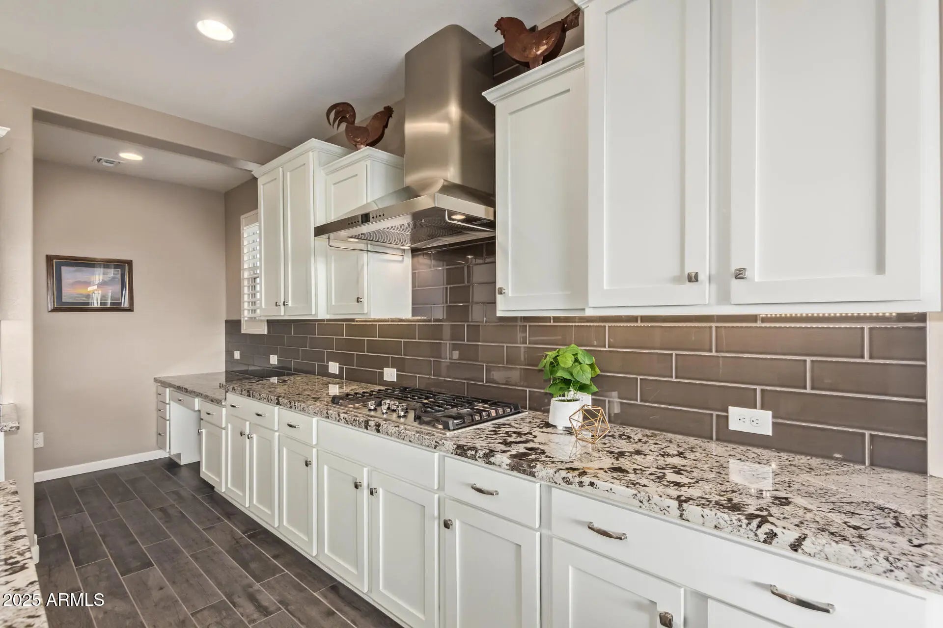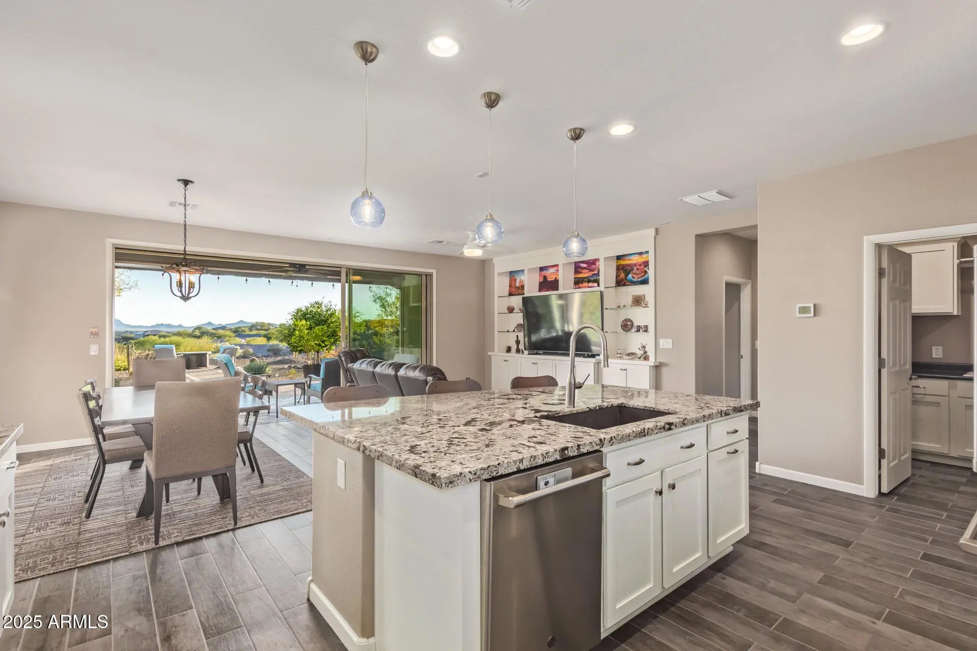 If you're looking for the BEST VIEWS - here they are!! This elevated Juniper model offers everything you've been dreaming of, featuring unobstructed views of iconic Vulture Peak and a lifestyle you will love! The thoughtfully designed split 2-bedroom floor plan showcases an open great room concept ideal for everyday living and entertaining, enhanced by custom built-in shelves and cabinets for both style and functionality. The kitchen is beautifully appointed with honed granite countertops, subway tile backsplash, upgraded cabinets, stainless steel appliances, a gas cooktop, large pantry, and an office nook. Expansive glass wall sliding doors open to a covered patio with a gas firepit, creating seamless indoor-outdoor living and the perfect setting to take in the breathtaking views. The primary suite features dual sinks, a tiled walk-in shower, and a spacious walk-in closet. Enjoy an exceptional community lifestyle with two championship golf courses, spa, pickleball, tennis, fine dining, a resort-style pool, and more! Hurry, this gem won't last!
