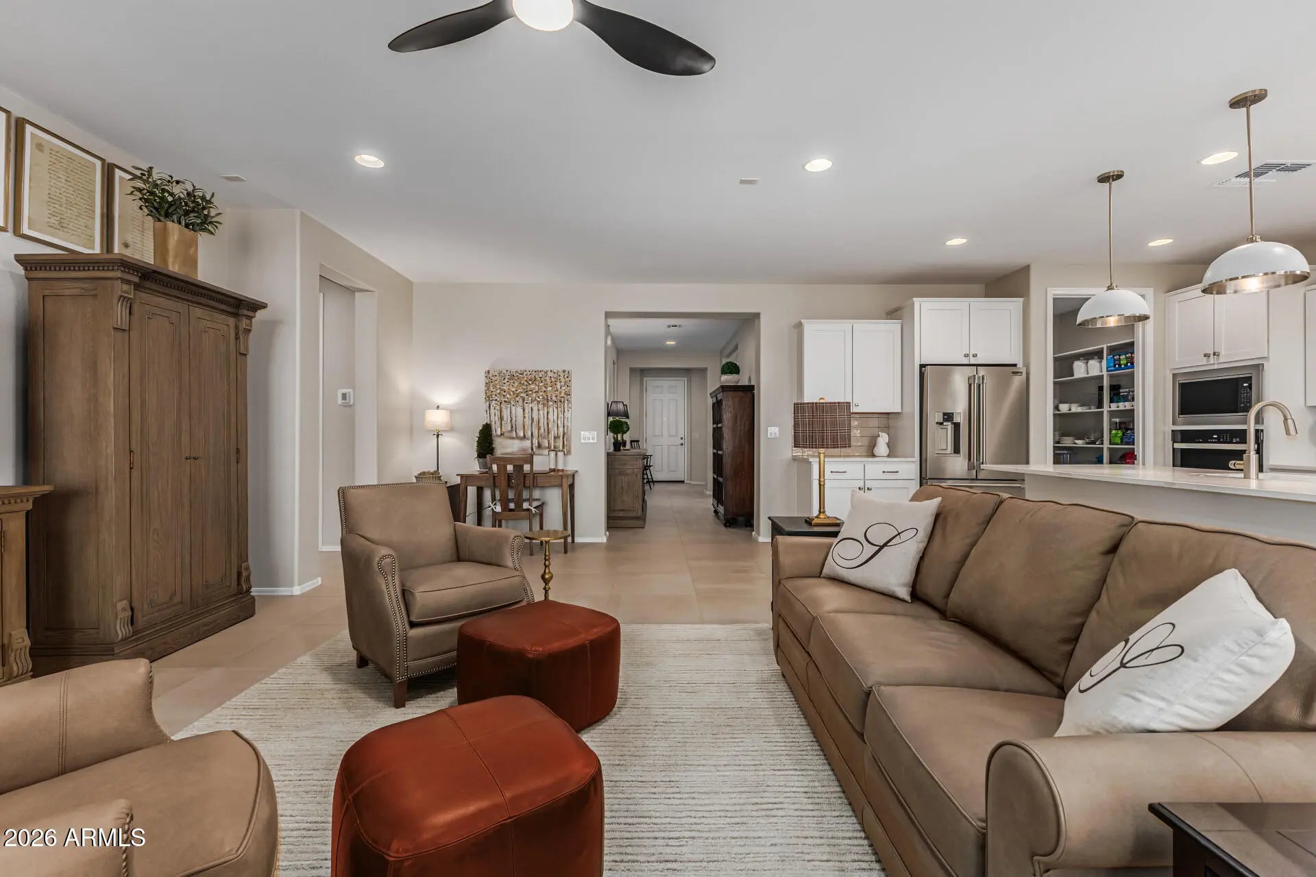 BUILT IN 2025 w/ $32K+ in ADDED SELLER UPGRADES-UNDER BLDR WARRANTY-LOW % ASSUMABLE VA LOAN! This stunning REFUGE is designed for comfort, convenience & modern living w/ tons of storage, 8' doors, 24'' custom tile & Plantation Shutters! Step into the bright & open kitchen w/ stainless appliances, quartz counters, glass tile backsplash, pendant lighting & spacious walk-in pantry, making the kitchen both functional & elegant! The home w/ it's desirable layout featuring private guest qtrs & versatile FLEX space- perfect for office, hobby room or 3rd BR! The primary bath features a roll-in shower, sleek quartz-top dbl vanity & ample walk in closet. Covered patio w/epoxy, fully landscaped & private yard! A 4' ext. garage w/epoxy floors & extra room completes this PRISTINE HOME! WHY WAIT 4 NEW? Sun City Anthem at Merrill Ranch offers a 48,000 SF recreation center w/ craft rooms for quilting, pottery, glass works, jewelry & crafts, spacious ballroom w/ stage for dancing, theatrical productions, concerts & more. PLUS full gym, work out rooms, indoor lap pool & spa, walking track, cafe area, card rooms, poker tables, pool table, ping pong table, business center, class room for interesting seminars! Troon Poston Butte Golf Course is one of the nicest in the area. Sun City offers Pickleball, Tennis, Bocce Ball, Horseshoes, Shuffleboard, clubs for all activities.......LIVE WHERE THE SURROUNDINGS DELIGHT, INSPIRE & CHALLENGE YOU!
