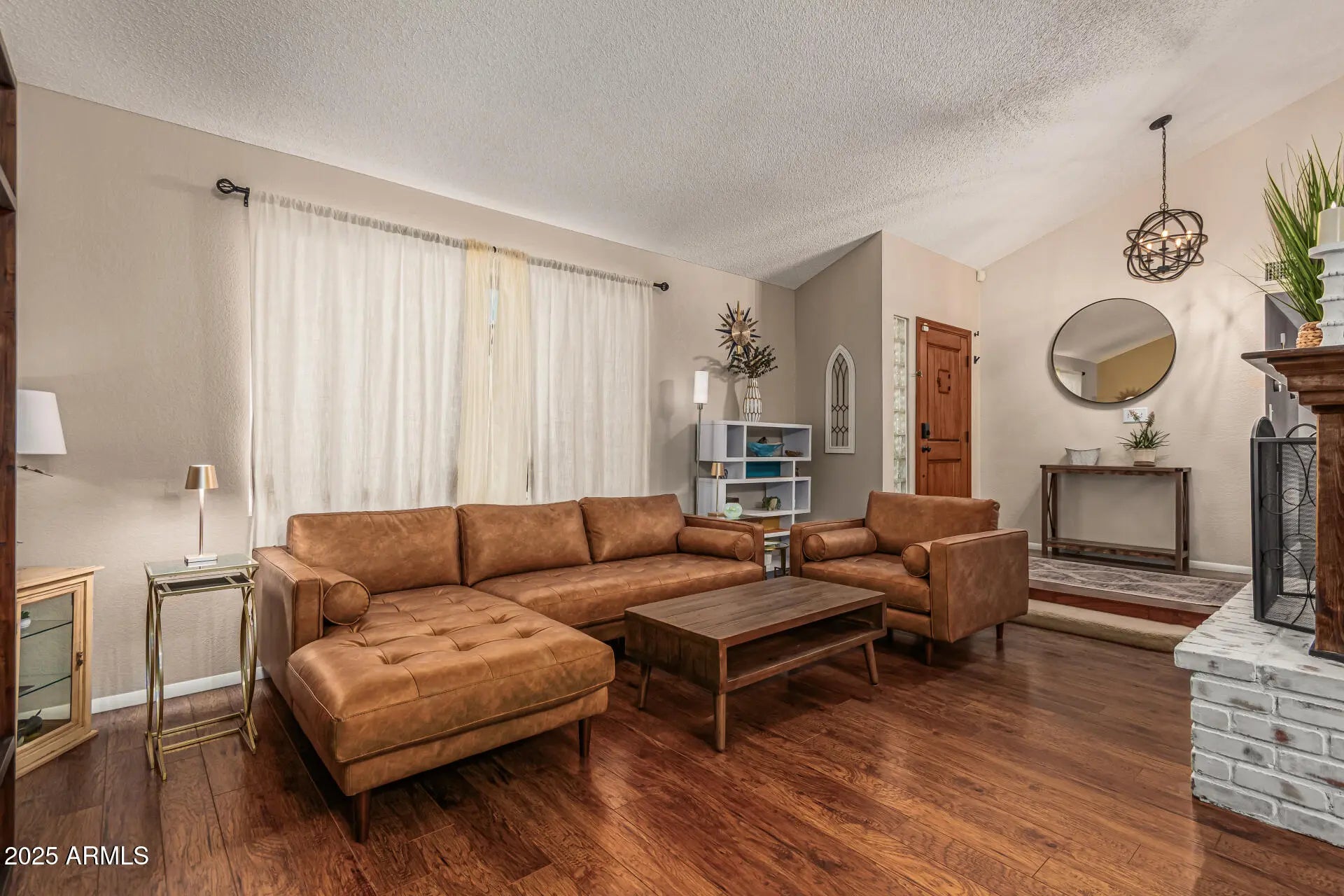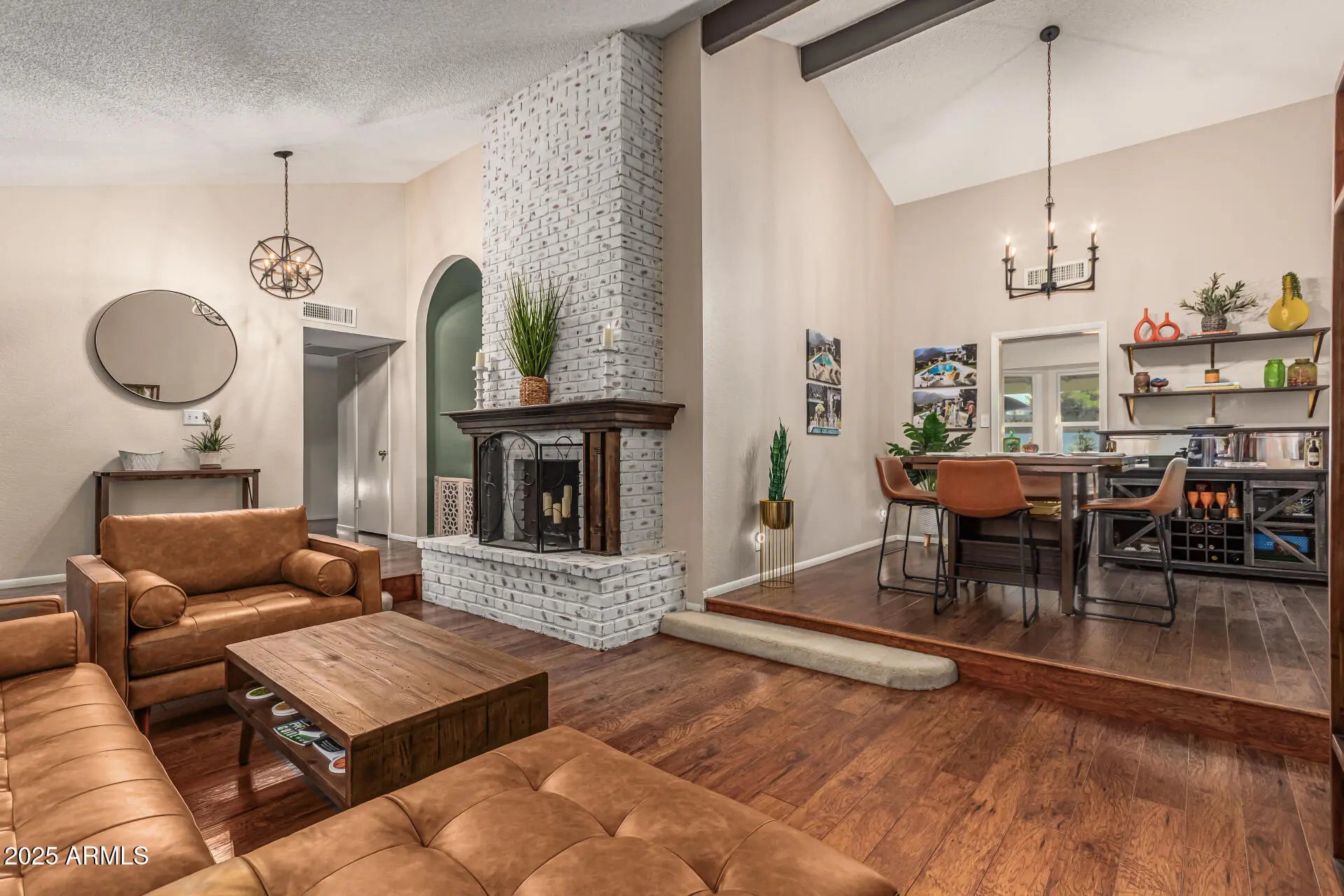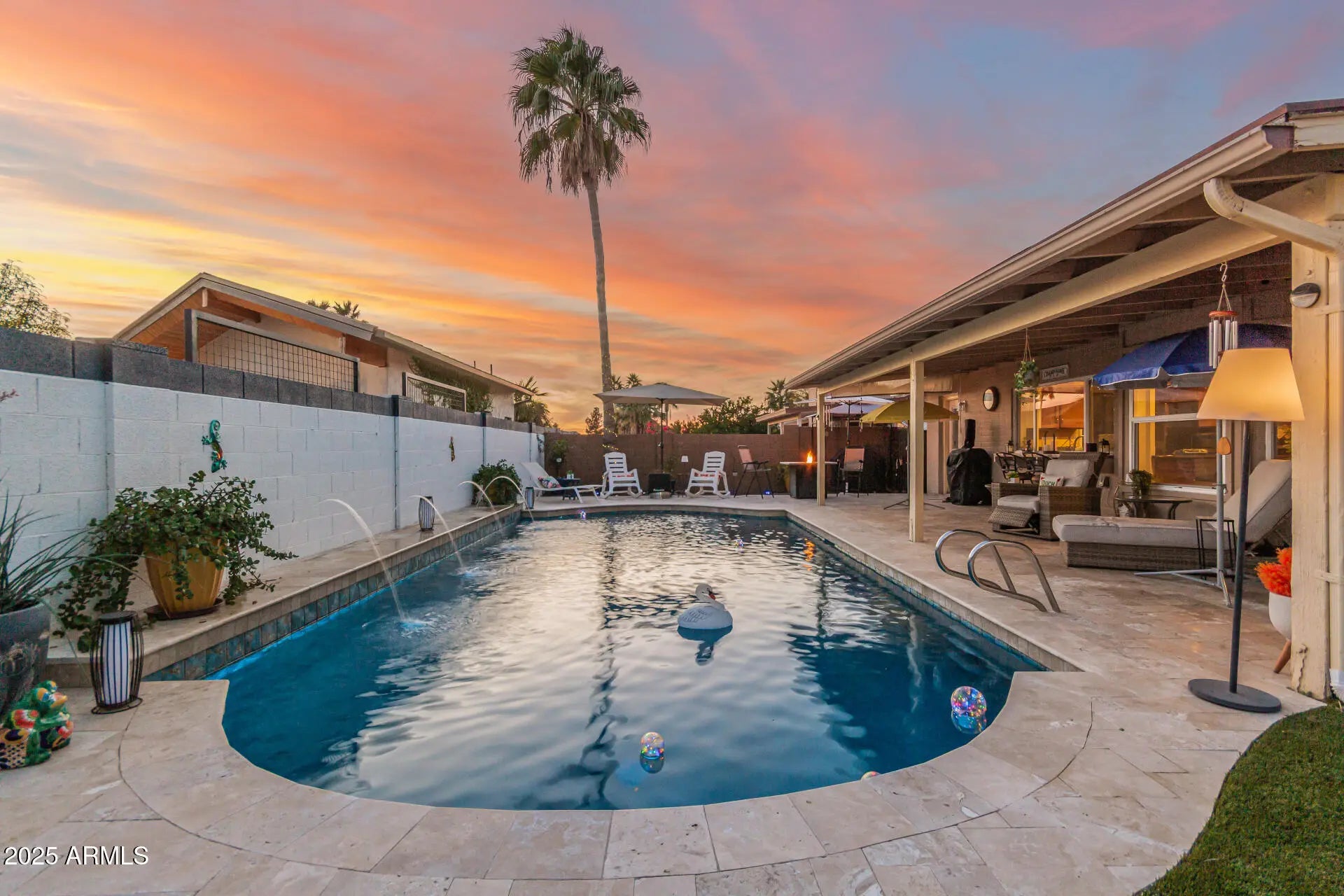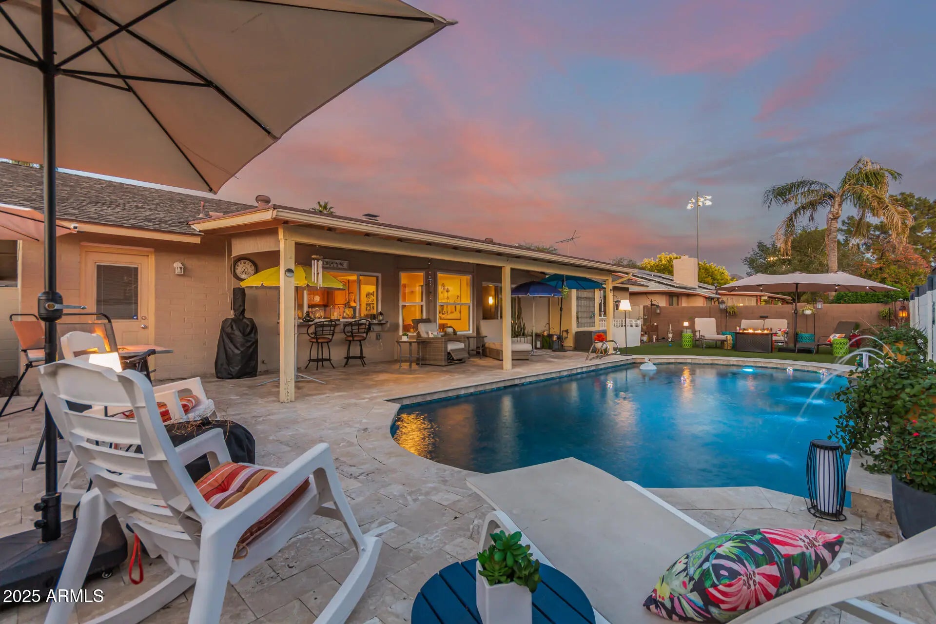 Palm Springs meets North Scottsdale in this Mid-Century Modern retreat. Single-level living with a sunken living room anchored by a double-sided fireplace featuring limewashed brick on one side & classic exposed brick on the other. Wall-to-wall hardwood floors, natural lighting, & fresh paint in every room. Major '24 upgrades include all-new windows, designer lighting, updated electrical & plumbing, new water heater, replaced refrigerator & washing machine, & a fully serviced HVAC system w/ added insulation for enhanced cooling efficiency. Resort-style backyard with artificial turf, new pool deck, PebbleTec finish, water feature jets, updated tile, LED pool lighting, & a covered patio. New water softener. Both bathrooms have been fully renovated. Located next to an elementary school.