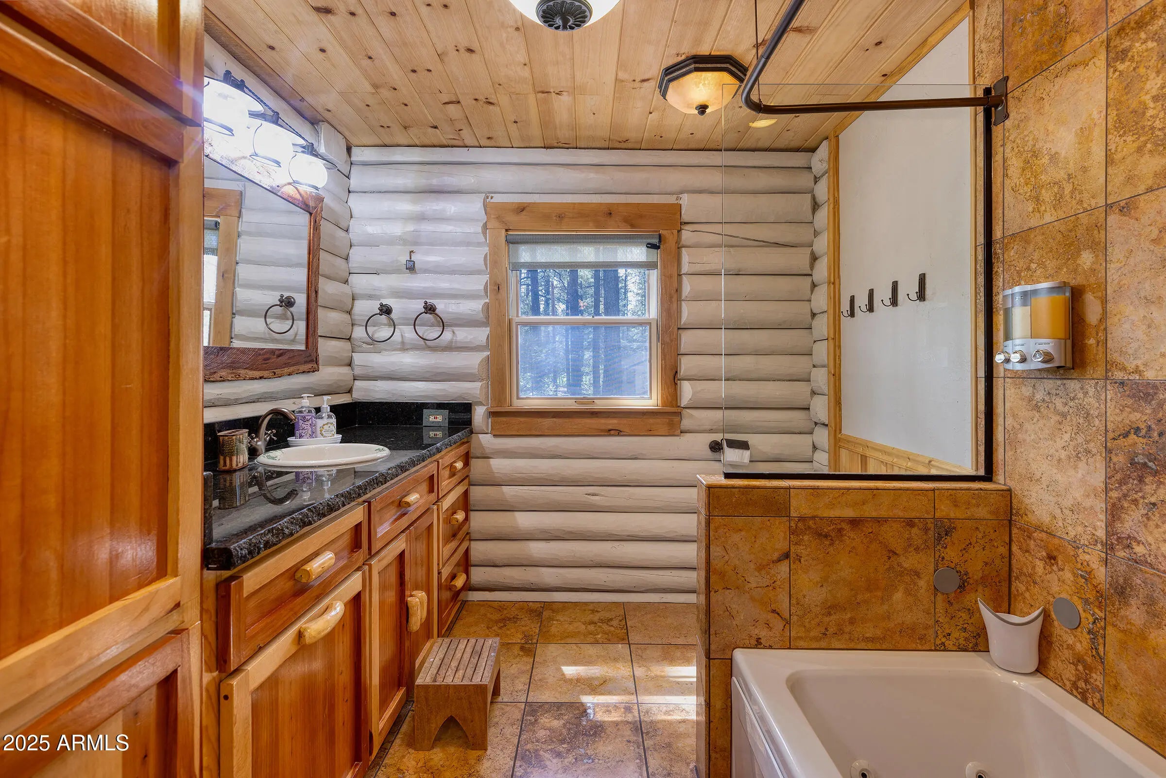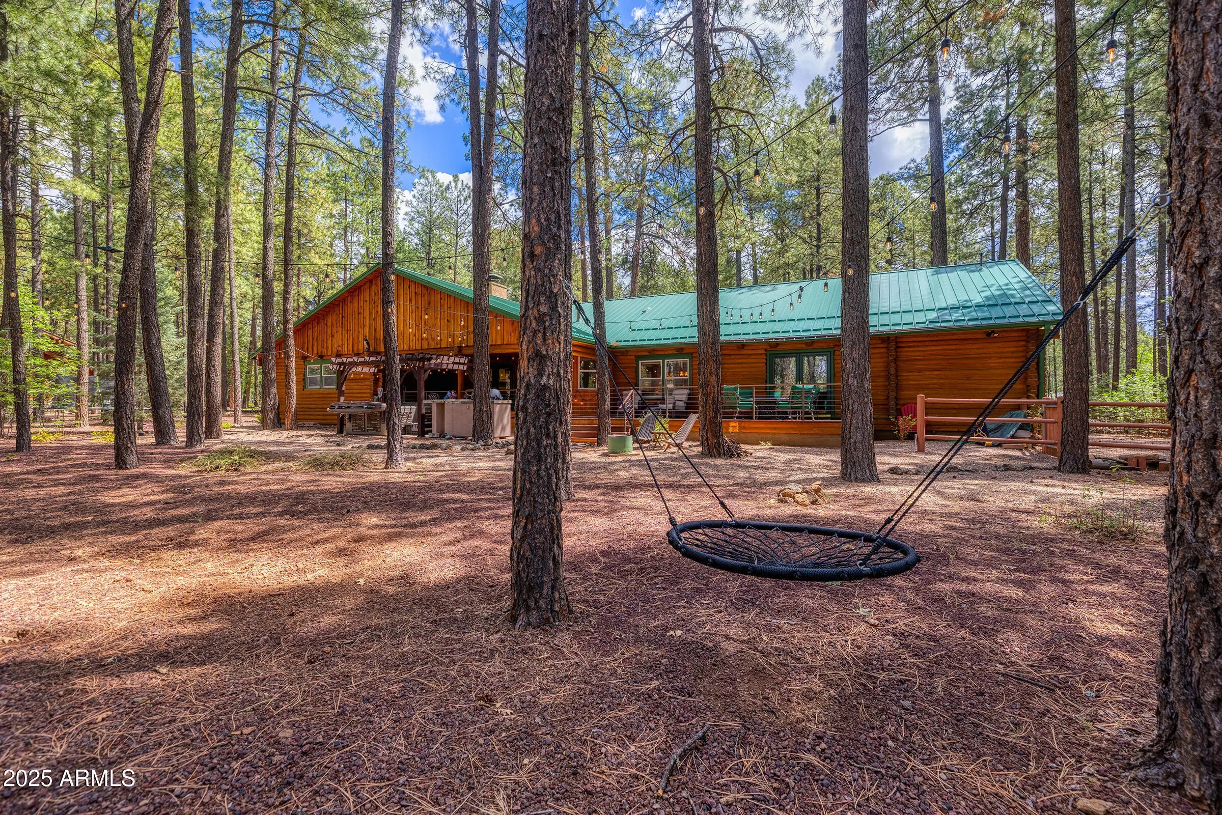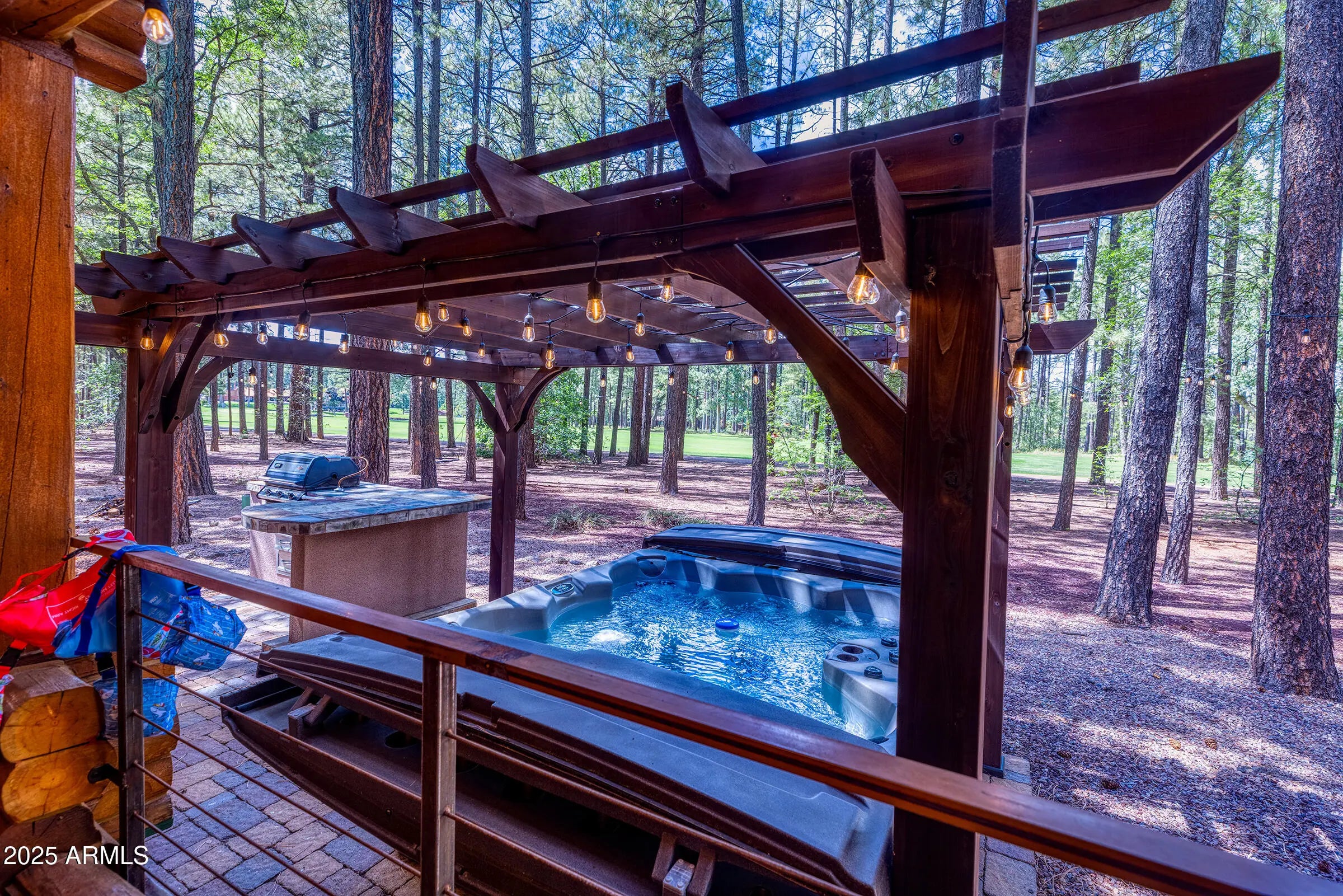 Pinetop Country Club stunning log cabin designed for comfort, connection, and mountain charm. The main living room welcomes you with soaring wood-beamed ceilings, rich log textures, and expansive windows that frame views of the fairway and lake. Whether you're gathered around the fireplace or enjoying the natural light, this space sets the tone for relaxed elegance. The kitchen is a true showpiece—fully updated with granite countertops, custom soft-close cabinetry, and high-end stainless steel appliances. There's ample counter space for meal prep and entertaining, plus thoughtful storage that blends functionality with rustic style. It's the kind of kitchen that invites conversation while you cook, with easy flow into the adjacent dining and living areas. The separate bonus room offers a versatile retreat for movie nights, bunk bed guests, or make it a game room. With its own half bath and plenty of room to spread out, it's ideal for hosting guests or creating a dedicated entertainment zone. Nearby, a bonus room adds even more flexibility, perfect for a home gym, playroom, office, or even a fifth bedroom. Step outside to the newly redone back deck, where a fresh railing and open layout create the perfect setting for outdoor living. The new hot tub is nestled under the stars, offering a private spa-like experience with views of the fairway and fountain. A custom Ramada with built-in BBQ and paver patio completes the backyard oasis, ready for gatherings, grilling, and unwinding in style.