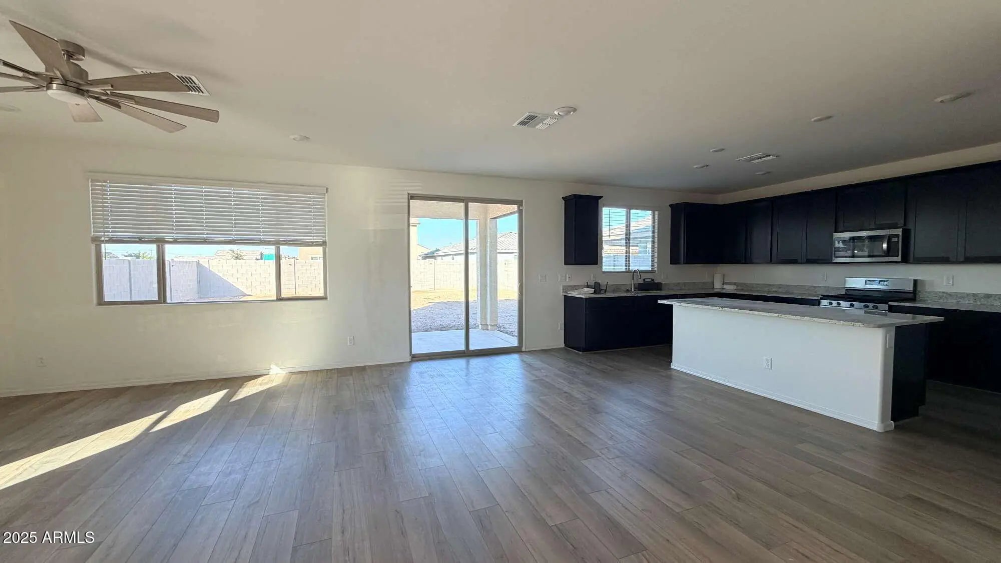 This two story four bedroom three bathroom home offers a flexible and functional layout. The main level features an open great room with natural light and sliding doors that open to the covered back patio. The kitchen overlooks the living area and includes granite countertops, a center island, refrigerator, and extended cabinetry. A full bedroom and bathroom on the first floor provide added flexibility for guests or home office use. Upstairs, the loft creates space for work or recreation. The primary suite features an oversized walk in closet and a bathroom with dual sinks, separate tub, and walk in shower. Additional bedrooms are well sized with nearby full bathroom access. Located near local parks, shopping, dining, and everyday conveniences.