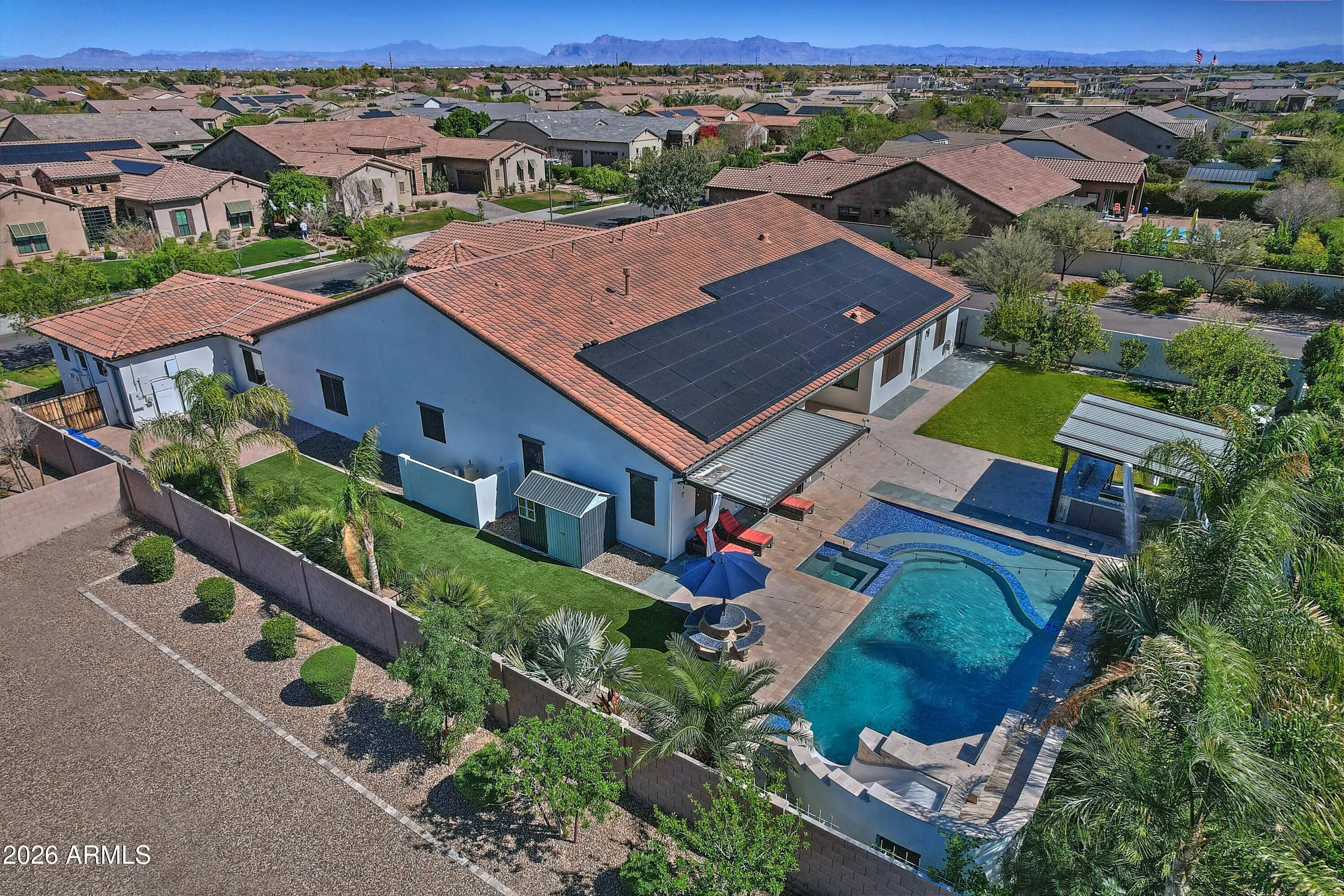 ENERGY SAVINGS - TESLA SOLAR with Back up batter. Absolutely stunning and thoughtfully designed, this exceptional Toll Brothers luxury residence is located in the prestigious gated community of Dorada Estates. Offering 5,720 square feet of elegant living space, the home features 5 bedrooms, 4.5 bathrooms, a den, media-bonus room, private office, and a four-car garage--perfectly balancing comfort, style, and functionality. From the moment you enter, you are welcomed by soaring 10-foot ceilings and a bright, open floor plan ideal for both everyday living and entertaining. The chef's kitchen is truly a centerpiece, showcasing two dishwashers, dual expansive 12-foot granite islands, a built-in refrigerator, five-burner gas range, and a butler's pantry--designed to impress and inspire. The Kitchen looks over into the expansive great room so that you can be part of the entertainment. Just off the main living areas, the media/bonus room offers a flexible and inviting space ideal for movie nights, gaming, or hosting sporting events. Whether used as a home theater, lounge, or secondary family room, this versatile space provides endless possibilities for relaxation and entertainment. The luxurious primary suite is a private retreat, featuring a spa-like en-suite bath with a soaking tub, oversized glass-enclosed shower, dual vanities, and an expansive walk-in closet complete with its own dedicated laundry. Each additional bedroom offers an en-suite bath, providing comfort and privacy for family and guests alike. Seamless indoor-outdoor living is achieved through a dramatic 15-foot pocket door that opens to your resort-style backyard oasis. Enjoy a heated pool and spa, outdoor shower, pergola, and a newly added outdoor kitchen with BBQ and cozy fire features (installed December 2022). The space is beautifully complemented by a grassy play area and lush citrus trees perfect for relaxing or entertaining year-round. Situated on an oversized 20,800 sq. ft. north/south-facing corner lot, the property also includes a second laundry room, RV gate, dog run, and an extended two-car garage bay with built-in cabinetry. Additional thoughtful upgrades enhance accessibility and comfort, including wider hallways, oversized solid-core doors, two zero-entry showers, and convenient access to the main entry, covered patio, and recreational areas. Located within the highly rated Chandler Unified School District, this move-in-ready home offers the rare opportunity to enjoy luxury living with all upgrades already completed.