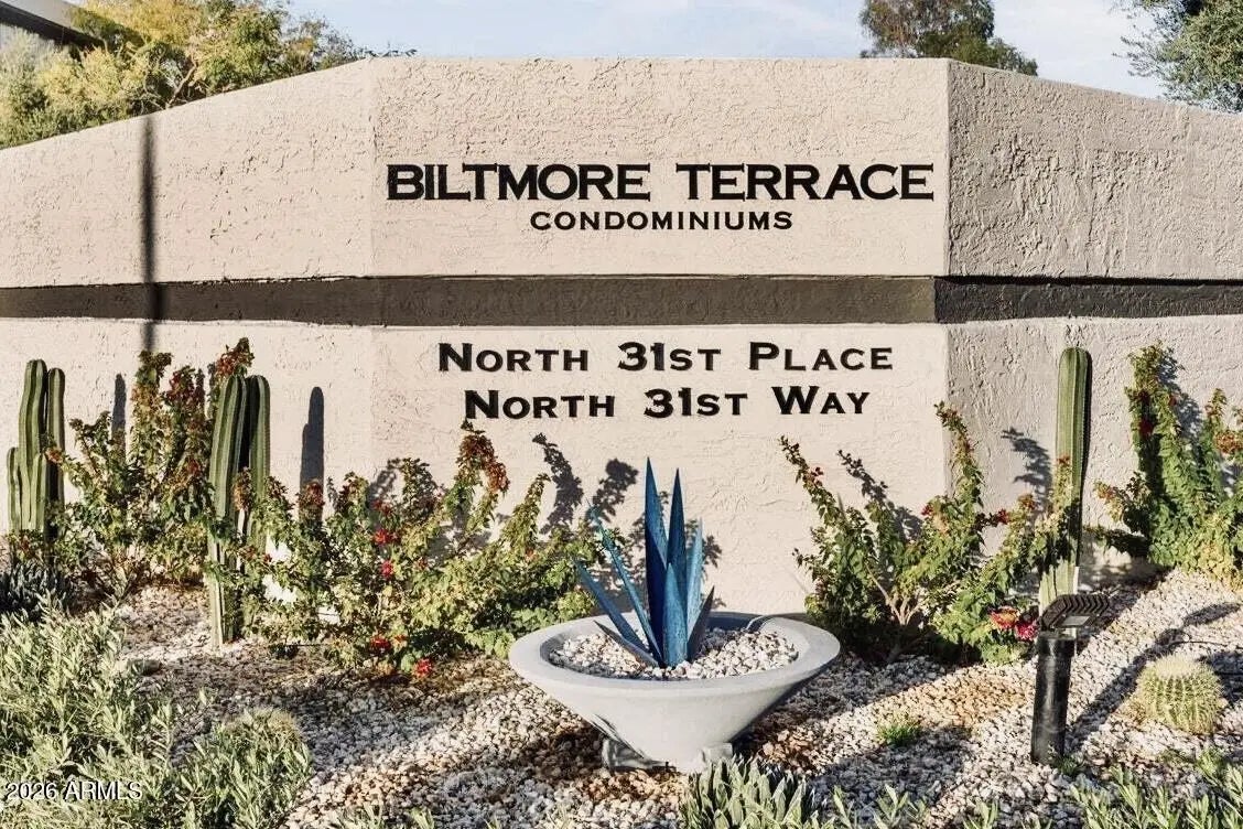 Welcome to the heart of Arizona living at Biltmore Terrace. Enjoy gorgeous views of golf course and lake from the large windows and French doors leading to oversized balcony. Located on the 3rd hole of the Biltmore Golf Course. This freshly painted two bedroom, one bath features an open and bright floorplan with tile floors throughout, inside laundry, low E windows, crown moldings, plantation shutters and led lighting. Eat in kitchen features granite countertops, custom backsplash and ample storage. Bathroom has tub/shower with Italian marble walls & large vanity with granite top. Secure community with resort style amenities - two pools, two hot tubs, fitness center, clubhouse and lush landscaped grounds. Direct path & gated access to Safeway, restaurants and Biltmore Plaza shopping.