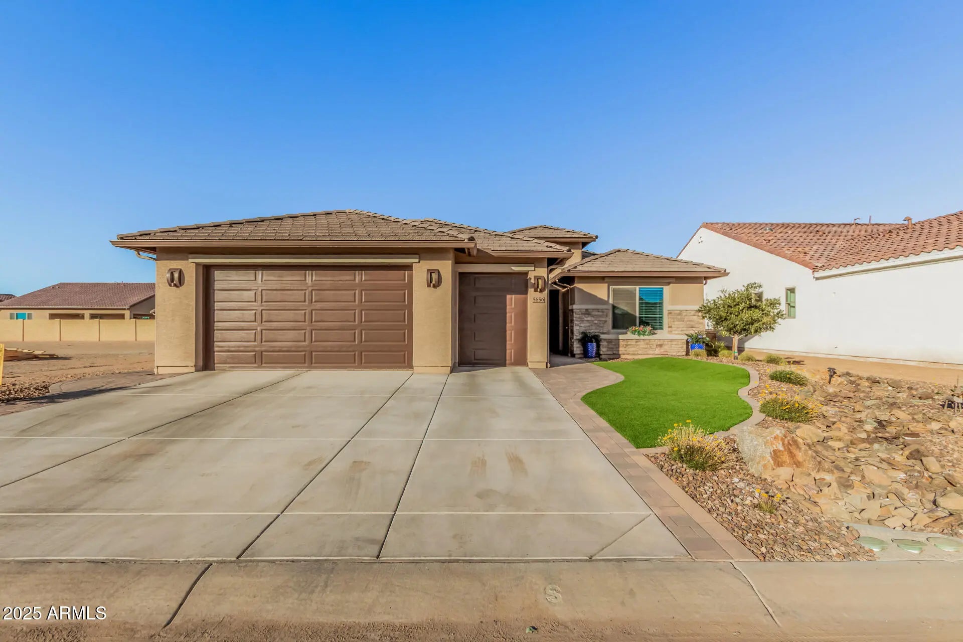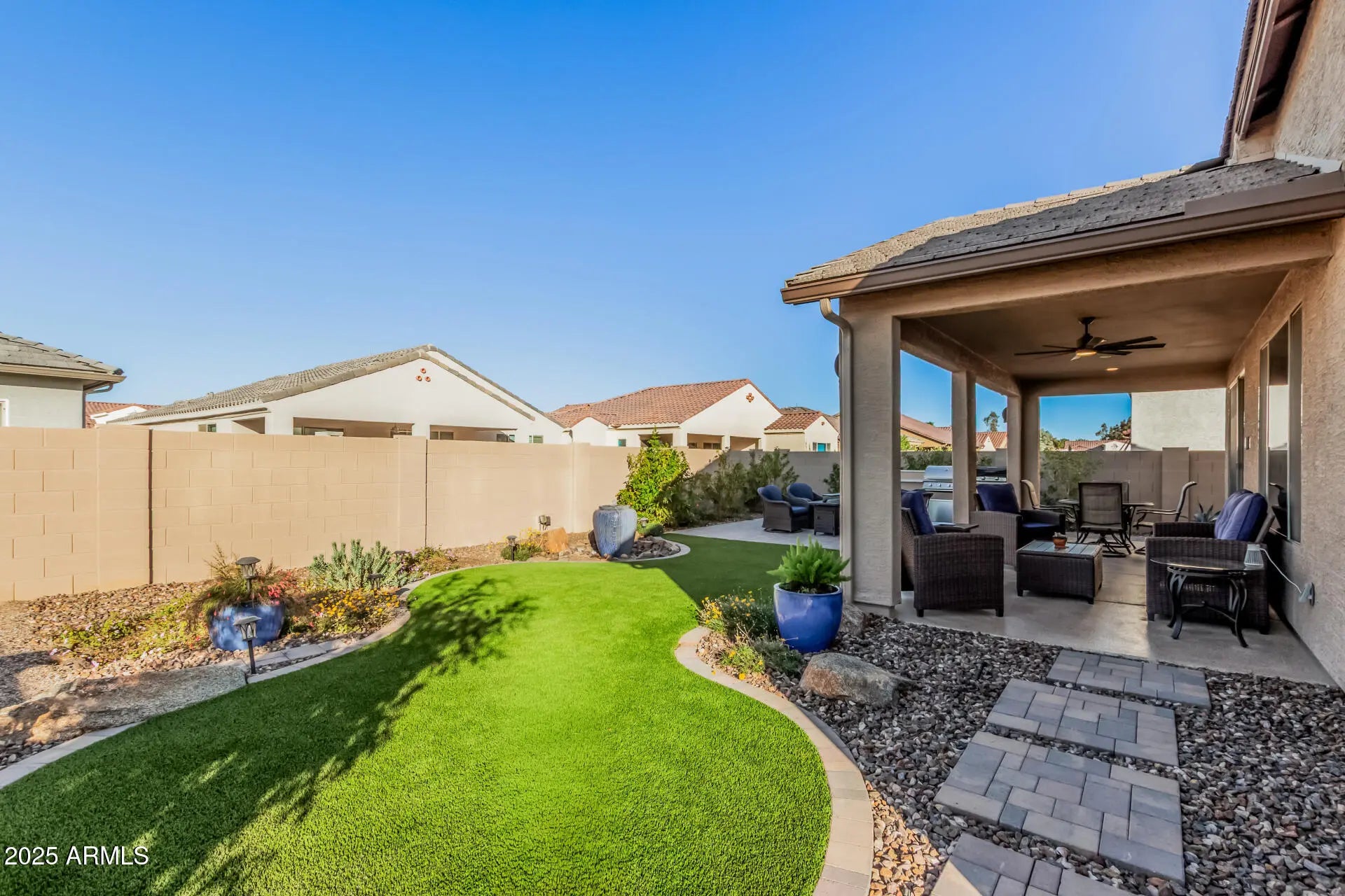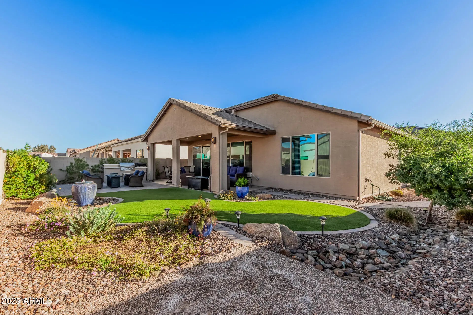 Almost New 2023 + All Done for you! Beautiful MONTECITO with 2.5 Car Garage, 4 Ft Ext, Epoxy Flooring, Split A/C 8 Ft Doors, 3 attached Cabinets. Almost 1700 sq ft of Gorgeous Living the Robson Ranch DREAM! 2 Generous Bedrooms, plus Den, 2 Full Bathrooms with Walk-In Tile Showers. All beautiful High-End Tile Floors, Wood Cabinets, Quartz Counters, huge half-moon Quartz Island, large single Bianco Sink, All high-in Appliances, Gas Range & Oven, Plus Refrigerator/Freezer included. Dining Room with 4ft Bump-out. Extended 4 ft Laundry Room w/Cabinets, Washer & Dryer. Covered Patio with Epoxy coating, extended Pavers with Built-in BBQ. Large Artificial TURF area. Beautiful water Fountain. Firepit area to enjoy Sunsets. Completely fenced yard with easy care plants and irrigation system. Low-maintenance front and rear yards for care-free living! This is a Special Home ready for YOU!