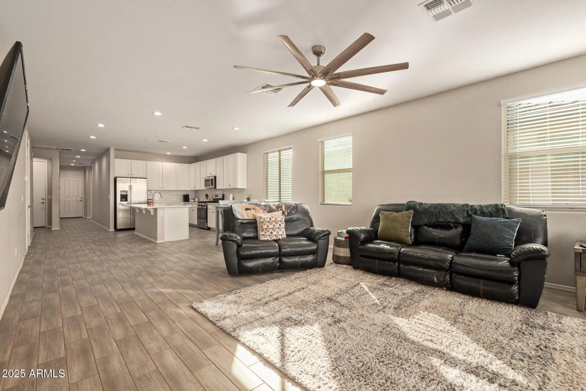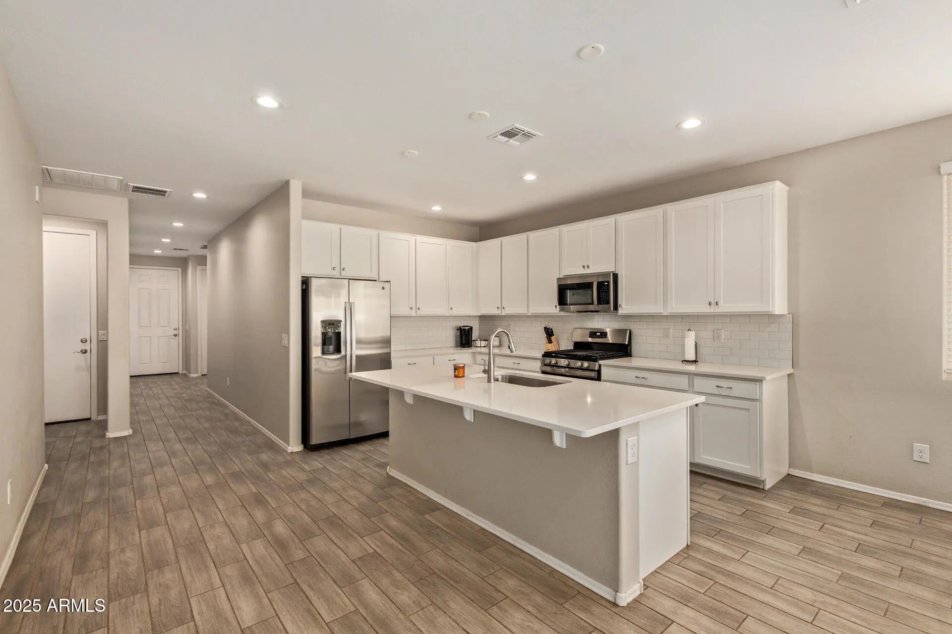 Private next-gen suite makes this home truly stand out. Complete with its own bedroom, full bath, and living area with plumbing for a future wet bar, it is ideal for multigenerational living or long-term guests while still connected to the main home. Inside, enjoy an open great room with soaring ceilings and tile wood-look flooring. The bright kitchen features white shaker cabinets, quartz countertops, stainless steel appliances, an oversized island, and walk in pantry. Spacious primary suite with dual sinks and walk in closet. 3 car garage offers room for vehicles, storage, or hobbies. Covered patio and generous backyard ready for gatherings.