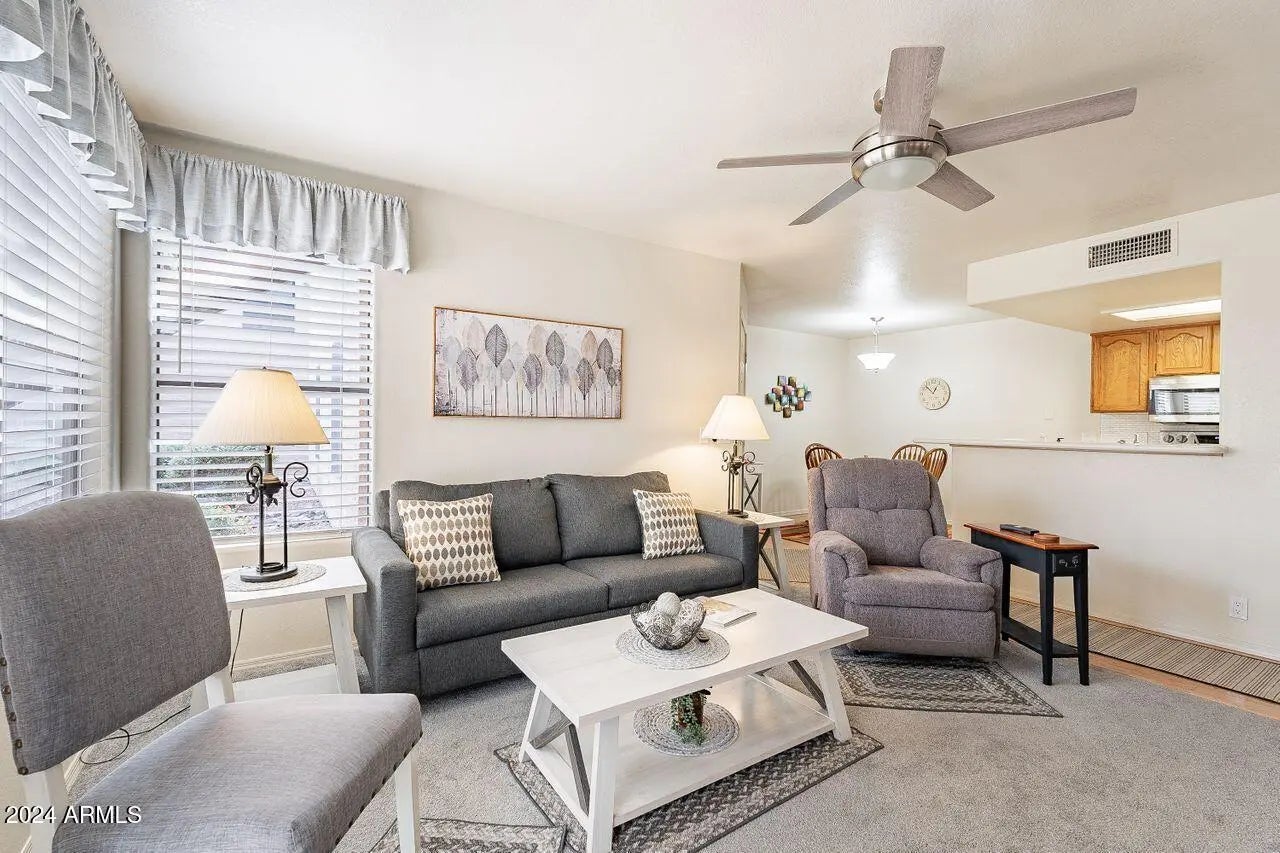 This first floor, no stairs, one bedroom, one bath, completely furnished condo overlooks a grassy courtyard in the center of this lovely complex. This is a turnkey property so all you need to bring is your clothes and your toothbrush!! Newer furnishings and appliances. Sleeper sofa in living area offers additional guest quarters. Newer electric fireplace adds a nice ambiance to this very cozy home. Covered patio for outdoor living,. An assigned carport for you plus additional unassigned parking for your additional car and/or guests. No pool, so low HOA fees. THIS IS IT!!!