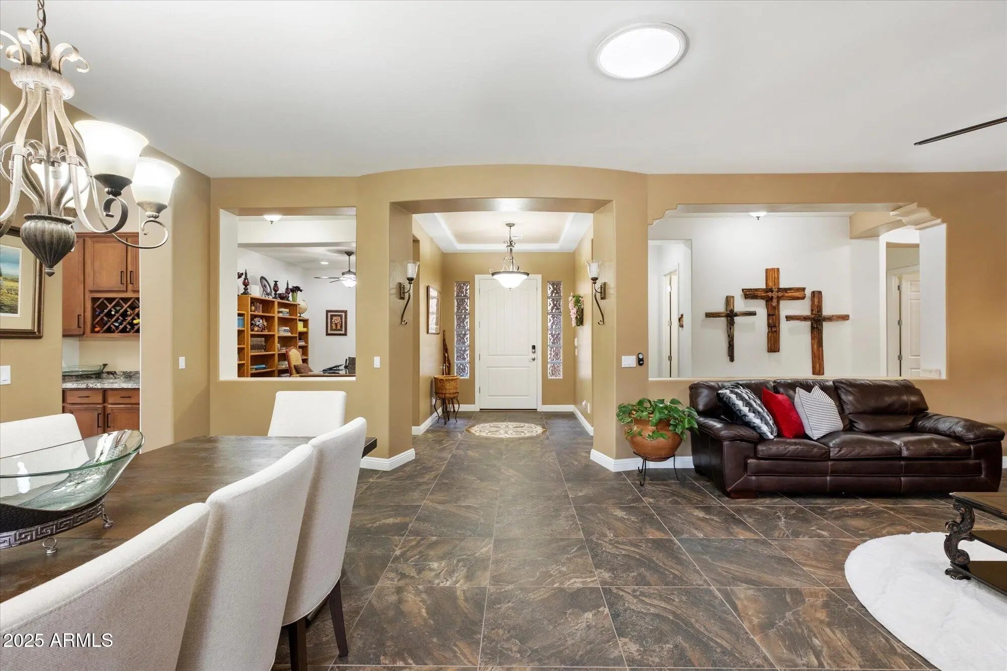 Set on an elevated, quiet street w mountain views, this home exudes thoughtful craftsmanship & pride of ownership. Soaring 10' ceilings & 8' doors complement an open layout finished in premium 24'' Italian tile with three inlaid medallions, custom interior paint, and abundant of natural light from added solar tubes. The chef's kitchen features high-end granite counters, a built-in 48'' Monogram refrigerator, stainless-steel KitchenAid appliances, double ovens, a high-CFM exhaust hood, triple sink, and an RO water system. Updated cabinetry with rollouts, under-cabinet lighting, and a spacious pantry complete the space. Two newly upgraded bathrooms offer elegant walk-in showers, while the primary suite is a peaceful retreat w a bay window seating area and generous walk-in closet. Additional highlights include three true walk-in closets (one in the primary suite & two additional bedrooms), a central vac system, upgraded water softener, recirculating hot-water system, and dual 5-ton 17-SEER HVAC units. Outdoors, professionally refreshed landscaping surrounds a private oasis complete with a custom wrought-iron entry gate, sunscreens, and a spacious side yard with double gates and garage access. The backyard showcases a custom pool with therapy jets, Pentair IntelliTouch automation, LED lighting, and a 14'x16' ramada with gas hookup, ceiling fan, and LED illumination - ideal for entertaining. The three-car garage offers WiFi-enabled openers, 20-amp circuits, and overhead storage.