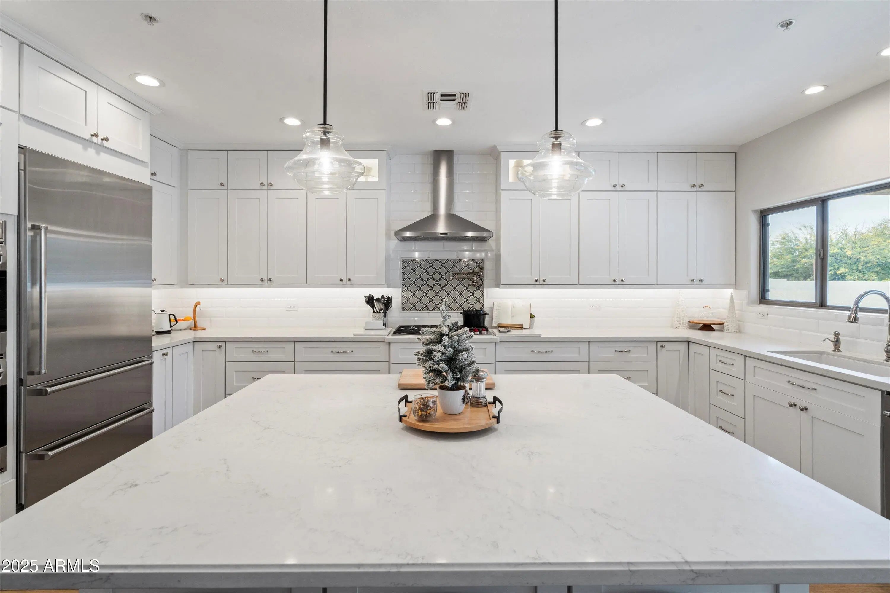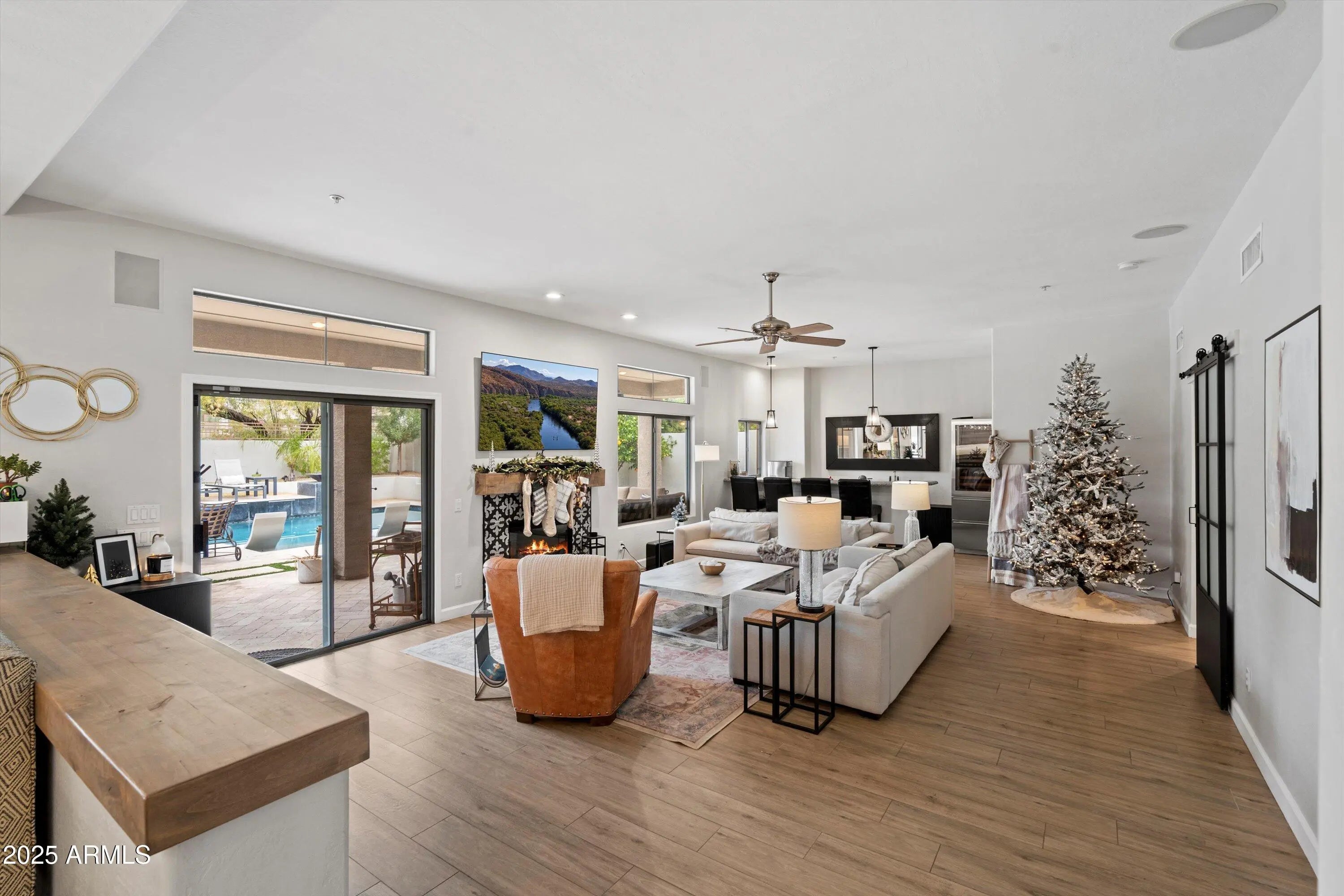 Step into a truly one-of-a-kind North Scottsdale residence offering refined desert luxury in one of the area's most sought-after communities. This beautifully updated home spans 4,461 sq ft with 5 bedrooms, 3.5 baths, and a 3-car garage, blending timeless elegance with modern comfort. The expansive open floor plan is ideal for both entertaining and everyday living. At its center is a designer kitchen featuring quartz countertops, white shaker cabinetry, a Sub-Zero refrigerator, Wolf 5-burner gas cooktop and Wolf double ovens, and an oversized island. The adjacent family room includes a gas fireplace and a custom entertainment bar, perfect for hosting and gathering. A private guest suite with en-suite bath and a spacious laundry room complete the main level. Upstairs, the primary suite offers dual walk-in closets, a two-way fireplace, and a spa-inspired bath with soaking tub, glass shower, and dual vanities. Three additional bedrooms, a shared bath with double sinks, and a versatile loft with built-ins provide flexible living space. The resort-style backyard has been remodeled and features a Pebble Tec pool with baja shelf, fire features, swim-up bar, and a sunken outdoor kitchen with dual grills, pergola, TVs, LED lighting, and full bar creating a private retreat ideal for relaxation and entertaining.