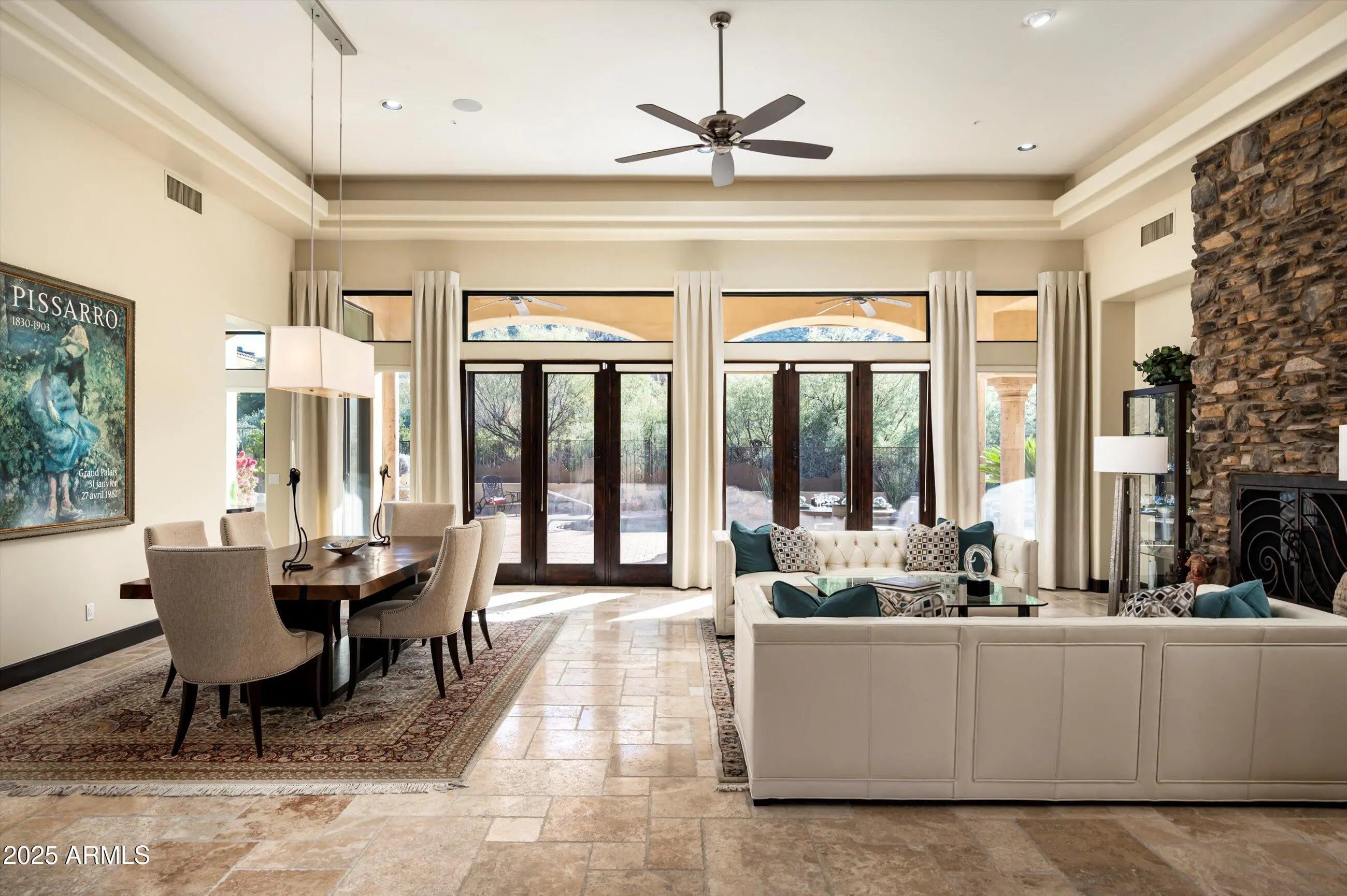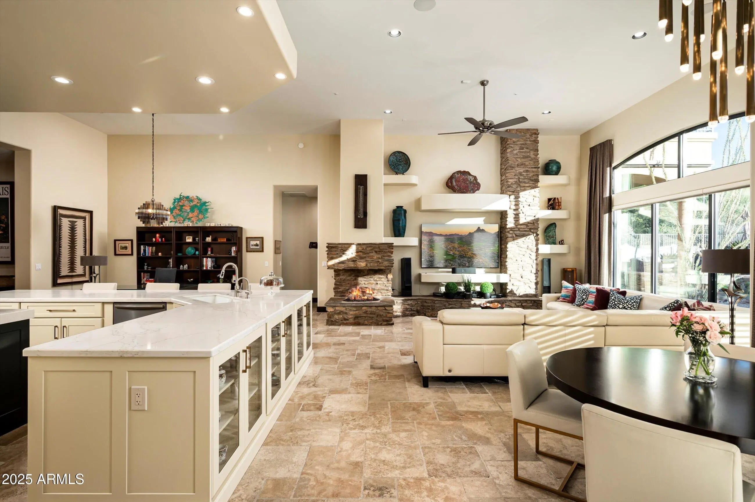 A buyers dream. Custom Santa Barbara/Tuscan single level home (no steps) in guard gated Windy Walk Estates. An extraordinary property from the gorgeous front desert landscaping to the backyard oasis and everything in between. The fully remodeled kitchen is culinary perfection with expansive Quartz countertops, high end appliances and a a fully remodeled butler pantry. The owners retreat is one you do not want to miss with a stunning bathroom, sitting area and main bedroom. There are four fireplaces throughout the interior. 300 plus wine cellar and a full bar is perfect for entertaining in the exquisite living and dining room. A graceful spiral staircase leads to a private observation deck with unparalleled 360-degree views. A perfect home in the Troon CC & golf community.