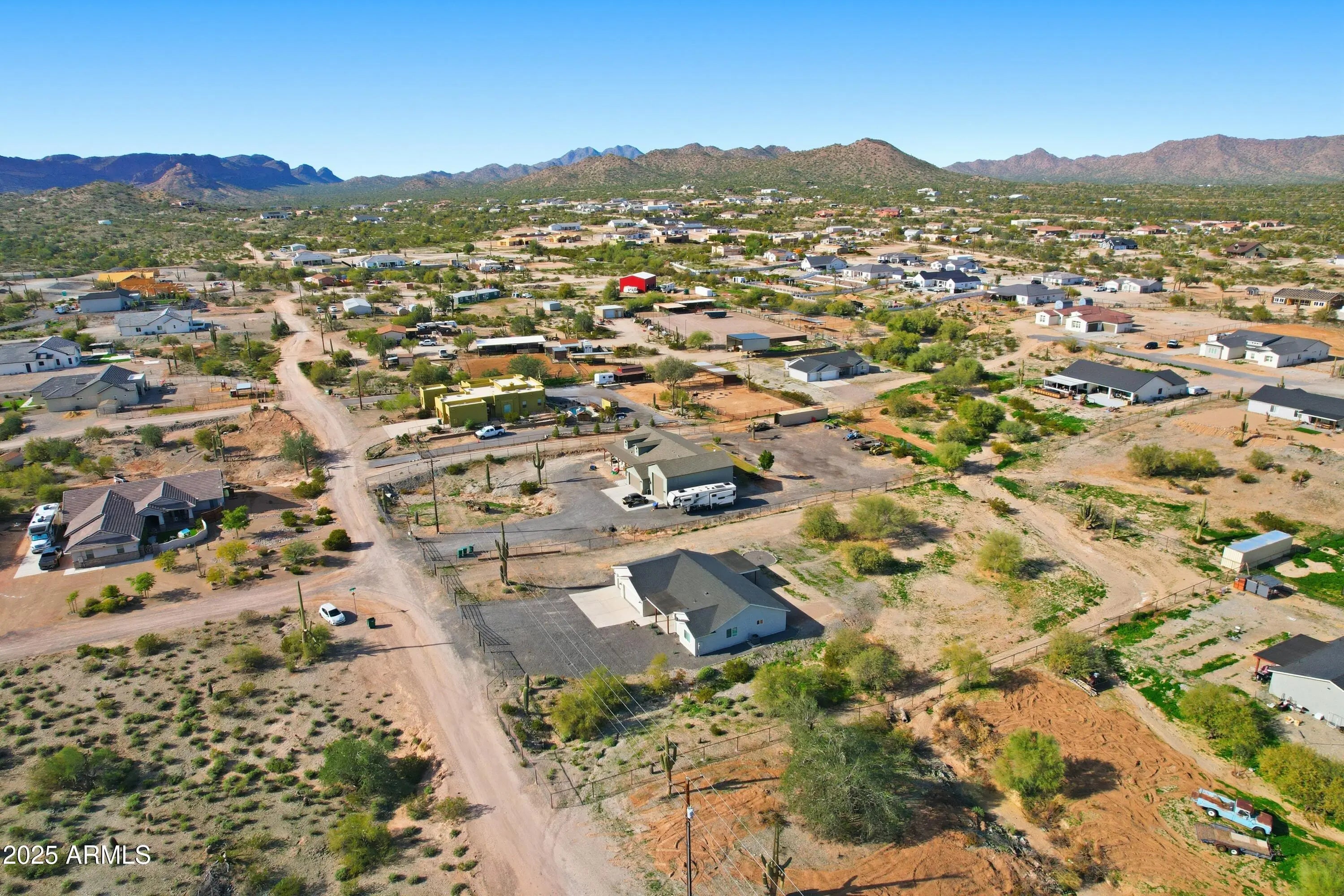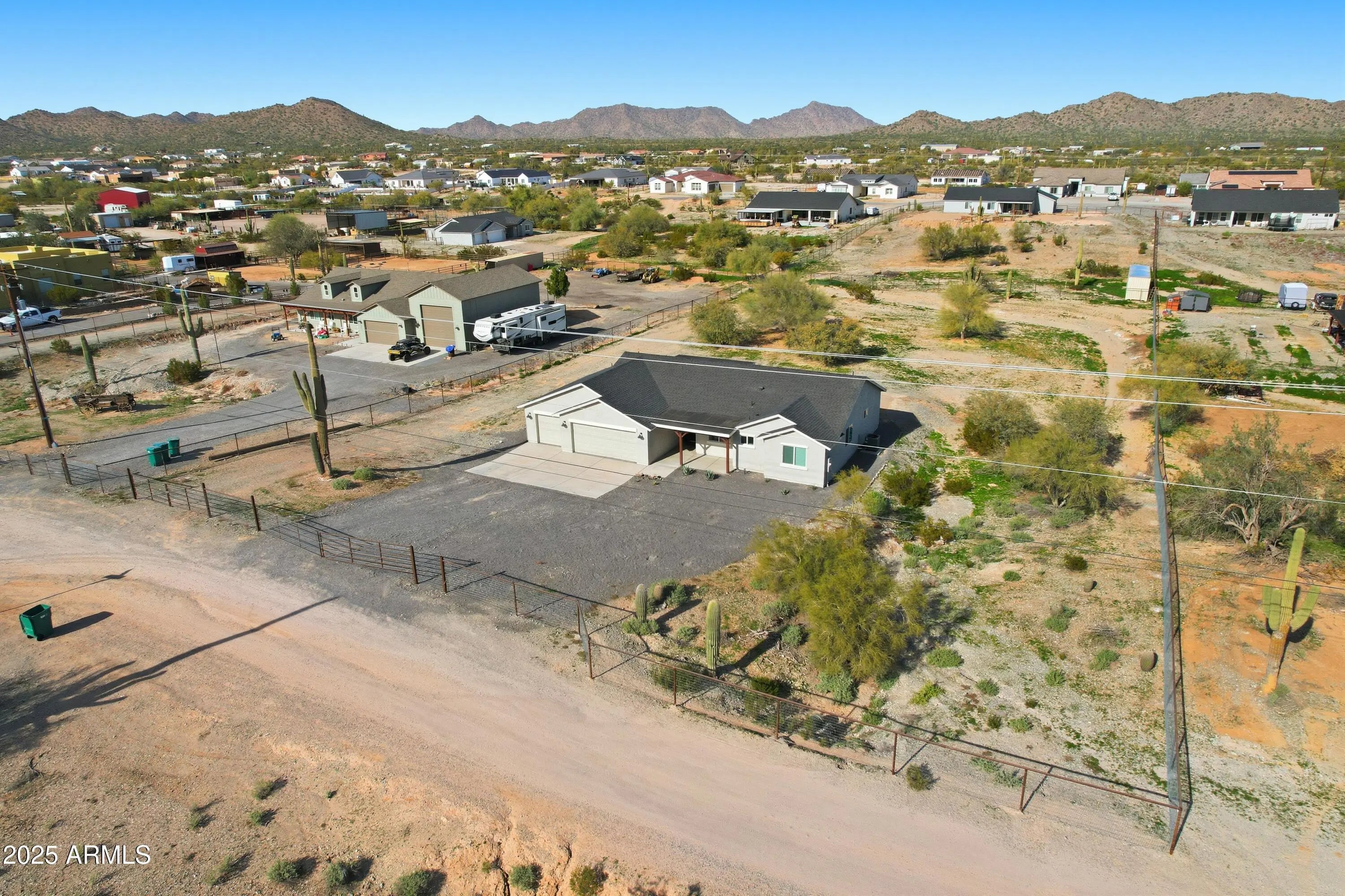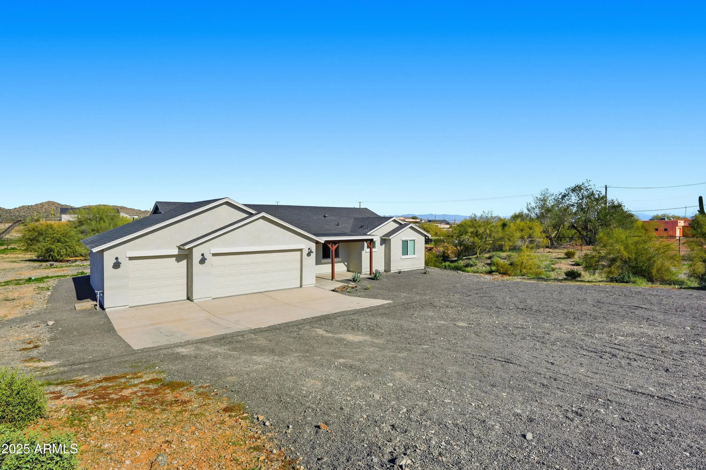 Experience the freedom of true Arizona living and mountain views in this stunning 4 bedroom/2 bath home on a sprawling 1.25-acre lot with NO HOA! Designed for both comfort and style, the open great-room layout features vaulted ceilings and porcelain tile throughout the main living areas. The inviting kitchen shines with quartz countertops, white shaker cabinetry, stainless steel appliances, and a large island perfect for entertaining. You will have room for all of your toys in the expansive 3-car garage. This property and location offers wide open space with endless possibilities for horses, toys, or future expansion. Built with 2x6 construction, spray-foam insulation, and dual-pane windows for energy efficiency. San Tan Regional Park offers horseback riding and mountain biking close by!