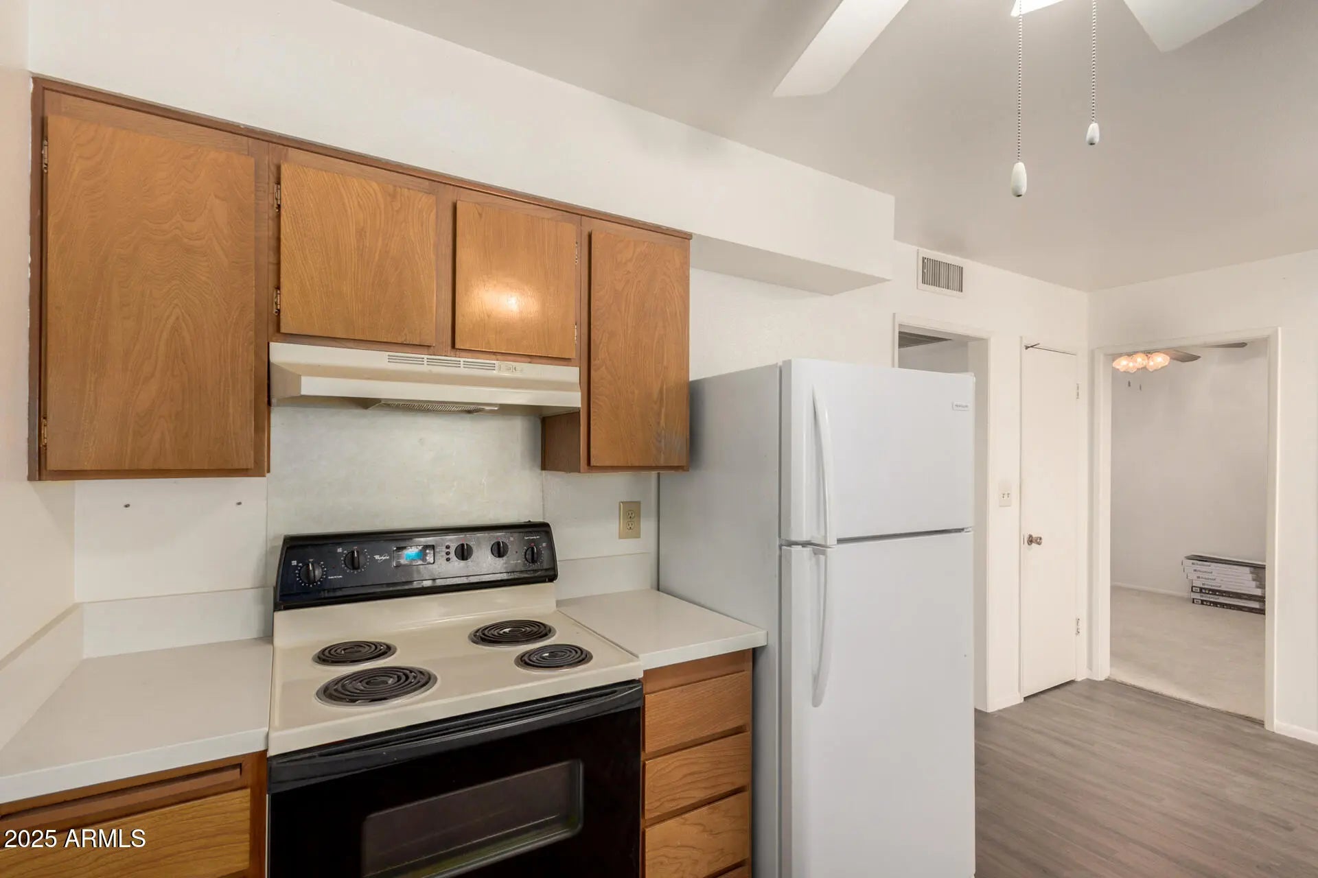 Home, sweet home! Ideal for those seeking the freedom and comfort of easy-maintenance living. The interior features generous living areas with wood-look flooring, carpet in all the right places, vaulted ceilings for an airy feel, ceiling fans throughout, and neutral paint. The galley kitchen boasts ample cabinetry, solid-surface counters, and built-in essentials for a seamless cooking experience. The bedroom is spacious with a closet, while the den is perfect for an office, hobby, or creative space. Out back, enjoy a nicely sized patio for morning coffee and peaceful evenings. Plus, a newer A/C unit installed August 2024! Don't miss the vibrant adult community amenities: pool, spa, tennis, and fitness center.