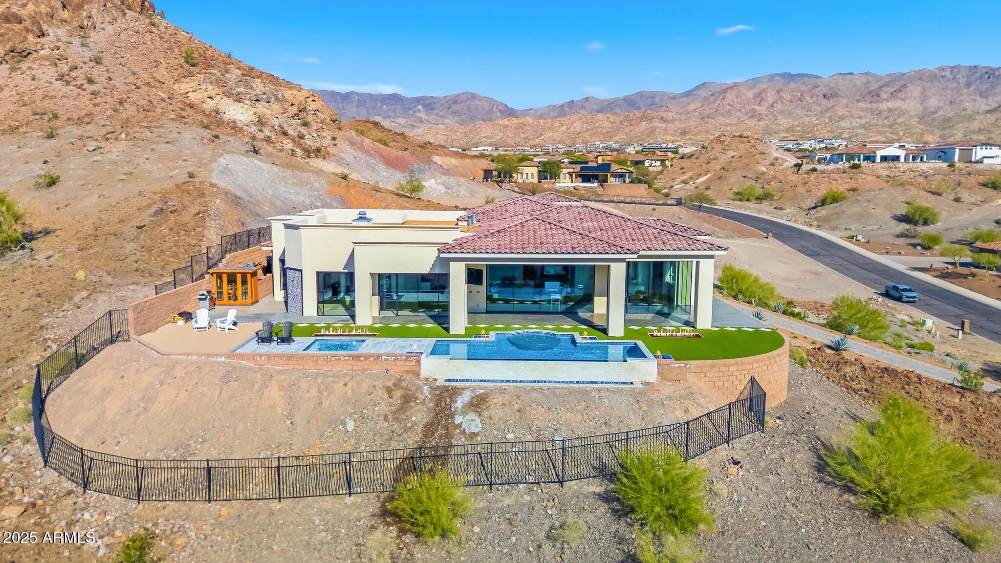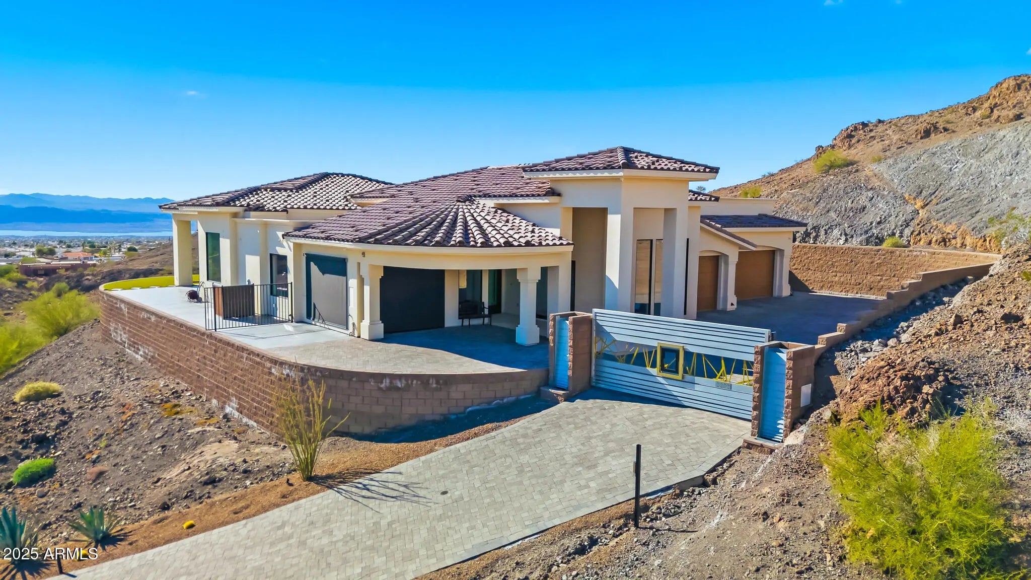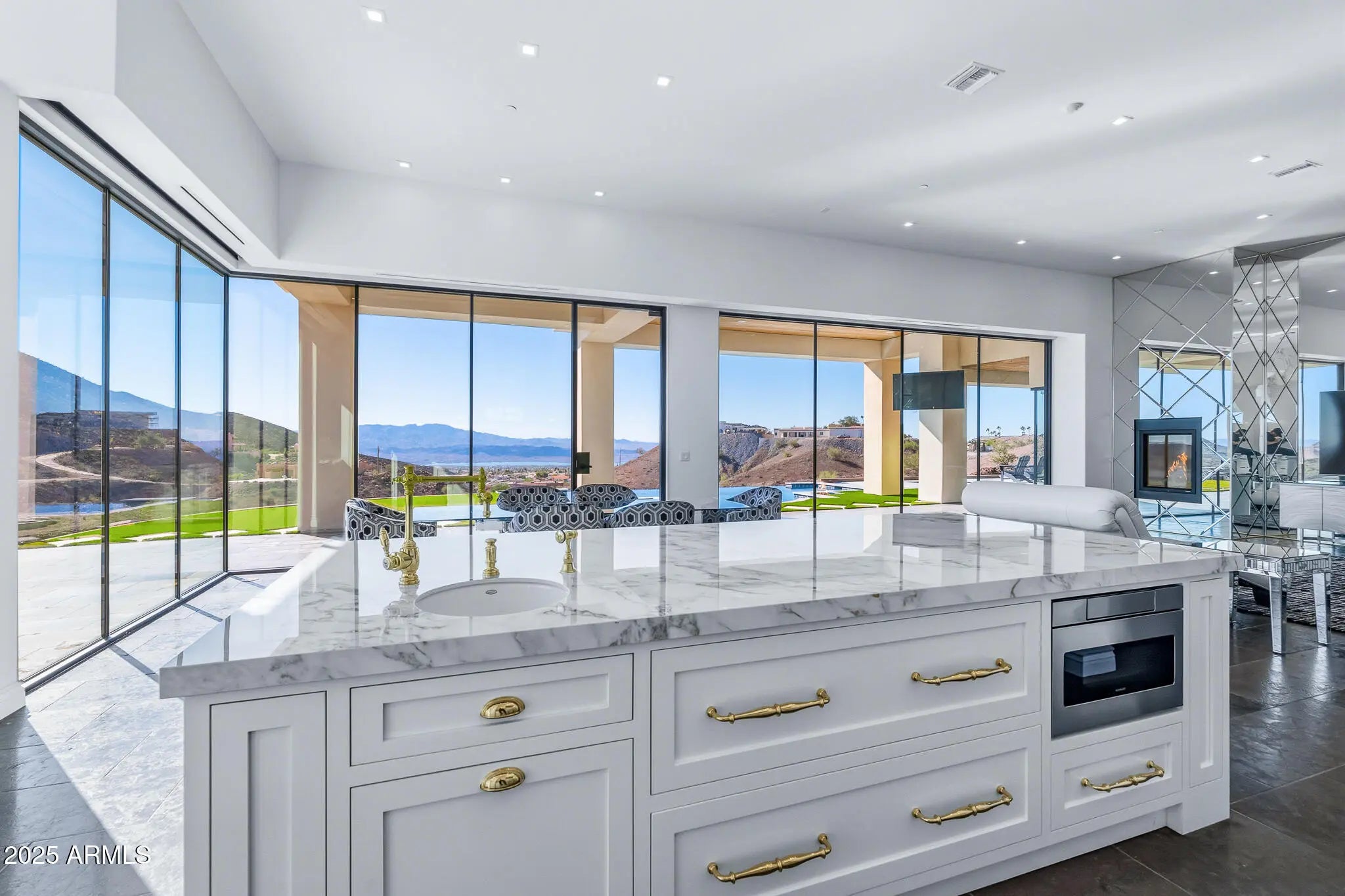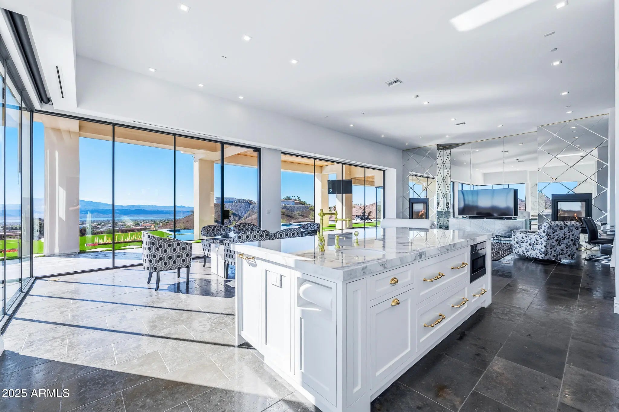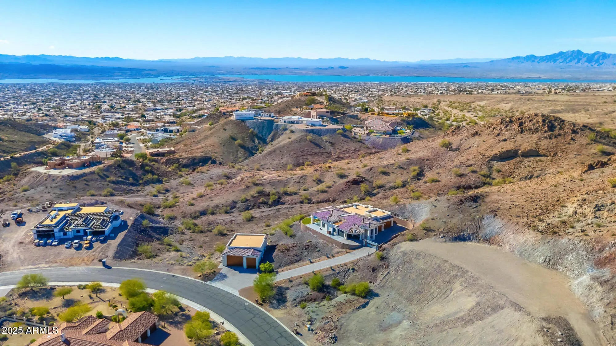 OPULENCE DEFINED with exotic finishes everywhere and ''perimeter walls of glass'' leading to panoramic lake and mountain views from every room that will NEVER be obstructed. Arguably, the best view and privacy lot in the Foothills Estates. Blue Limestone floors imported from Portugal, giant glass Pivot Entry Door, Dual Custom Gas fireplaces in main living space. Gourmet kitchen with exotic appliance package separate Sub Zero fridge. freezer, 75 bottle wine fridge, La Cornue oven/range, Ice Maker, 2 Microwaves. Solid porcelain countertops with full backsplash all around. Custom Cabinets throughout by renowned craftsman from Paradise Valley Az. Exotic stone in every bedroom and bathroom, Master features rare Davinci Island Gas fireplace , ultra-custom walk in closet - (all closets have Chanel design backing panels), dual vanities, separate, ''make up vanity''. window centered mirrored Baltazar Soaking Tub for lake view optimization. Steam Shower, ''Real Rain'' panels in every shower, Wolf towel warmer, Massive street level RV garage (detailed in ''more''), Glass Bottom Negative Edge Pool, Hot Tub, 6 fire elements in backyard - 5 person red light sauna has pano view of lake/mountains. 20 Seer AC units on residence (commercial duty cycle seldom seen in residential because of the triple purchase cost) The street level RV garage is a fully finished building equipped like a NASCAR race shop, 400 AMP electrical service, all digital lighting (3 times as many fixtures as required), 2 AC units (70 degrees inside on the worst Havasu days), fresh epoxy floor paint, full rear overhead door, air/water/electrical retractable hose reels ceiling mounted, full mezzanine with custom access ladders and removable railings, surround sound and panel TV, ceiling and wall mounted, panel TV in main bay, sidewinder garage door openers, custom bathroom with full stone, glass enclosed shower, washer and dryer, refrigerator, RV dump connections and RV electrical connections. This residence shows "as new" and is offered at less than replacement cost.
