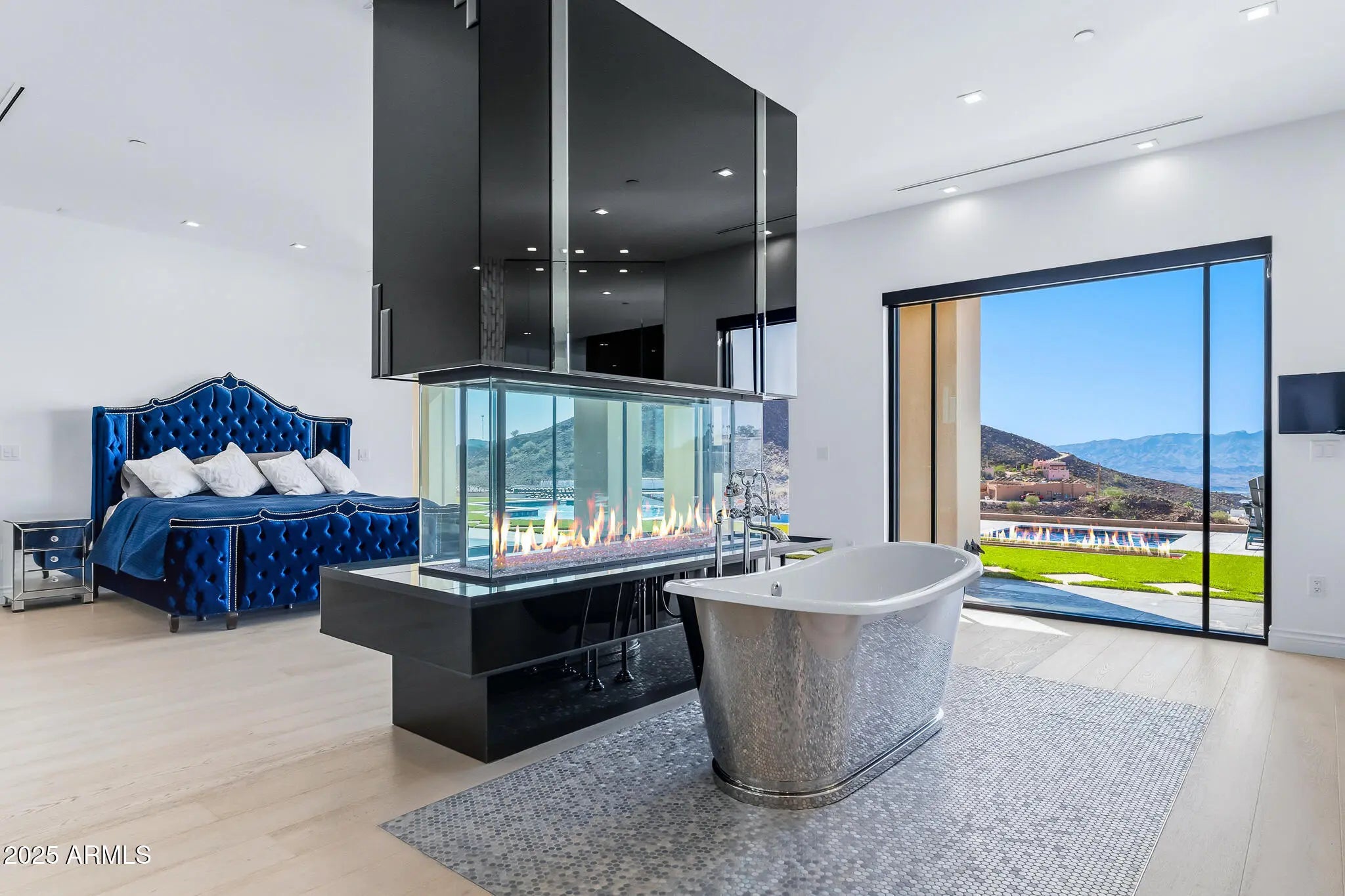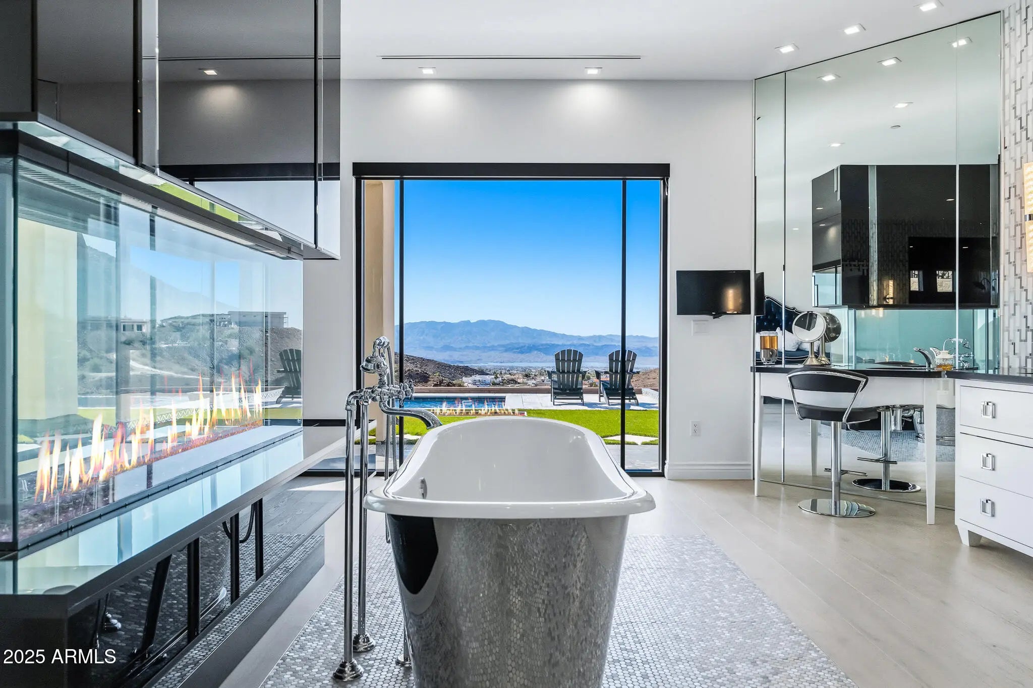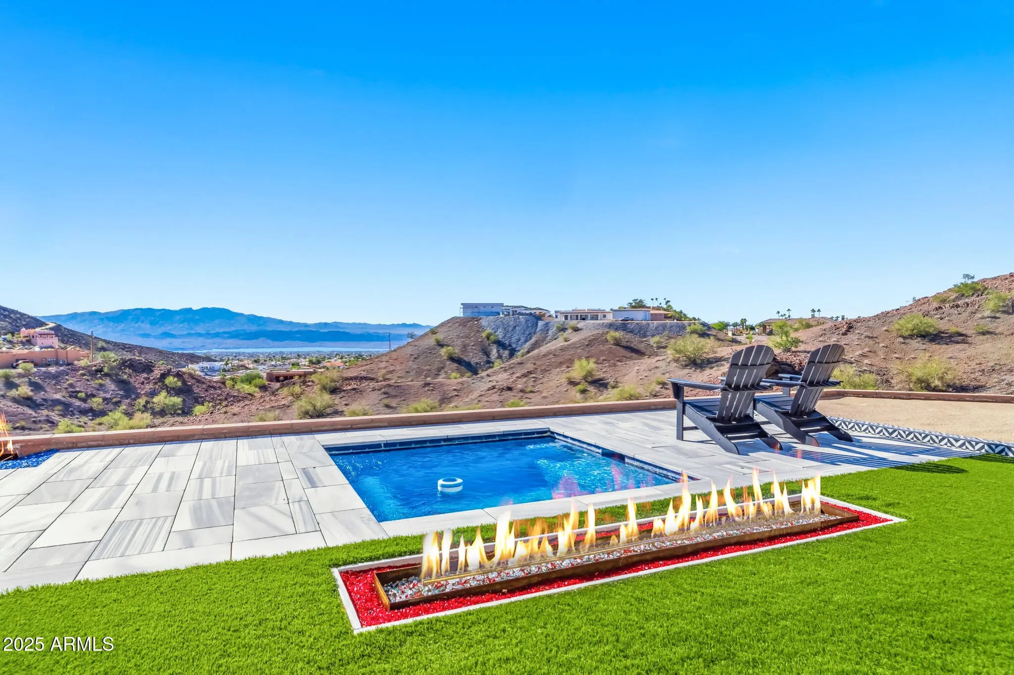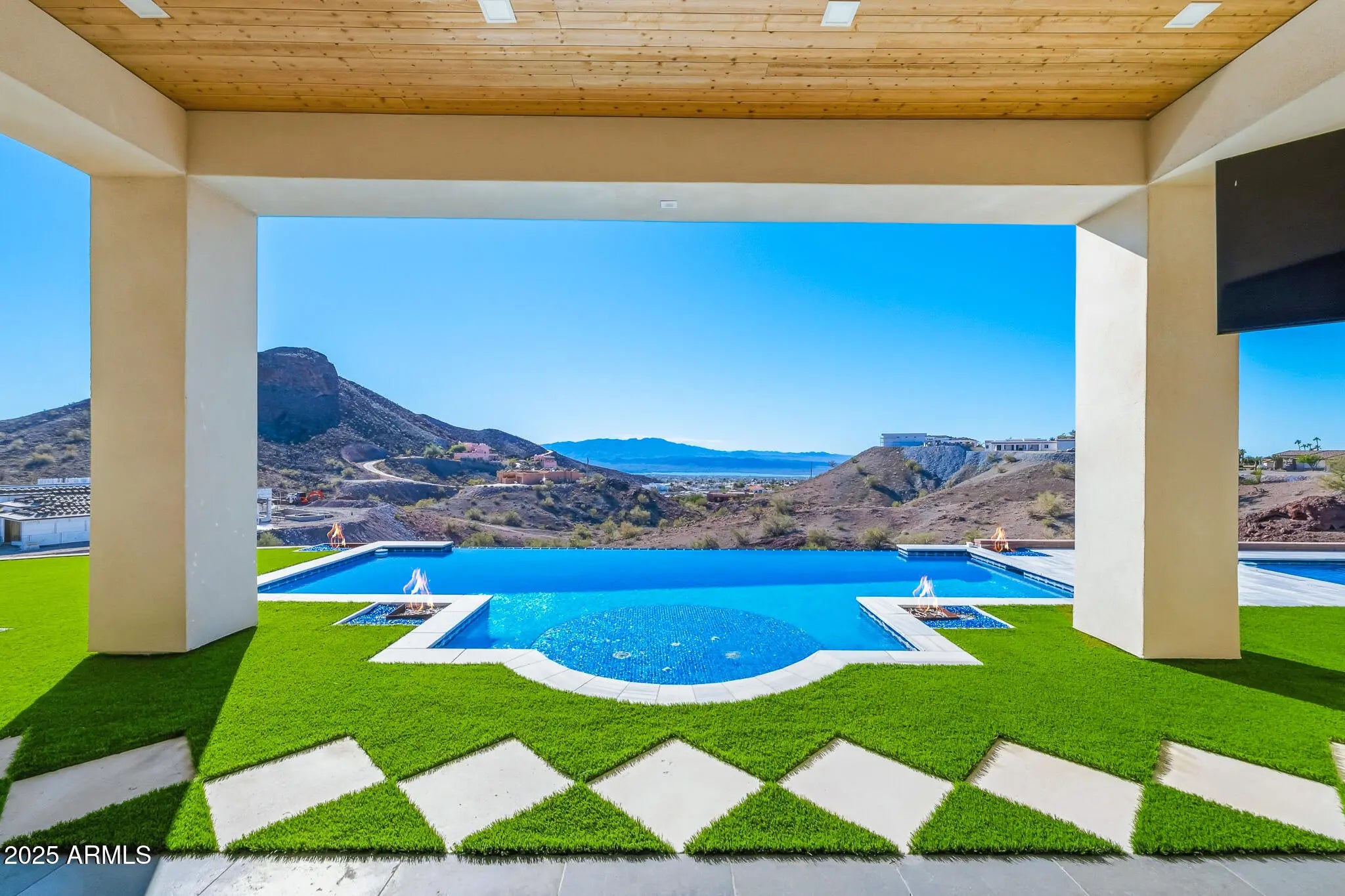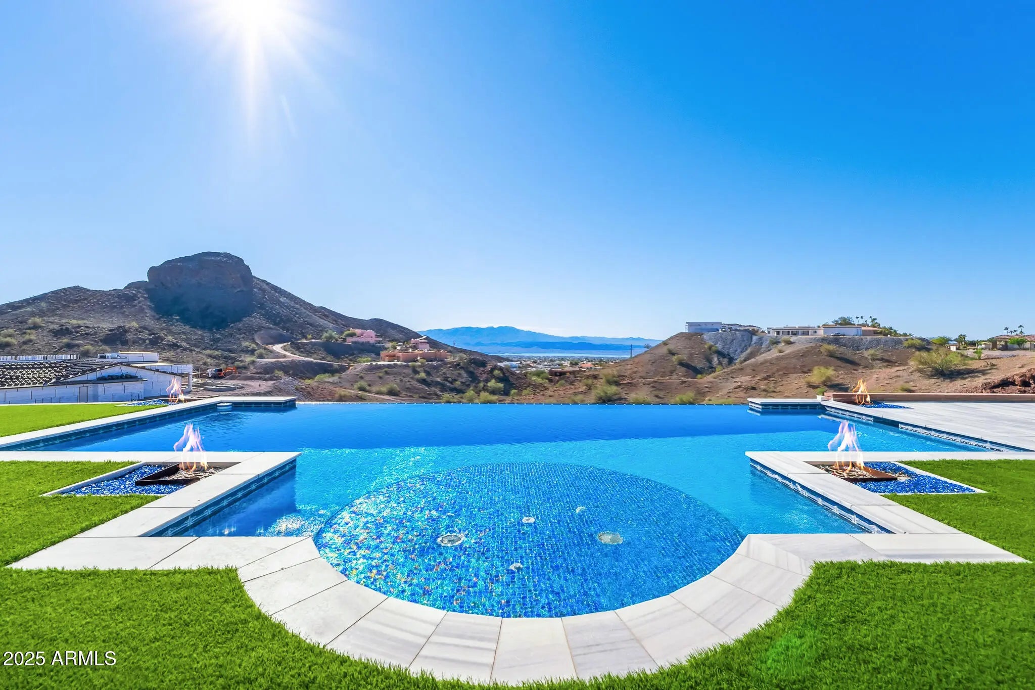 OPULENCE DEFINED with exotic finishes everywhere and ''perimeter walls of glass'' leading to panoramic lake and mountain views from every room that will NEVER be obstructed. Arguably, the best view and privacy lot in the Foothills Estates. Blue Limestone floors imported from Portugal, giant glass Pivot Entry Door, Dual Custom Gas fireplaces in main living space. Gourmet kitchen with exotic appliance package separate Sub Zero fridge. freezer, 75 bottle wine fridge, La Cornue oven/range, Ice Maker, 2 Microwaves. Solid porcelain countertops with full backsplash all around. Custom Cabinets throughout by renowned craftsman from Paradise Valley Az. Exotic stone in every bedroom and bathroom, Master features rare Davinci Island Gas fireplace , ultra-custom walk in closet - (all closets have Chanel design backing panels), dual vanities, separate, ''make up vanity''. window centered mirrored Baltazar Soaking Tub for lake view optimization. Steam Shower, ''Real Rain'' panels in every shower, Wolf towel warmer, Massive street level RV garage (detailed in ''more''), Glass Bottom Negative Edge Pool, Hot Tub, 6 fire elements in backyard - 5 person red light sauna has pano view of lake/mountains. 20 Seer AC units on residence (commercial duty cycle seldom seen in residential because of the triple purchase cost) The street level RV garage is a fully finished building equipped like a NASCAR race shop, 400 AMP electrical service, all digital lighting (3 times as many fixtures as required), 2 AC units (70 degrees inside on the worst Havasu days), fresh epoxy floor paint, full rear overhead door, air/water/electrical retractable hose reels ceiling mounted, full mezzanine with custom access ladders and removable railings, surround sound and panel TV, ceiling and wall mounted, panel TV in main bay, sidewinder garage door openers, custom bathroom with full stone, glass enclosed shower, washer and dryer, refrigerator, RV dump connections and RV electrical connections. This residence shows "as new" and is offered at less than replacement cost.