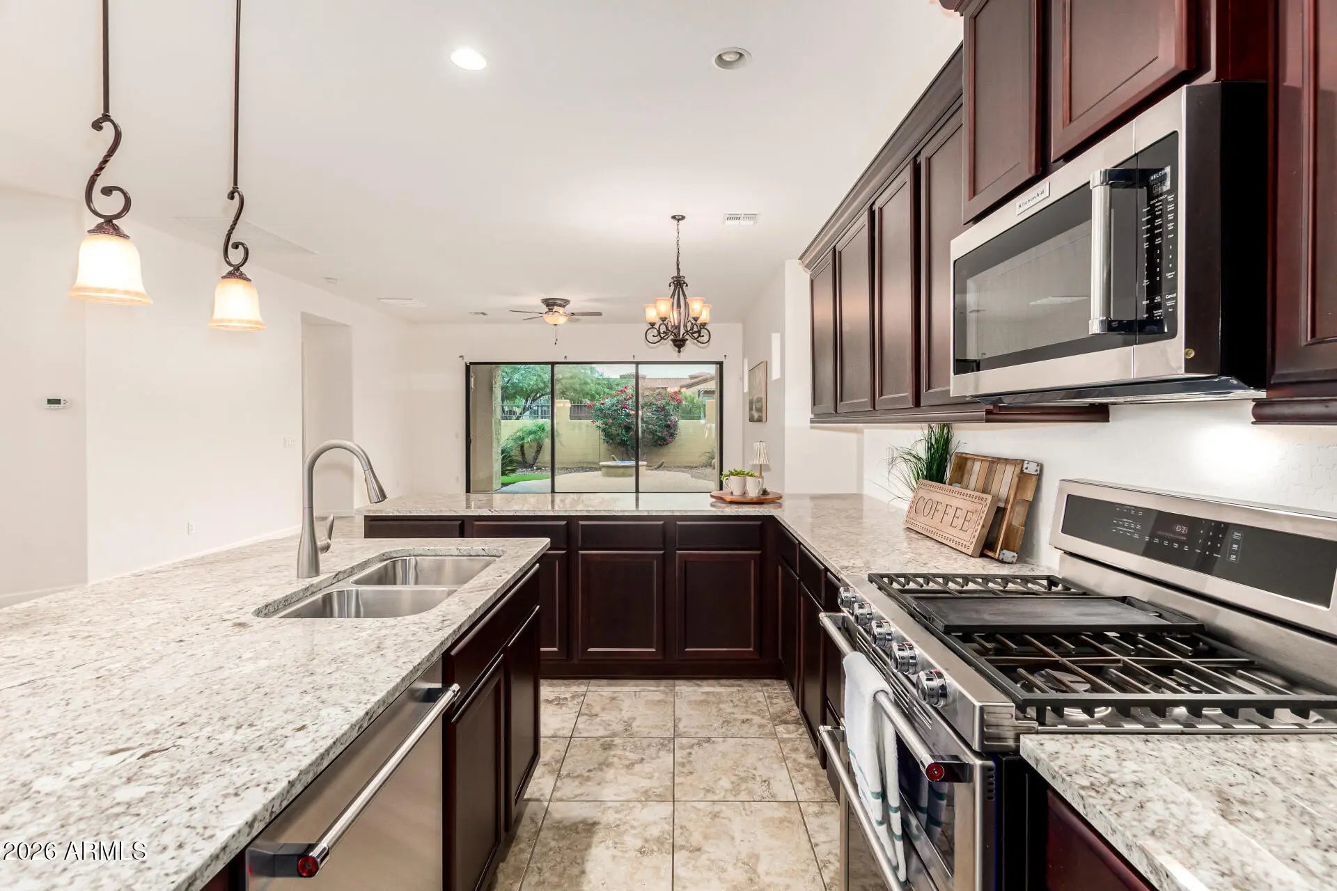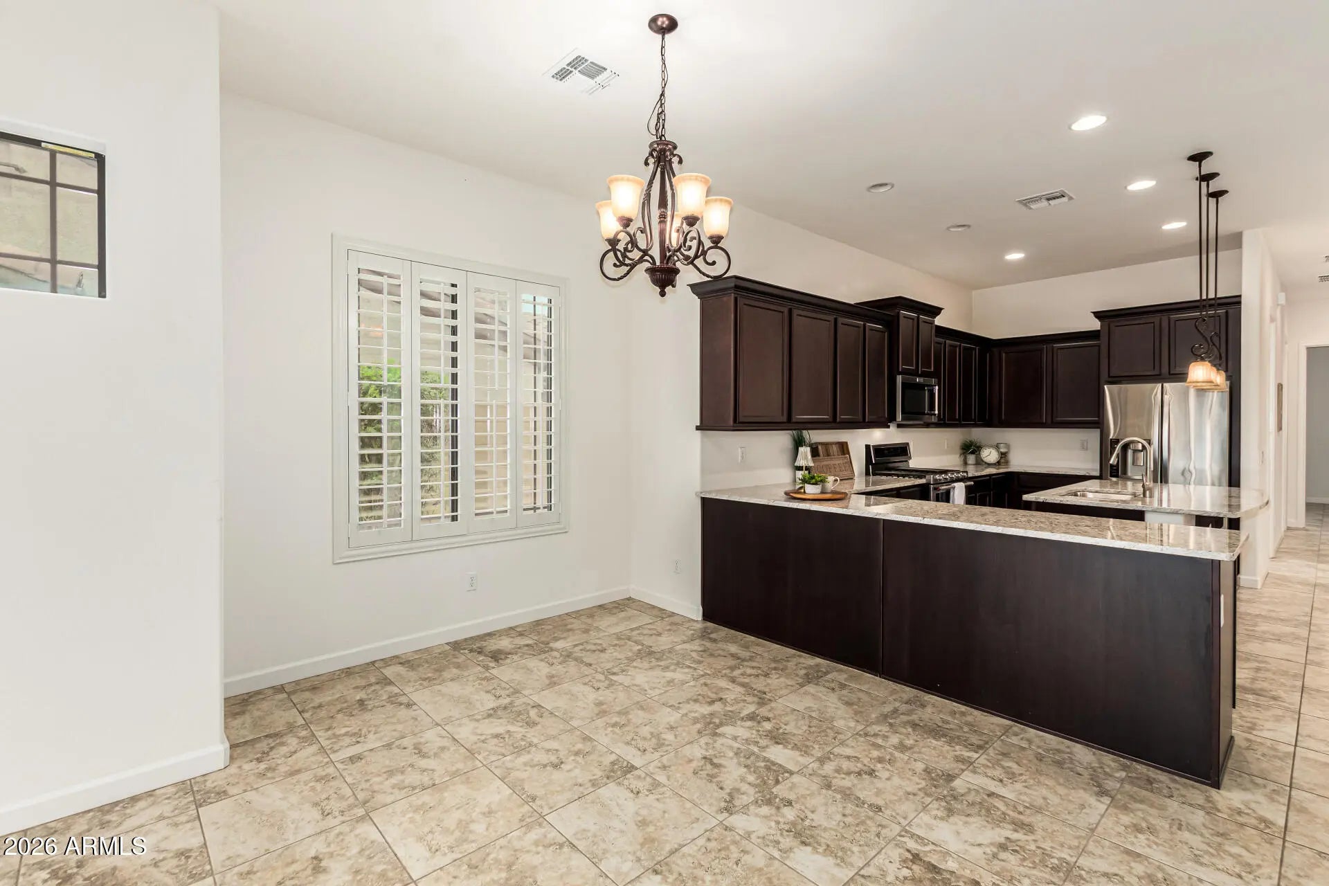 Welcome to this inviting single-story home located in the desirable gated Bellavia Mountain Bridge community, offering the perfect blend of comfort & resort-inspired living. Pride of ownership is clear, barely lived in home! This 3-bed, 2-bath home welcomes you through a light-filled entryway with immediate views of the private backyard. The open-concept living room flows seamlessly into the eat-in kitchen and dining space. The spacious kitchen features stainless steel appliances, granite countertops, abundant cabinetry, double ovens, and a breakfast bar for casual dining. Don't forget the added upgrade of plantation shutters throughout the home! Down the hall, you'll find a great laundry room complete with cabinetry, countertop space, and a large front-load washer and dryer. See more... Two additional bedrooms are thoughtfully located near the hall bath with a shower/tub combination, perfect for guests or family members. The split-bedroom floorplan offers privacy for the large primary suite, which features TWO walk-in closets, dual sinks, a private toilet room, and a walk-in shower. An oversized wall of glass opens to the backyard, creating an effortless indoor-outdoor space and providing the home with natural light. Step outside to a low-maintenance backyard designed for relaxation, featuring desert-friendly landscaping, a covered paver patio perfect for outdoor seating, and a firepit to enjoy Arizona evenings under the stars. Residents of Mountain Bridge enjoy access to the Community Center, offering resort-style amenities including a fitness center, pool tables, comfortable lounging areas, and two pools and two spas. Whether you're seeking full-time resort living or a lock-and-leave lifestyle, this home delivers the best of Arizona living in a premier gated community.