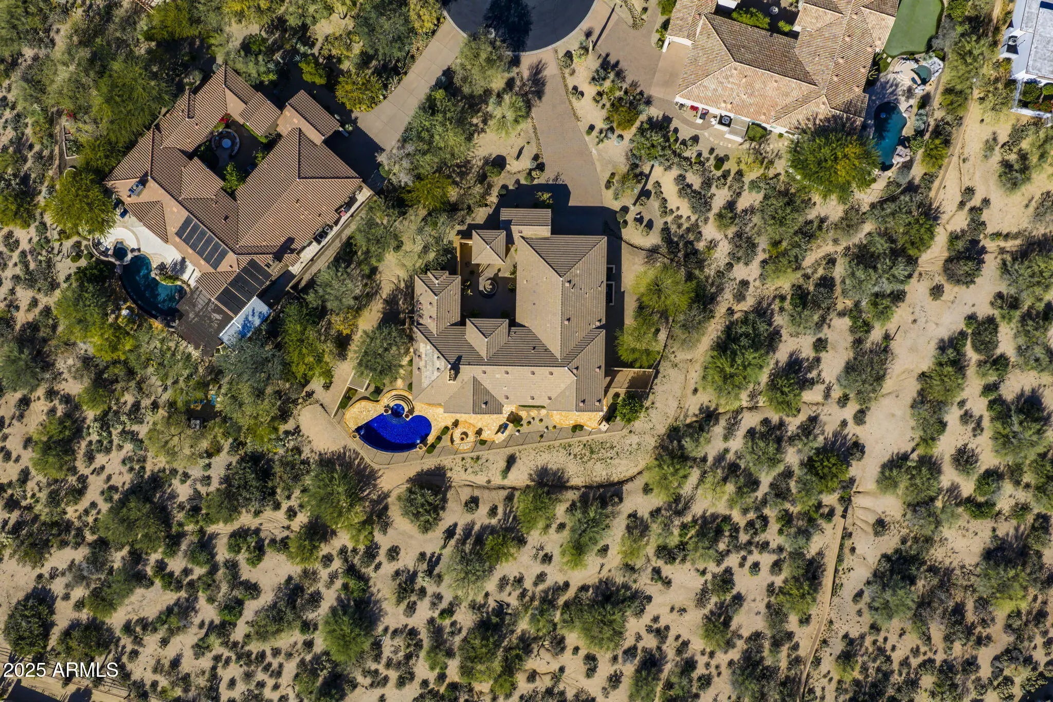Enjoy privacy, serenity, and striking desert views in this beautifully maintained residence within the gated Cresta Norte neighborhood, located along the Mirabel golf community in one of the area's most desirable and private settings. The large homesite is naturally buffered by designated Natural Area Open Space on the east and south sides, creating a quiet environment and a rare sense of openness. Dark Sky guidelines contribute to exceptional night skies and stargazing. A welcoming gated courtyard with fountain creates a memorable arrival. The thoughtfully designed, open floor plan includes three bedrooms, three-and-a-half bathrooms, and two flexible bonus spaces ideal for office, media, or hobby use and easily adaptable for additional bedrooms if desired. The chef's kitchen features stainless steel appliances, granite countertops, and opens directly to the family room, creating an ideal flow for everyday living and entertaining. Soaring 12-foot ceilings enhance the main living areas and the primary suite, while the remaining bedrooms and flex spaces feature 10-foot ceilings for comfort and scale. The resort-style primary suite offers a true retreat with a Jacuzzi® soaking tub, a spacious walk-in shower, and two walk-in closets. The backyard is designed as a private desert oasis, highlighted by a visually striking blue-tiled pool and spa with a knife-edge detail, water features, fire features, and a resort-inspired ambiance. A built-in BBQ, outdoor fireplace, and fire pit create multiple gathering spaces for entertaining or relaxing. Patio areas are enhanced with motorized solar shades, and the temperature-controlled single-car garage includes its own thermostat. Recent updates and improvements include a roof upgrade with new double underlayment (2021), two Trane split HVAC systems (2022), fresh interior white paint (2025), and exterior repainting (2023). Additional upgrades include a new water softener (2021) and updated pool and fountain equipment in 2024, featuring a new Pentair gas pool and spa heater, new pool pump, water-feature motor, and fountain pump. Appliance updates include a new dishwasher (2022), double oven (2021), and microwave (2023). The landscape irrigation system and landscape lighting were also updated in 2022. Additional conveniences include a Ring doorbell and a security system with Wi-Fi connectivity and remote operation (installed in 2021). This exceptional property offers a rare combination of privacy, open views, and refined desert living within a gated North Scottsdale community.