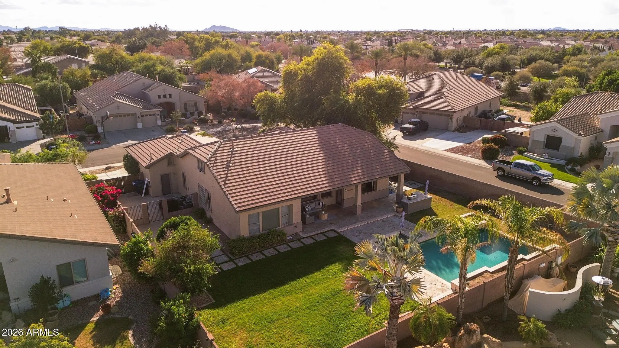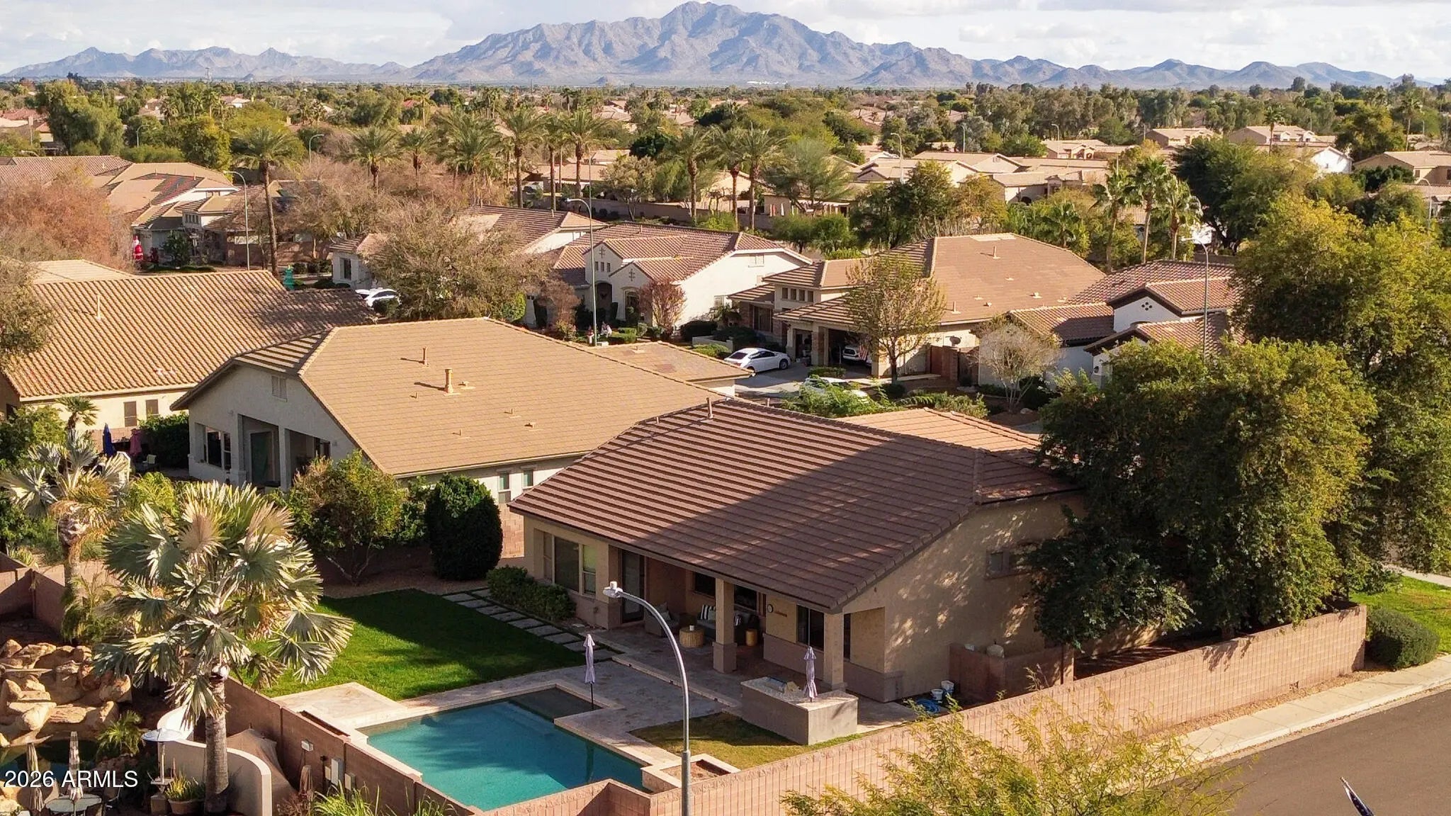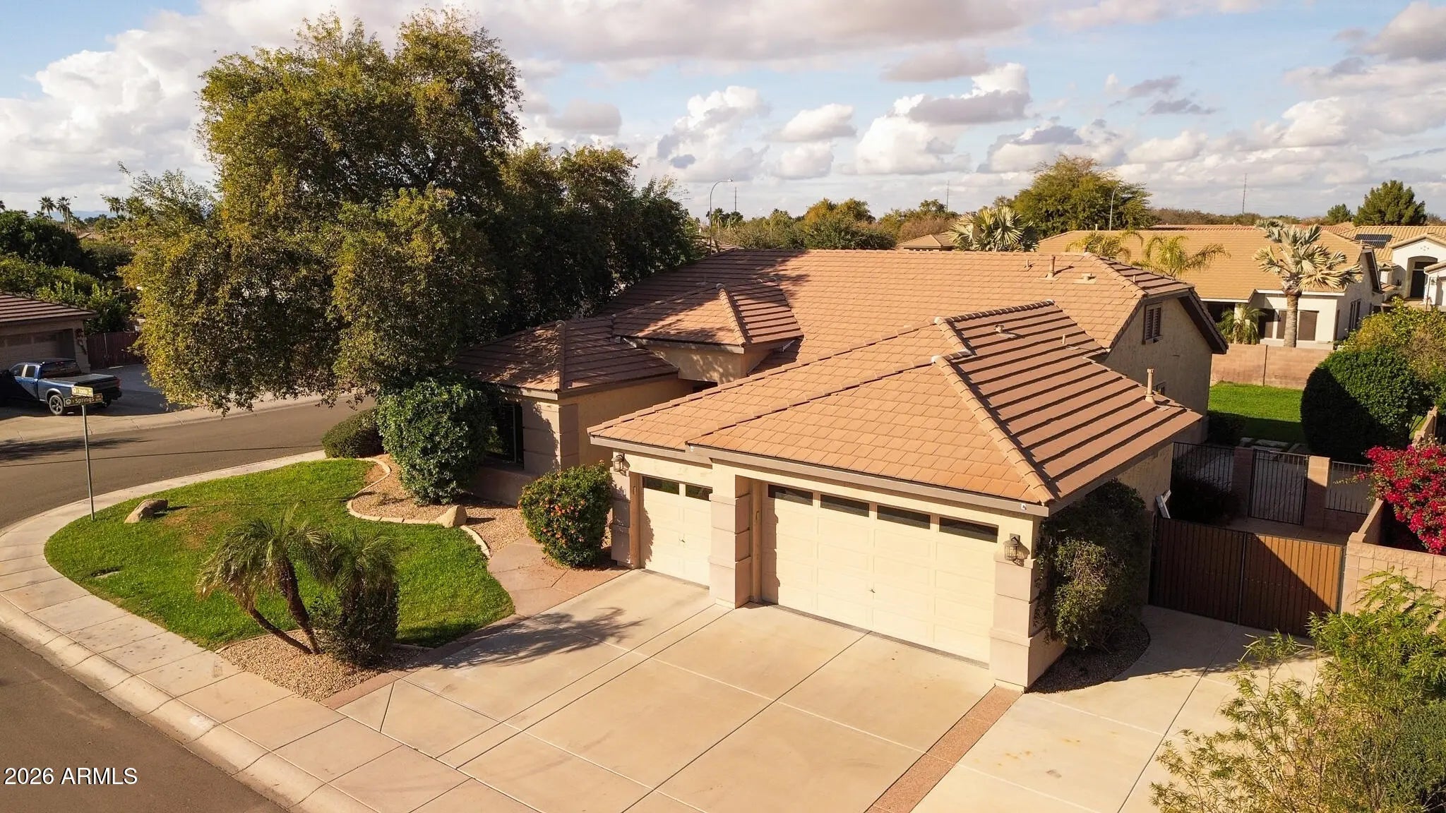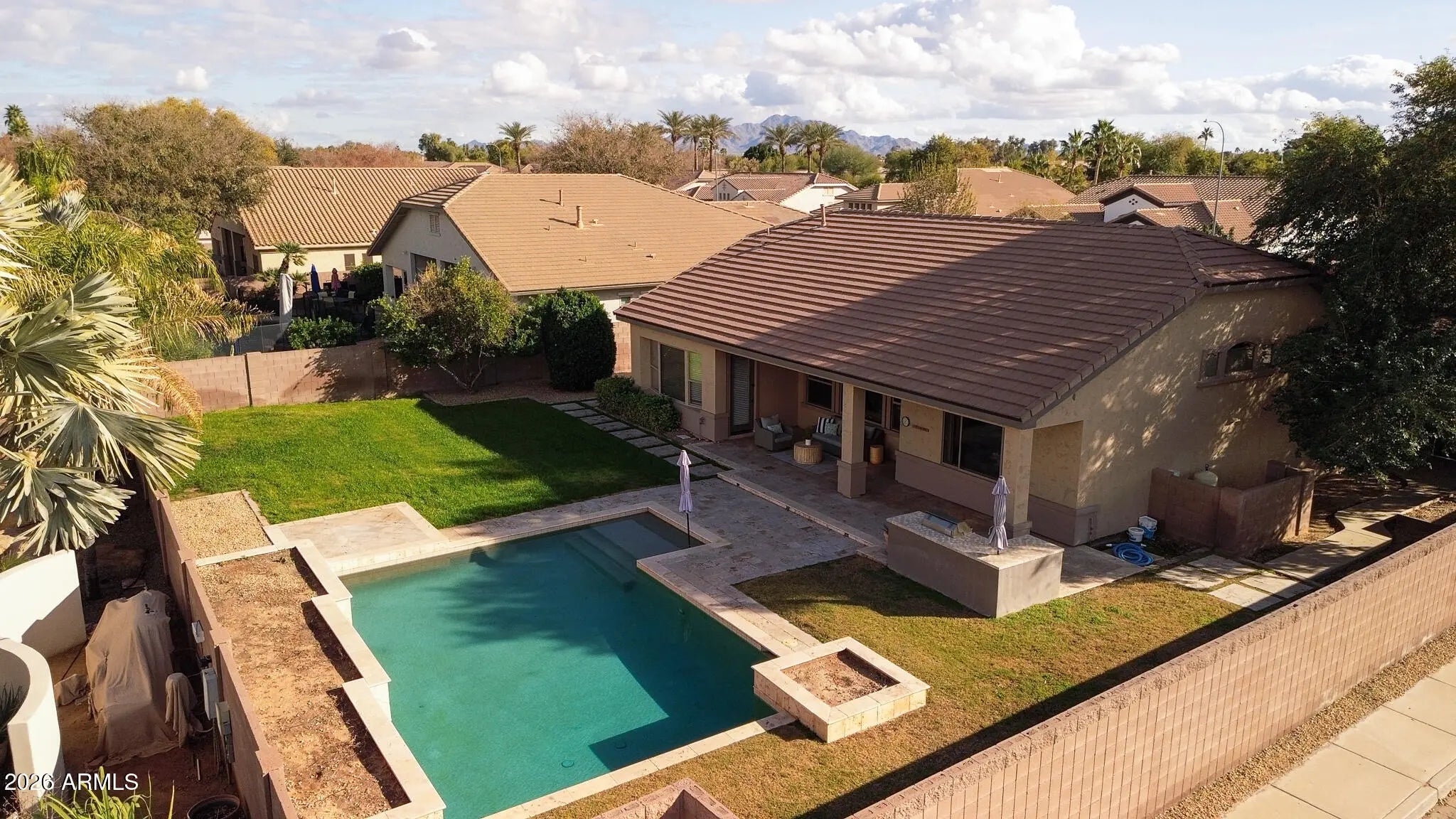 Professional photos coming 1/3! Nestled in the heart of South Chandler's sought-after Alamosa Estates, this Fulton-built 4-bedroom, 2.5-bath home offers space, style, and function. The split floor plan provides privacy, with a versatile 4th bedroom or flex space. Enjoy 2,336 sq ft of open-concept living highlighted by a chef's kitchen with a large island, refinished white cabinetry, quartz countertops, matte black hardware, brand new water softener, and dramatic 16-ft vaulted ceilings. Situated on a 12,030 sq ft corner lot, the home features a 3-car garage with epoxy flooring and storage cabinets, RV gate, and slab parking. The backyard is an entertainer's oasis with a Pebble Sheen pool, Baja step, travertine decking, built-in BBQ, and generous side yards. Renovated in parking, or sport court potential. Renovated in 2024 the home has neutral paint throughout, refreshed bathrooms, and zebra shade window coverings. New roof in 2023.