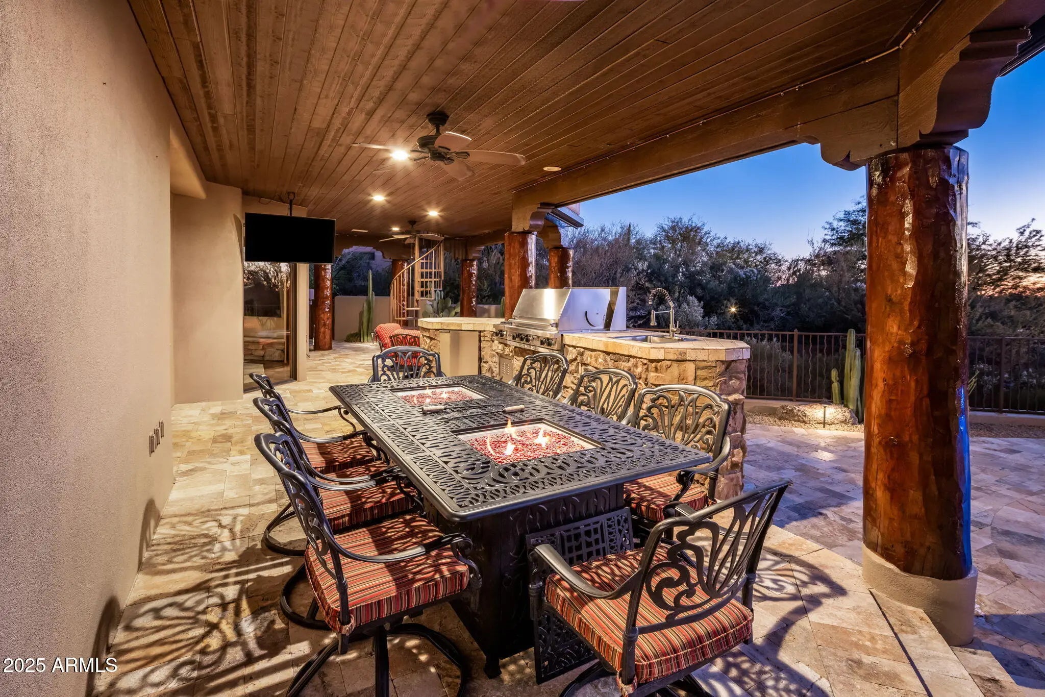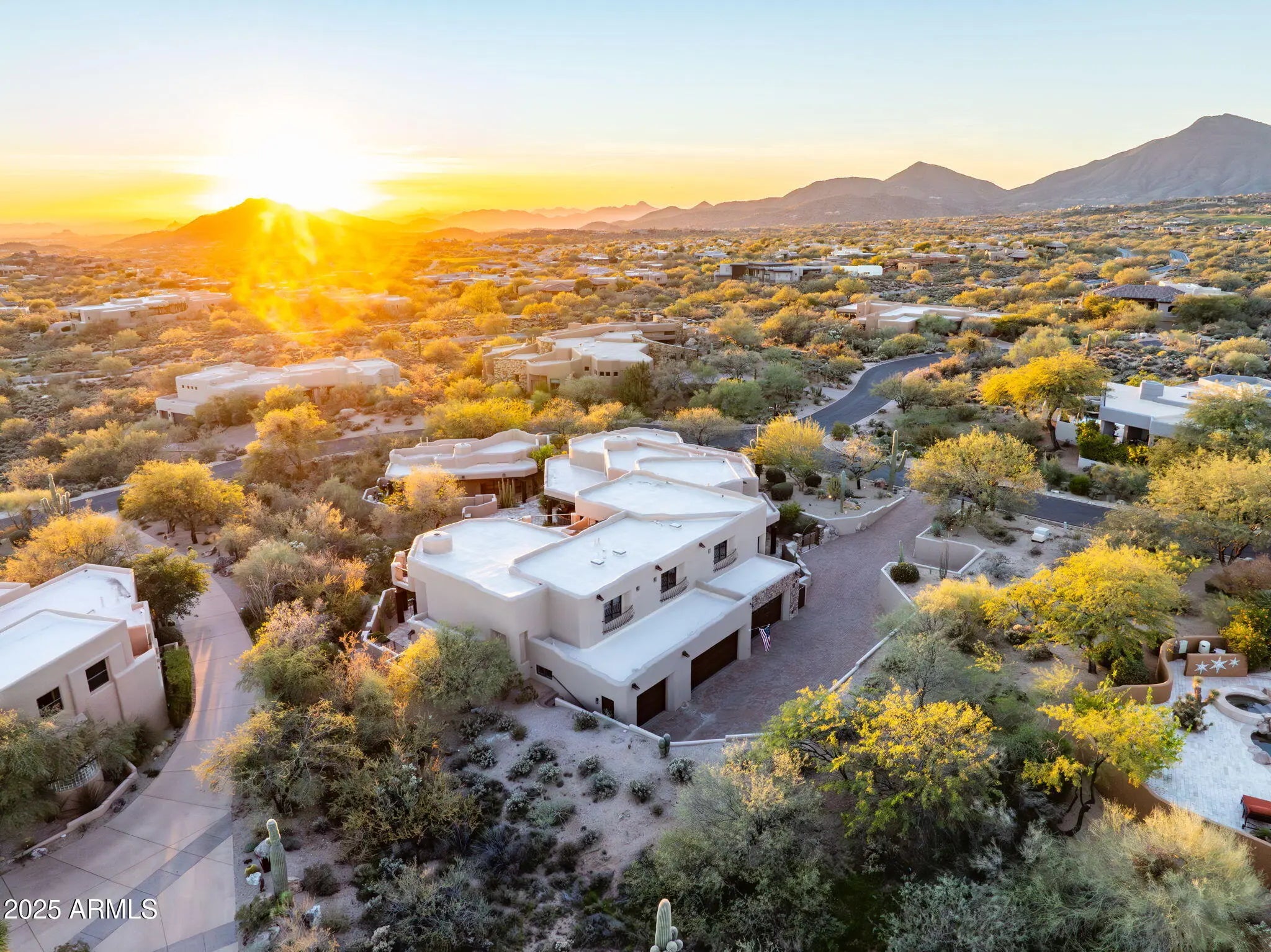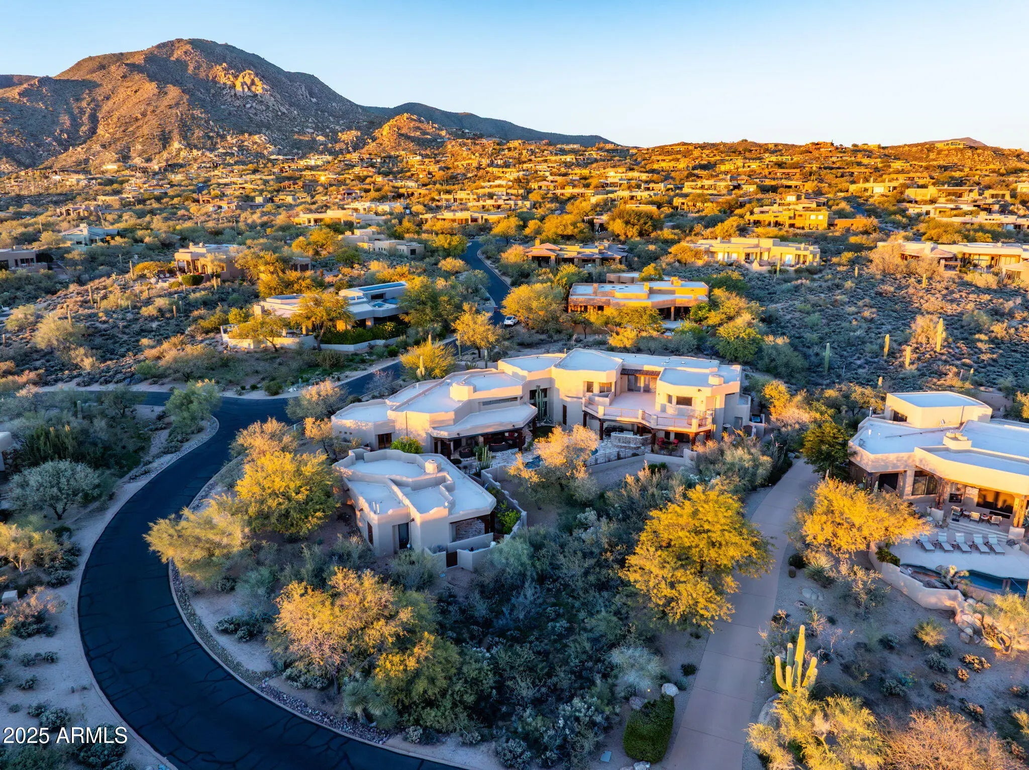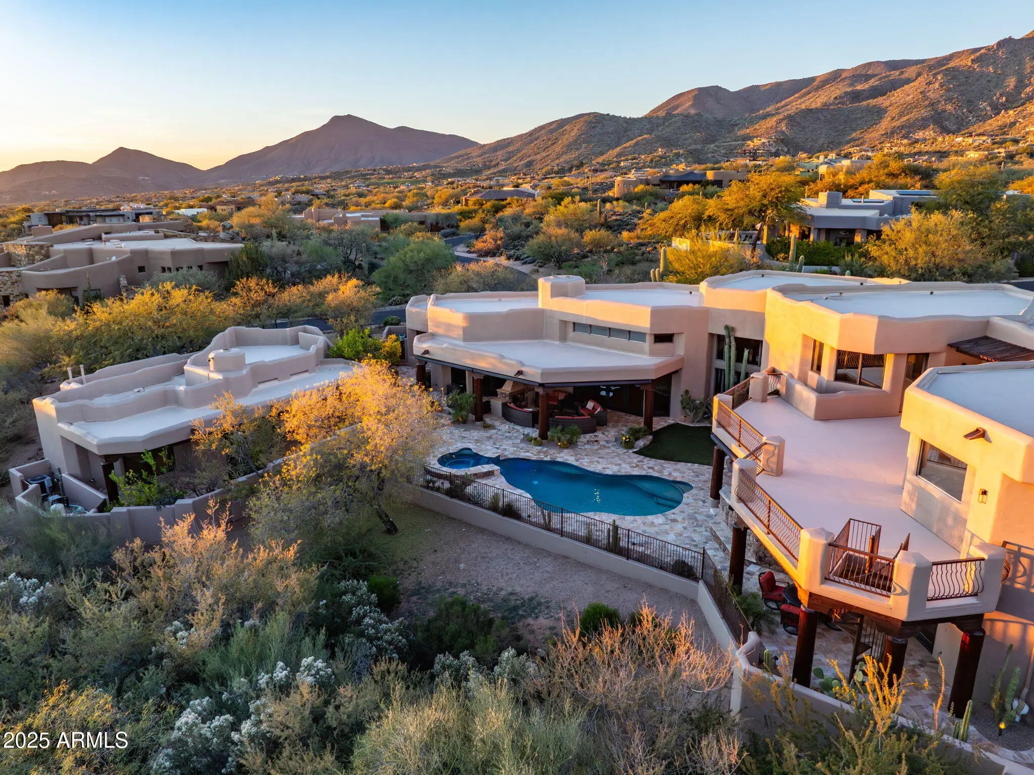 Priced well below recent appraisal. Rare Lifestyle / Social Membership Available. Nestled in prestigious Apache Peak Village within the highly sought-after, guard-gated golf community of Desert Mountain, this 9,004 sq ft estate offers true resort-style living at approximately 3,300 feet elevation—typically enjoying temperatures about 10 degrees cooler than the Phoenix valley below. Completely renovated and truly turnkey, the home showcases top-tier finishes and upgrades throughout. The showpiece chef's kitchen features a 60'' Thermador gas range with oven and warming drawer, additional Thermador double ovens and microwave, an oversized glass-door Sub-Zero refrigerator and freezer, two Sub-Zero ice makers (including one in the bar), Miele dishwasher, built-in Wolf coffee system, and built-in Napa wine system. A large walk-in pantry, custom alder cabinetry, granite countertops and backsplash, and an oversized granite island complete this entertainer's dream space. Expansive French doors along the back of the home open to two large resort-style patios, creating seamless indoor/outdoor living. A full outdoor kitchen includes a large Viking grill and stove, plus a Senora beverage refrigerator, ideal for al fresco dining and entertaining. Professionally landscaped grounds include all-new landscape lighting and irrigation, a refinished Pebble Sheen pool with spillover spa and glass tile, new pool equipment with IntelliTouch controls, and multiple seating and lounging areas. Outdoor living is enhanced by a dramatic see-through fireplace, electric patio blinds, and a misting system that can drop the temperature by approximately 20 degrees in minutesperfect for year-round enjoyment. The main residence offers 5 bedrooms (including two primary suitesone on the main level and a junior primary upstairs), 5 full bathrooms and 2 half baths. One oversized bedroom is currently used as a gym, and the gym equipment conveys. Additional interior highlights include: fully electric blackout shades in all 5 bedrooms and along the rear living spaces; a Control4 home automation system with touch-screen and smartphone/tablet control; an elevator to the second floor; a main-floor office with full-wall built-in shelving; a luxurious primary bath with large steam shower, Bluetooth stereo, LED lighting, and car-wash-style shower heads and mister; a large accessory closet off the primary bath; a whole-home water filtration system; and a full home security system with cameras. The property also offers an oversized 5-car garage, with the fifth bay ideal for a workshop or additional storage. Tech-forward conveniences include myQ garage door control and the ability to view all five parking spots via your smartphone. Exterior renovations include a completely redesigned front entry and rear patios, with pool decking finished in travertine. The home has been freshly painted inside and out, and the roof was resurfaced in 2025. Major systems have been significantly updated with three new water heaters and five newer HVAC systems, making this a move-in-ready, low-maintenance luxury residence. A separate 1,100 sq ft stand-alone casita provides ideal guest or multigenerational living, offering a large bedroom, two full bathrooms, full kitchen, dining area, living room, its own patio, and a rooftop observation/seating deck. The casita's yard features lush fruit trees, including plum, peach, lemon, and orange. This exceptional estate is priced below market value for Desert Mountain, with motivated sellers and an optional, highly sought-after Desert Mountain lifestyle club membership available. A must-see for buyers seeking a fully renovated, tech-savvy, resort-style home in one of Scottsdale's premier golf communities.