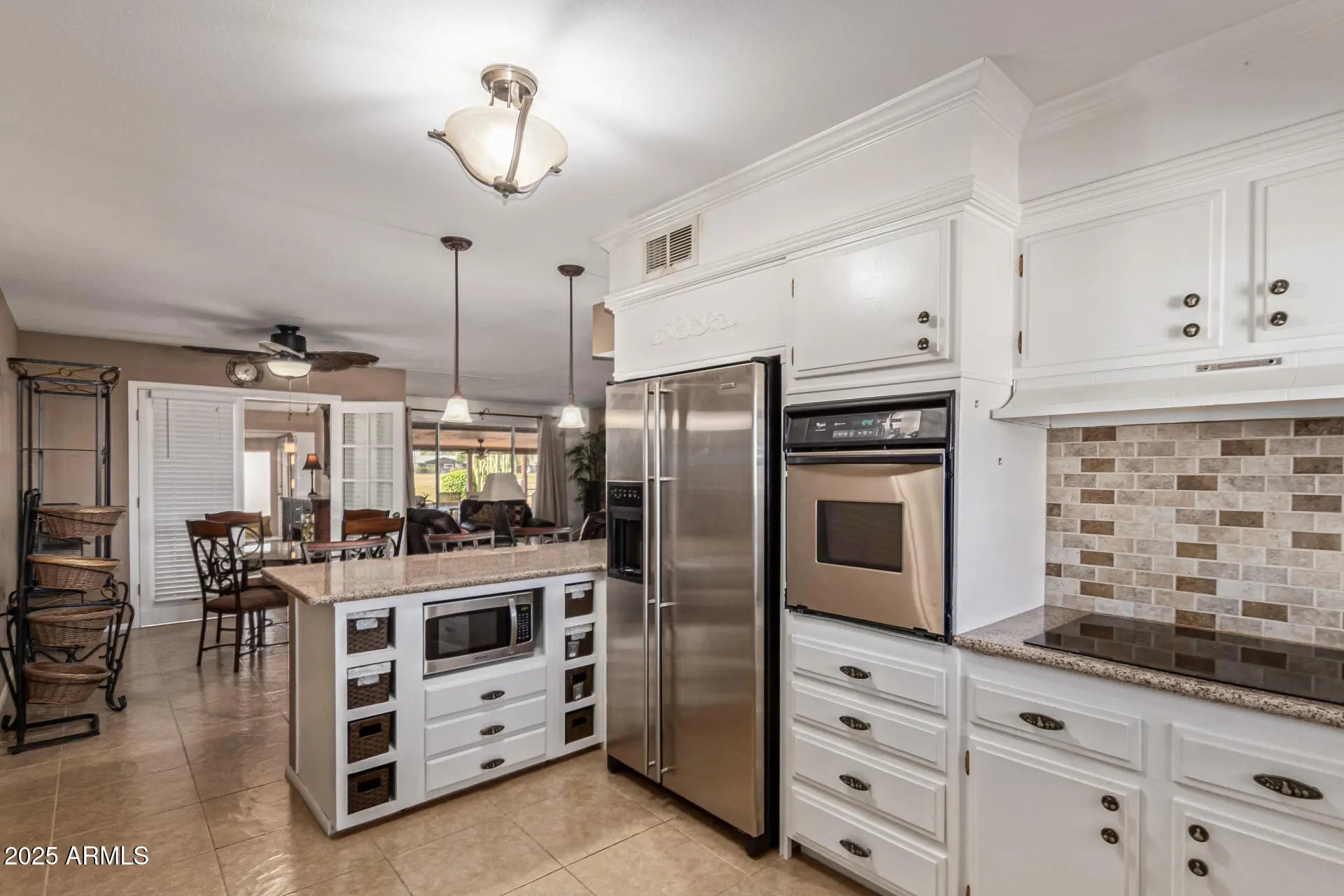 Experience the best of Sun City! This inviting 3-bedroom home offers a bright and serene living room with a soothing color palette and tile flooring for easy care. A cozy family room provides the perfect space for relaxing or spending quality time. The eat-in kitchen is thoughtfully designed with granite countertops, white cabinetry with crown molding, pendant lighting, a tile backsplash, stainless steel appliances, and a peninsula with a breakfast bar—ideal for casual dining and entertaining. The spacious primary bedroom features soft carpeting and a private bathroom for added comfort. The Arizona room has been fully finished, creating additional versatile living space. Step outside to the covered patio while taking in tranquil golf course views. Don't forget the abundance of amenities!