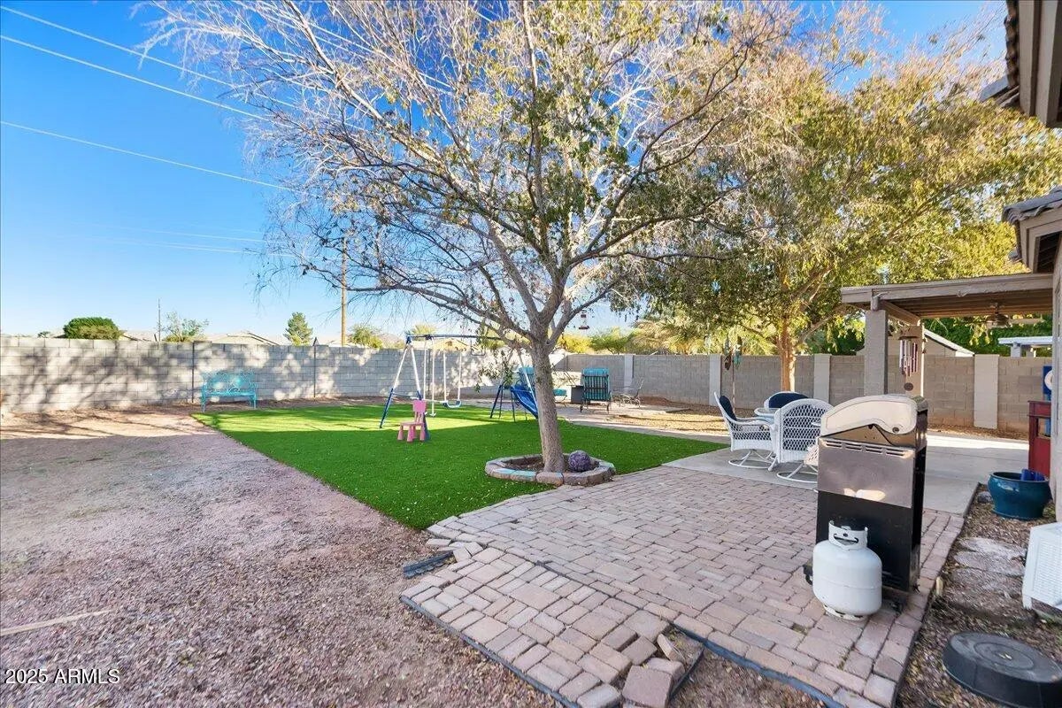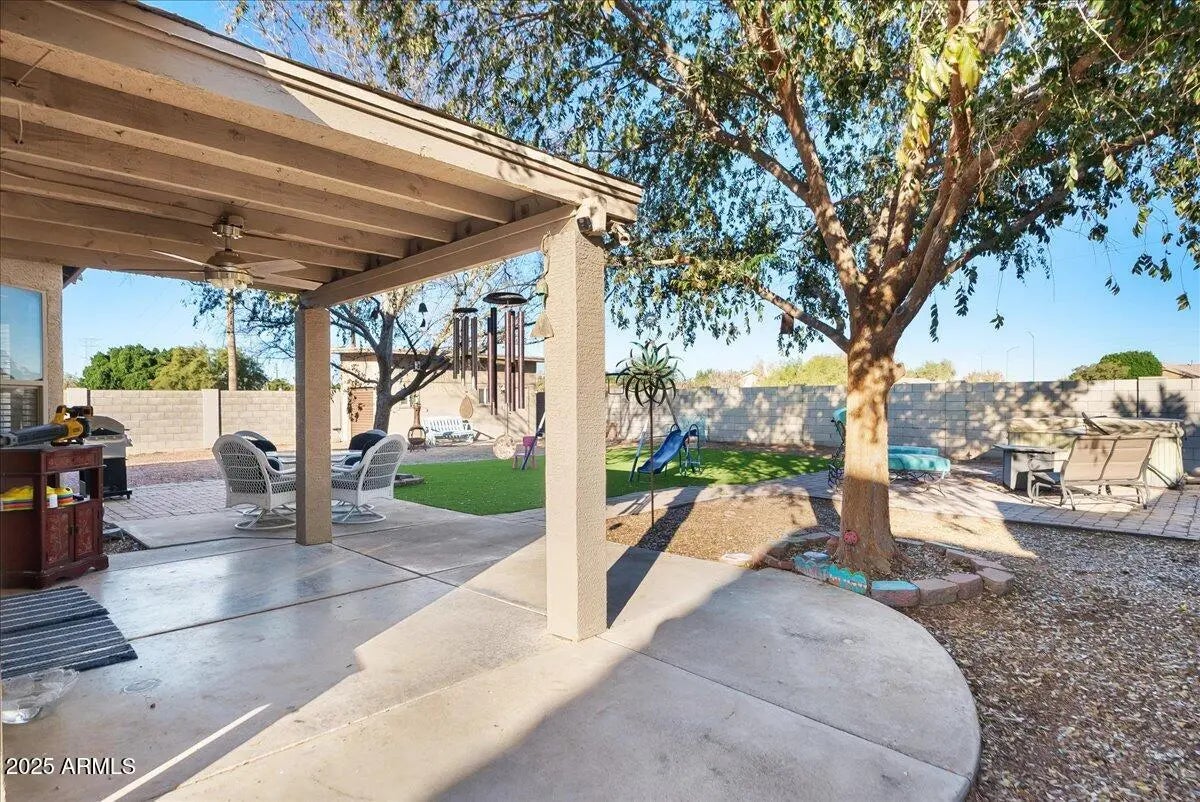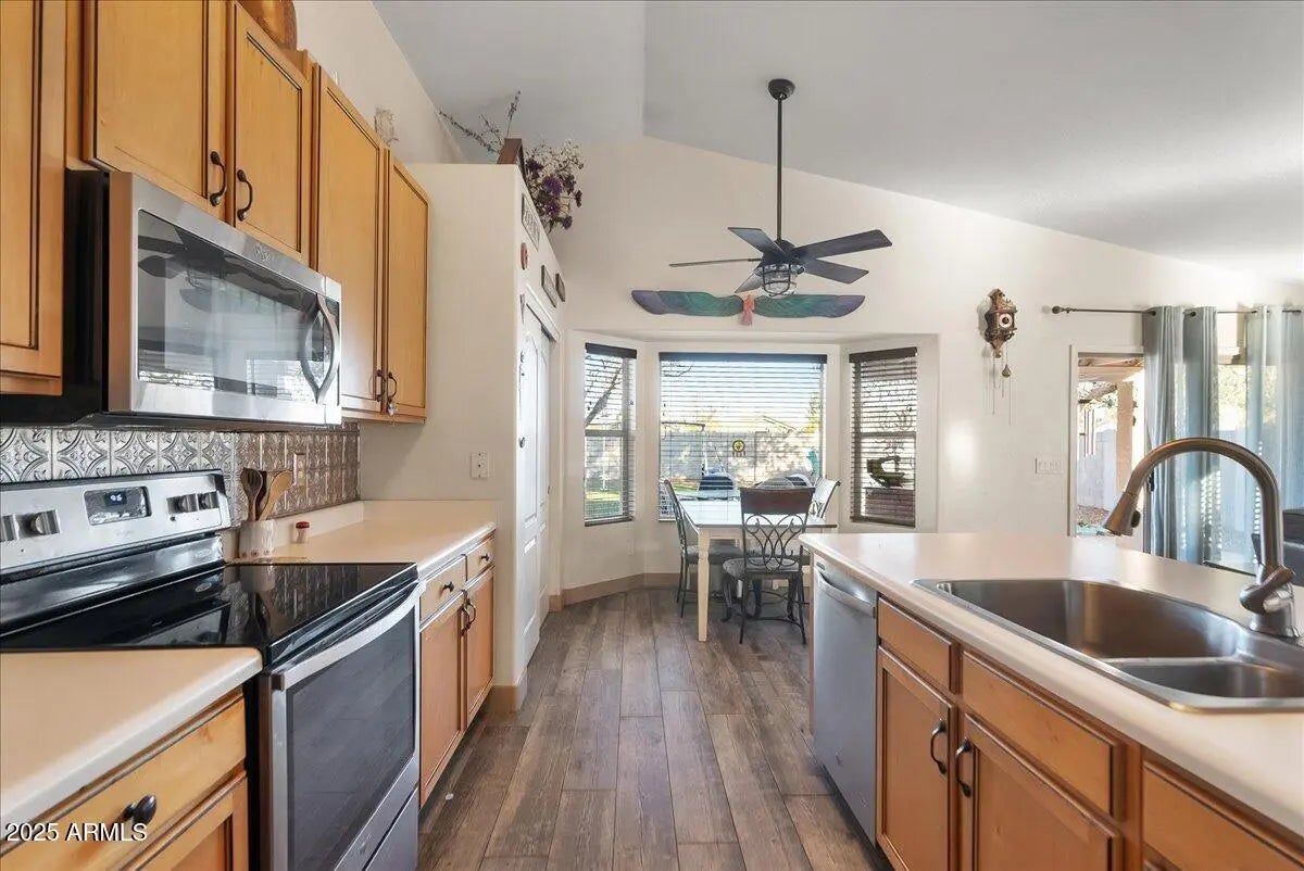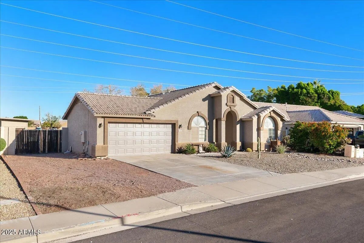 Must-see Mesa home offering 4 bedrooms and 2 bathrooms on a generously sized north/south-facing lot backing to a greenbelt. This exceptionally well-maintained property features wood-plank tile flooring throughout, an RV gate, and no HOA. The kitchen boasts light wood cabinetry, stainless steel appliances, and a double-door pantry. The RV gate opens to a large side yard with ample space for parking toys, complemented by a 10x20 storage shed with attic storage. The garage includes 220V hookup, ideal for projects or equipment. Recent exterior paint adds to the home's curb appeal. Enjoy convenient access to Loop 202 just three minutes away and proximity to a top-tier school district. A rare opportunity combining space, functionality, and location—welcome home. $5k Allowence for Upgrades or CC