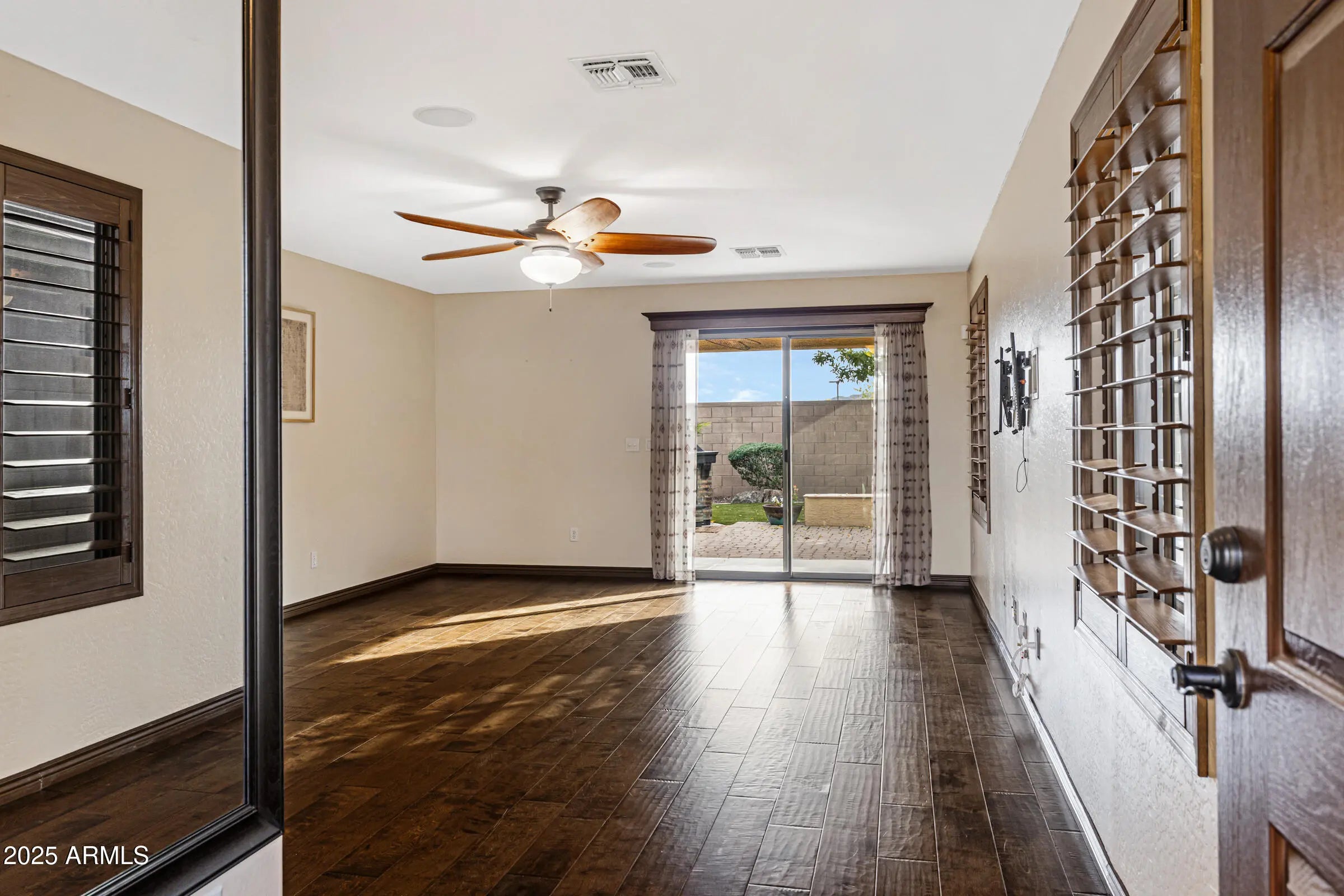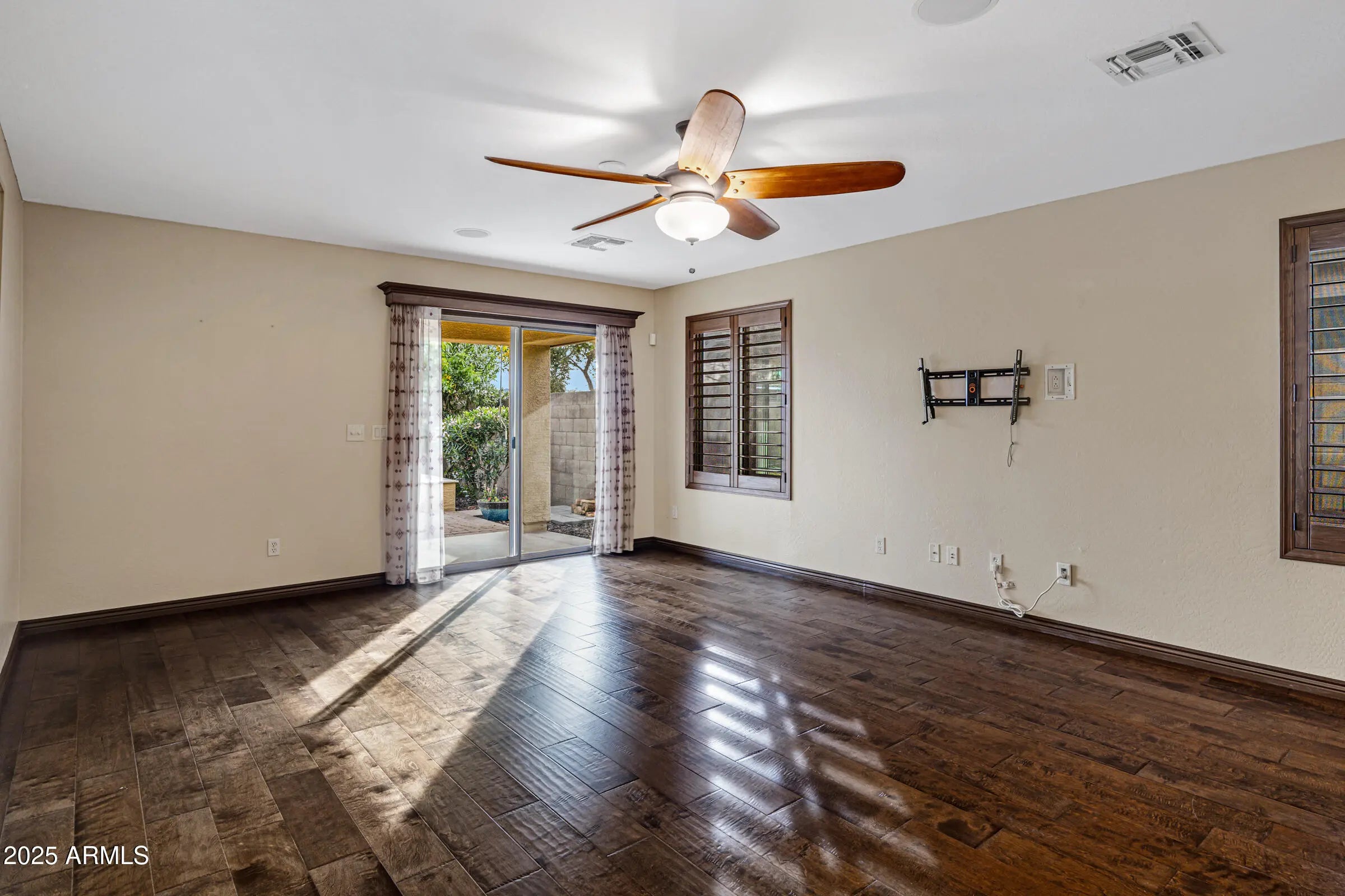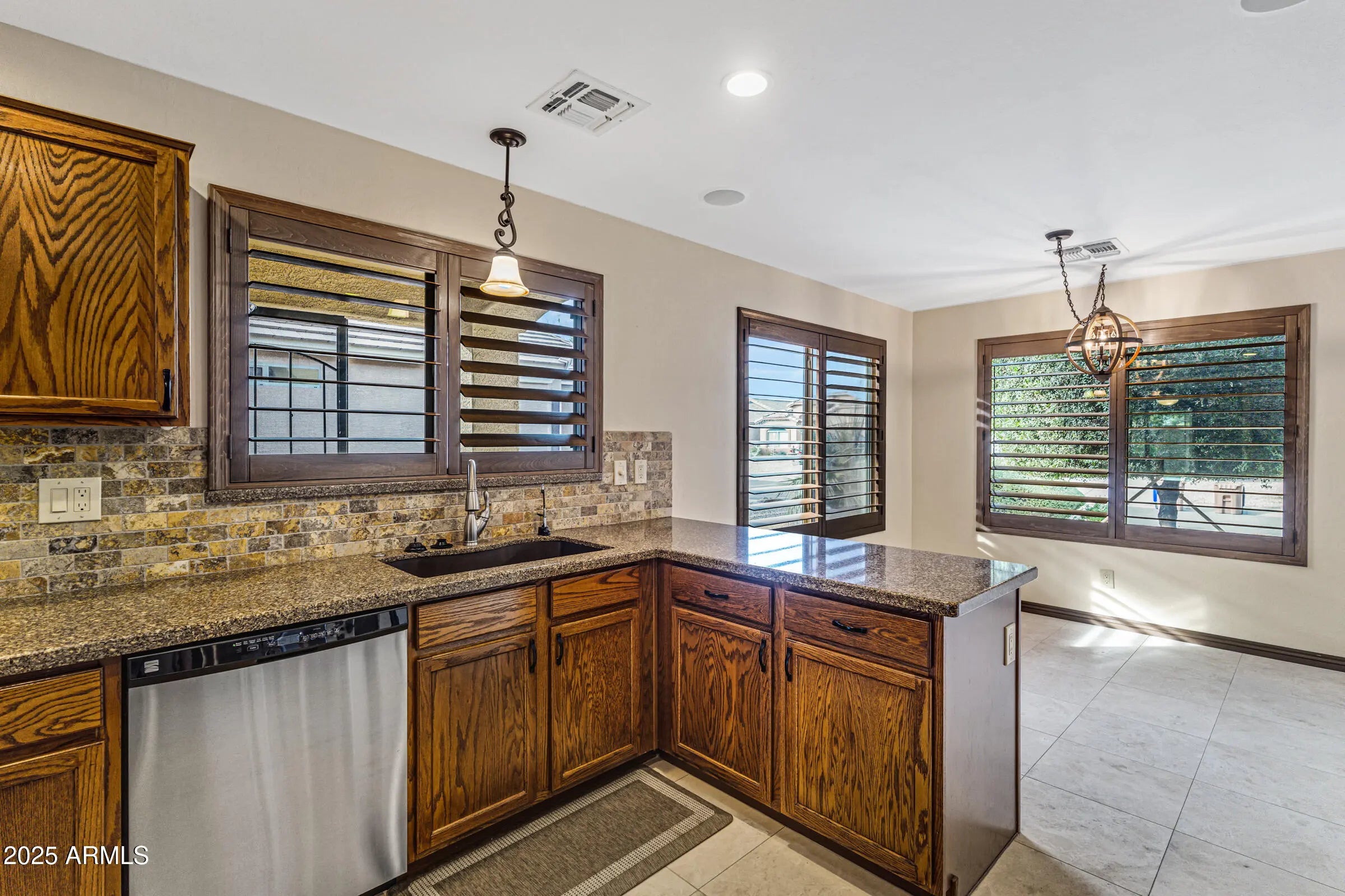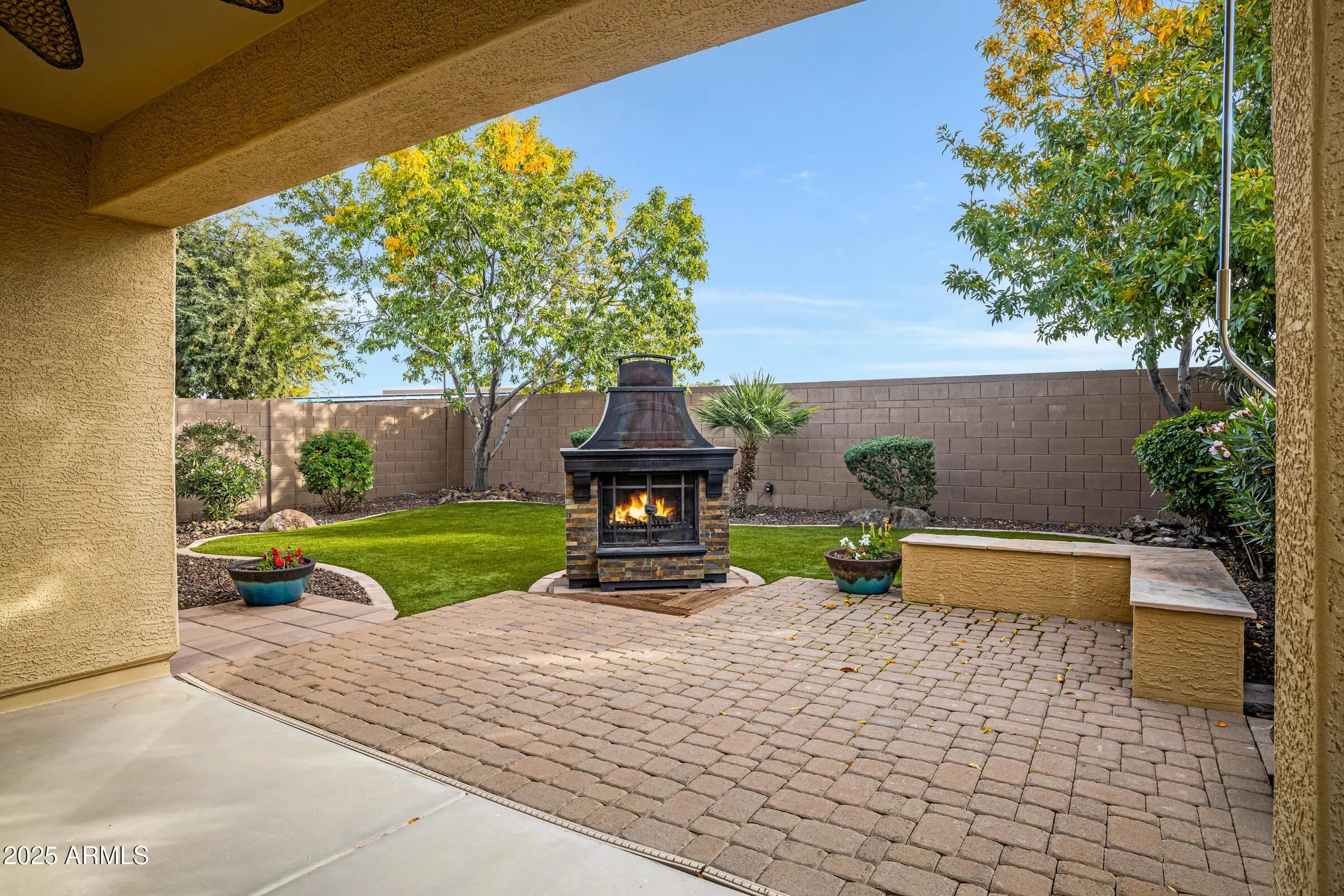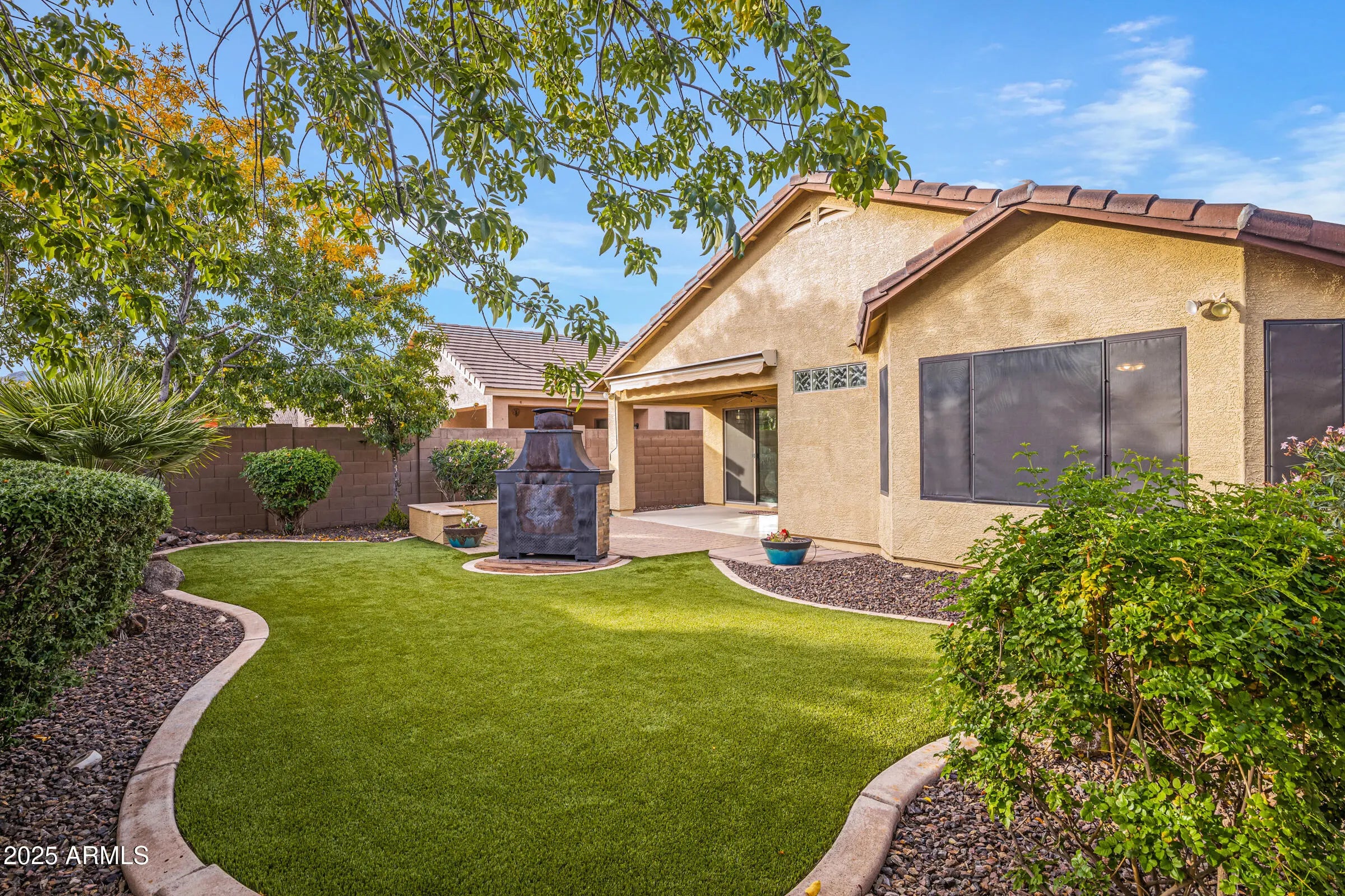 Welcome home to this beautifully maintained 3-bed, 2-bath home in desirable San Tan Heights. Pride of ownership shines throughout the 1,343 sq ft of thoughtfully designed living space. Real hardwood floors and real wood plantation shutters enhance the living areas. The kitchen features quartz countertops, travertine tile flooring and backsplash, recessed lighting, stainless appliances, and a bright breakfast nook with chandelier. The spacious primary bedroom overlooks the backyard oasis. Enjoy mountain views and no neighbors behind in the entertainer's backyard with covered patio, extended pavers, electric shade awning, built-in bench, and brick fireplace. Lush turf, mature trees, and desert landscaping create a serene retreat. Additional features include epoxy garage floors, sunscreens