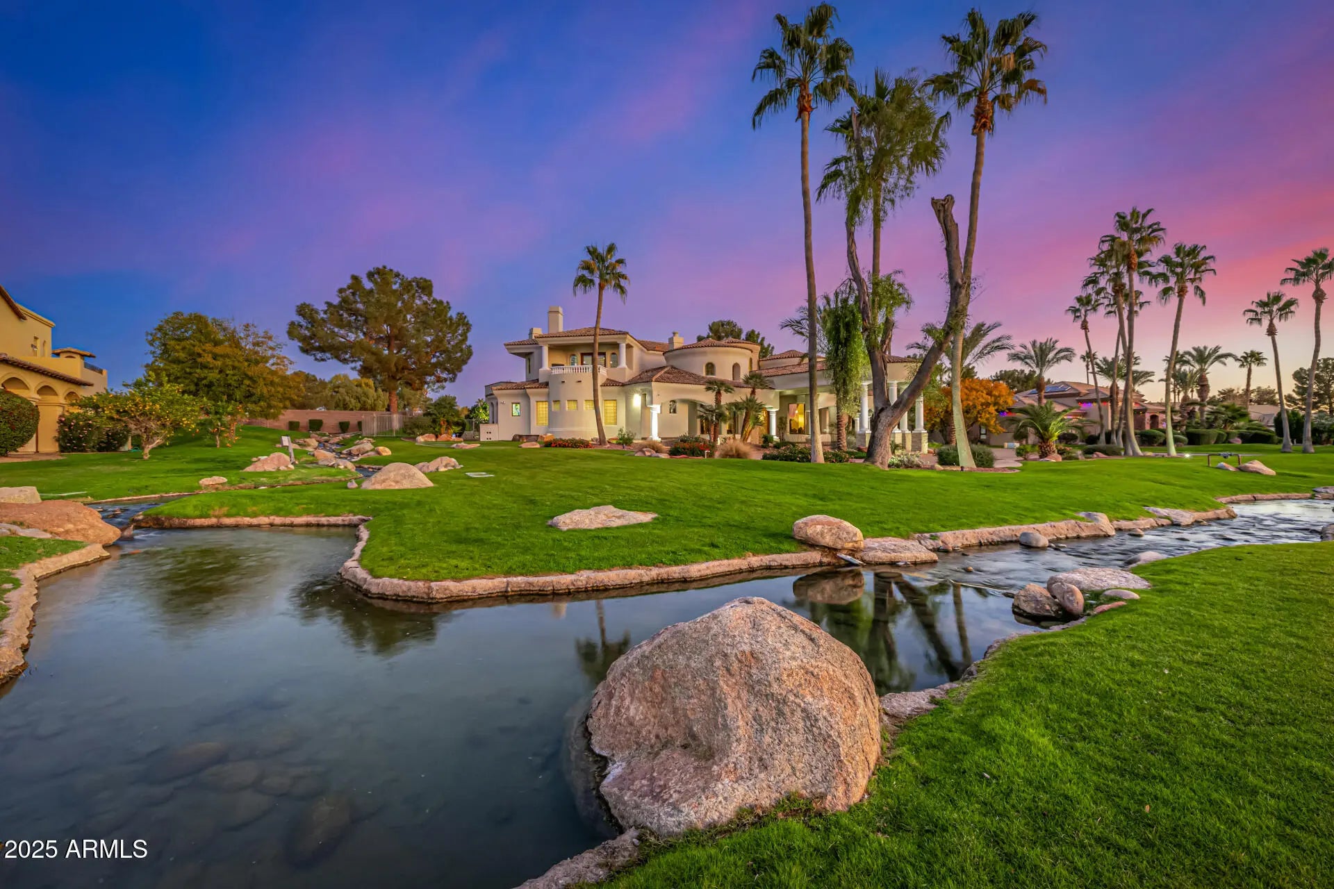 Introducing The Sunset Villa - a private retreat in Oakwood Hills. Tucked within one of Chandler's most exclusive and secluded gated enclaves, this extraordinary lakeside estate offers a level of privacy, scale, and architectural presence rarely found in the area. Set on over an acre with sweeping water and elevated patio views, this is not just a home--it's a private retreat designed for those who expect more. Backing to a golf course, the property enjoys an added layer of privacy and open space, with elevated patios providing scenic vistas beyond the wall--creating separation without sacrificing seclusion.From the moment you arrive, the circular drive and grand portico create a sense of arrival that feels both elegant and unforgettable. Inside, a dramatic rotunda foyer opens to soaring ceilings, refined architectural details, and walls of glass that immediately draw your eye to the tranquil backyard, where water, greenery, and sky come together in perfect harmony. Designed for both grand entertaining and everyday living, the heart of the home is an expansive great room that seamlessly connects to a chef's kitchen outfitted with professional-grade appliances, oversized island seating, and thoughtfully designed gathering spaces. Whether hosting a dinner party or enjoying a quiet morning, every space feels intentional and inviting. Upstairs, a game and billiards loft with wet bar opens to The Sunset Patio--an ideal vantage point for taking in Arizona's iconic sunsets over the water. Downstairs, a true luxury amenity awaits: a fully customized theater experience that rivals commercial cinemas, complete with tiered seating, immersive sound, and rich architectural detail. The primary suite is a retreat within the home itself--featuring a private sitting room, fireplace, spa-inspired bath, and dual custom closets designed for both comfort and function. Secondary bedrooms are generously sized, each with en suite baths and positioned for privacy. Step outside and the property transforms into a resort-style sanctuary. A beach-entry pool with slide, elevated spa, multiple fireplaces, outdoor kitchen, and expansive entertaining areas are surrounded by lush landscaping, lake views, and the rare sense of space that defines Oakwood Hills. This is a neighborhood unlike anything else in Chandler--where winding water features, mature trees, and expansive green spaces create an environment that feels worlds away while remaining close to everything. South Chandler offers an exceptional quality of life, with proximity to the Price Road Corridor, top-rated Chandler Unified schools, and a vibrant lifestyle that includes year-round sunshine, parks, golf, and premier shopping and dining. For those seeking privacy, presence, and a home that stands apart--this is a rare opportunity.