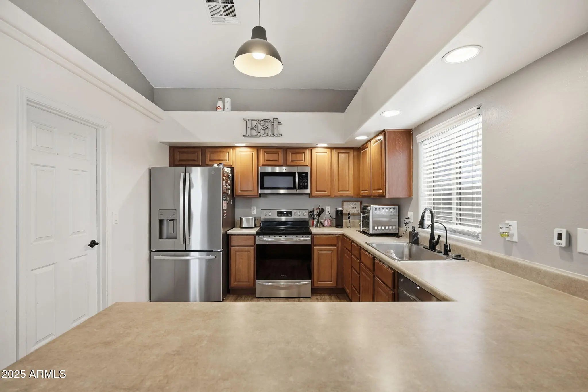 This is the kind of home that instantly feels welcoming. With no HOA and a bright, open layout, this 3-bedroom, 2-bath home is made for comfortable everyday living. Vaulted ceilings, thoughtful wall niches, and upgraded fixtures add character without feeling overdone. The kitchen opens easily to the living space and includes a breakfast bar and all appliances—perfect for busy mornings or casual dinners. The primary suite offers a true retreat with a walk-in closet, dual vanities, and a private toilet room. You'll also appreciate the oversized laundry room with plenty of storage. Out back, unwind under the covered patio while enjoying a fully fenced, beautifully landscaped yard. A 2-car garage with recessed lighting and EV charging completes the package. Move-in ready and easy to love.