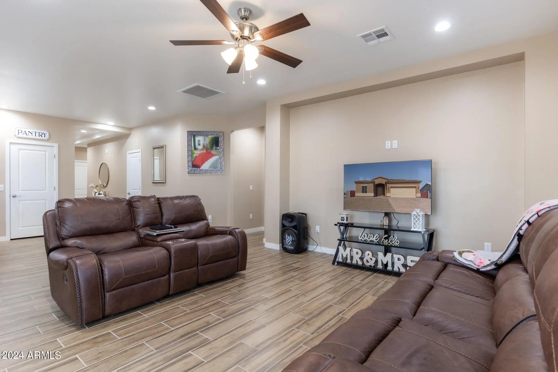 Are you looking for a home with all of the Custom touches, but not in a Custom price range? This home features a modern neutral color scheme as you step into this fantastically designed home with Wood Grain tile, ceiling fans throughout, RV Gate and Parking, and paver driveway with paver walkway entry. Tile Roof for longevity. 2 Car garage. Open floorplan boasts ample space and the split floor plan gives you privacy as well. Beautiful white cabinets and an Island anyone could appreciate! The primary bedroom includes a spacious walk-in closet for ample storage, and a separate toilet room. The kitchen boasts new stainless steel appliances, perfect for any home chef. This home is a MUST SEE. Style, Charm, and everything in between.
