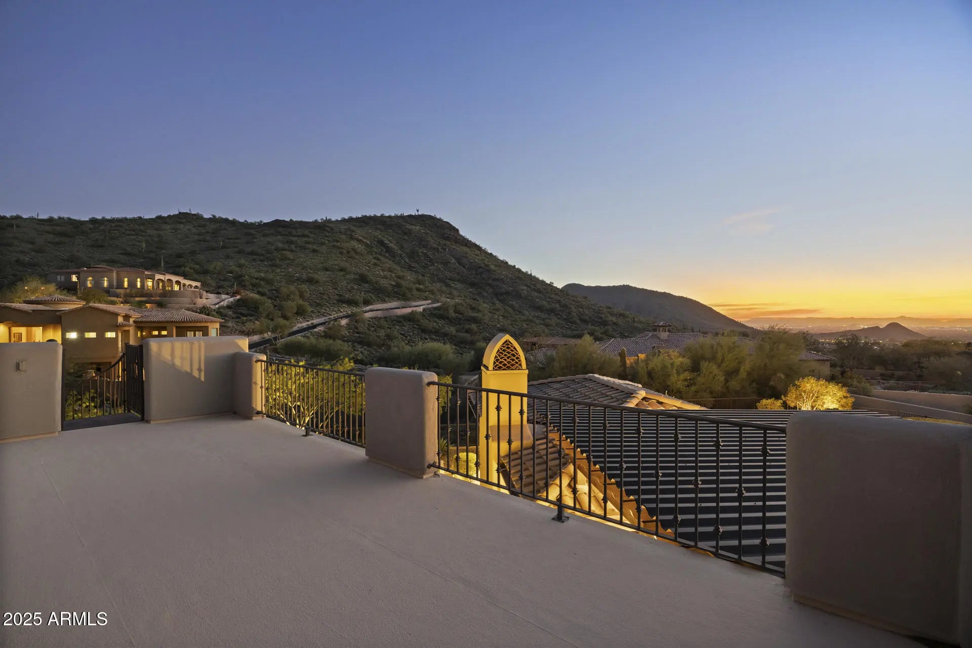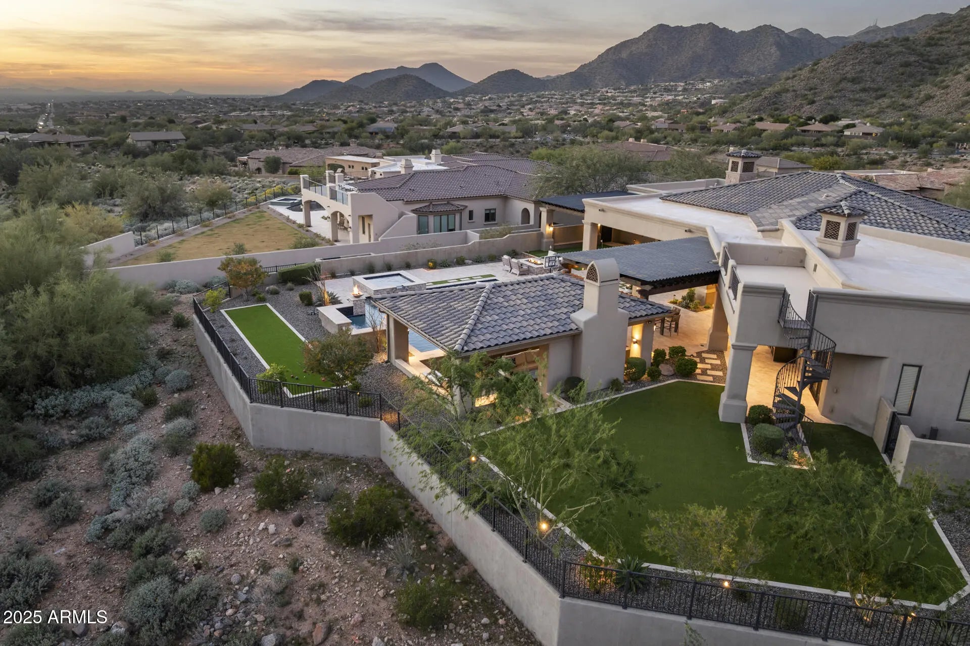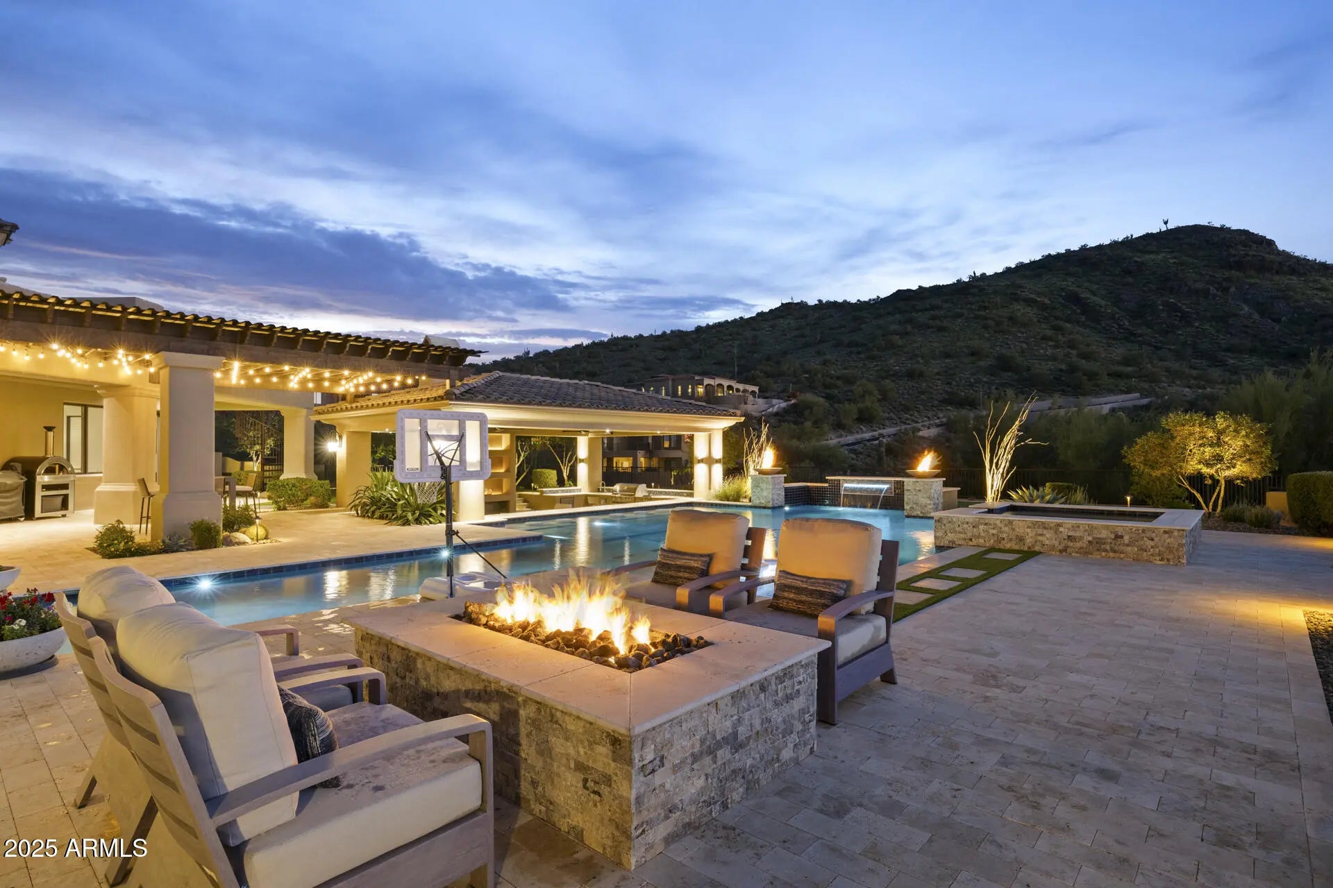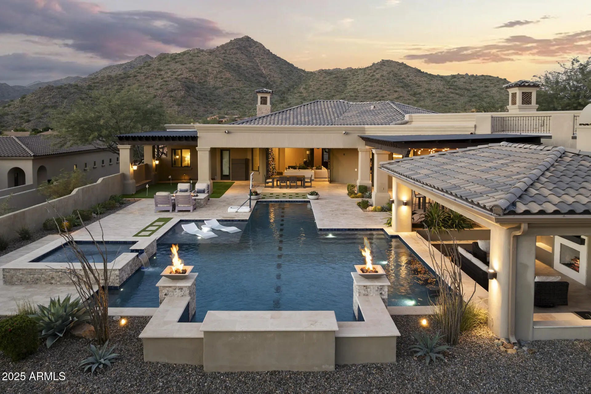 From the rooftop deck to the stunning backyard, this home was designed for entertaining while enjoying the surrounding desert and mountains and absolutely nothing has been left on the drawing table regarding finishes, amenities and design. Every bedroom has its own bathroom and the primary suite is amazing with the views, large fireplace and oversized walk-in closet. A walk-in shower boasts two showerheads, and the soaking tub is the perfect place to end the day. The family room blends seamlessly with the kitchen and the outdoors, making it the most popular indoor space when hosting family & friends. Double islands, a Wolf gas range, SubZero fridge & freezer and steam oven are only a few of the luxury amenities in the kitchen & eat-in area which bring the outdoors in with a large picture window & glass door. A wet bar finishes the area and adds more warmth to an already cozy and warm space while providing that perfect extra touch to a home designed for welcoming guests. The gas fireplace in the family room is a gorgeous focal point as are the detailed ceilings and other architectural highlights. As you enjoy the play pool, your family and friends will delight in hanging out on the bocce court, putting green or in the outdoor kitchen & family room backdropped by the mountains and a swim up bar. Multiple gathering areas are available for play, dining or just hanging out...because where else would you rather be than under the gorgeous Sonoran Desert sky while in the comfort of your own home? Hidden Hills is a desirable North Scottsdale gated custom luxury home community nestled in the McDowell Mountain foothills. It is close to hiking trails, golf courses, schools, parks, shopping, dining and entertainment. Homes like this don't come along often, so don't wait on this one!