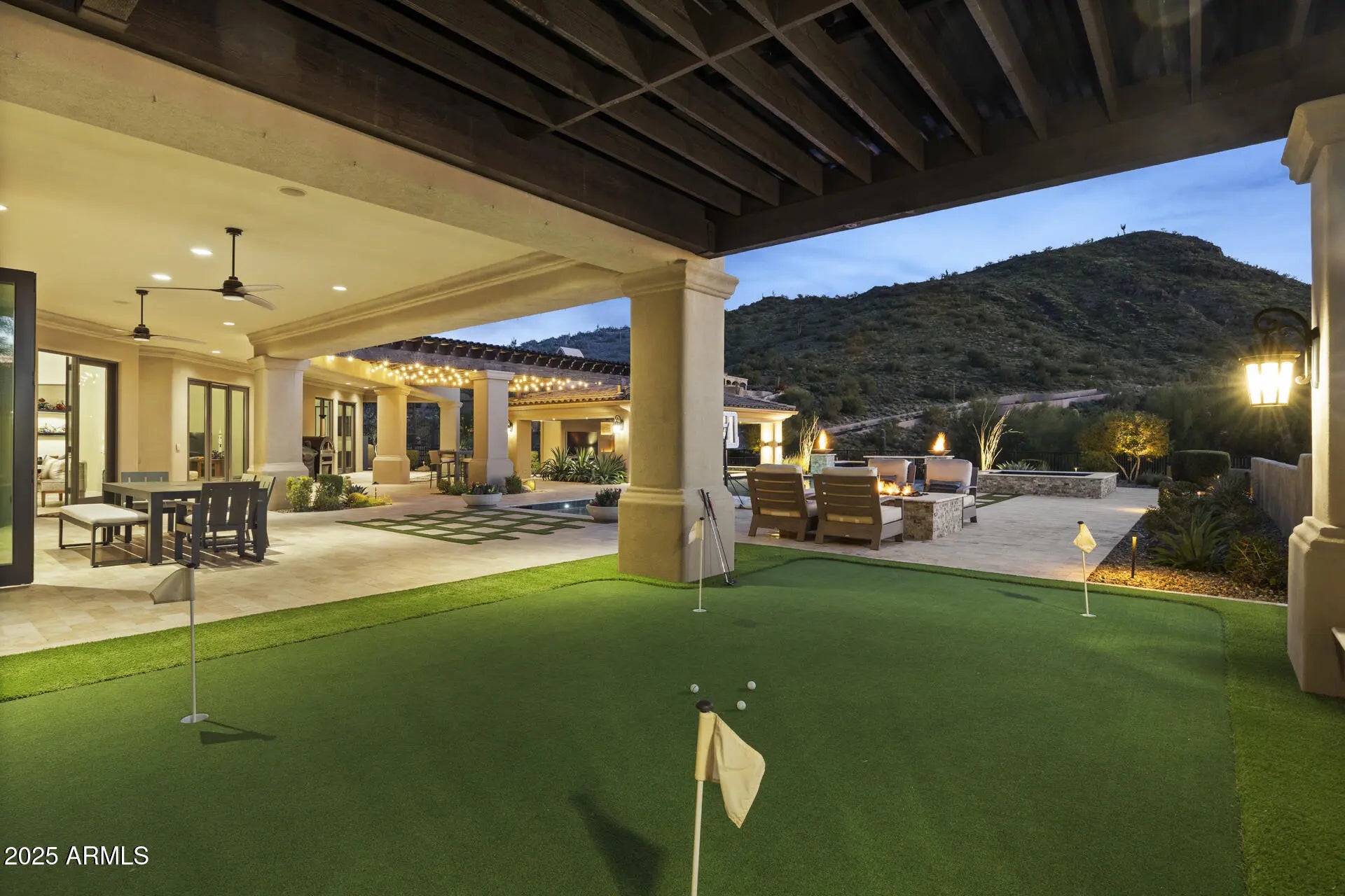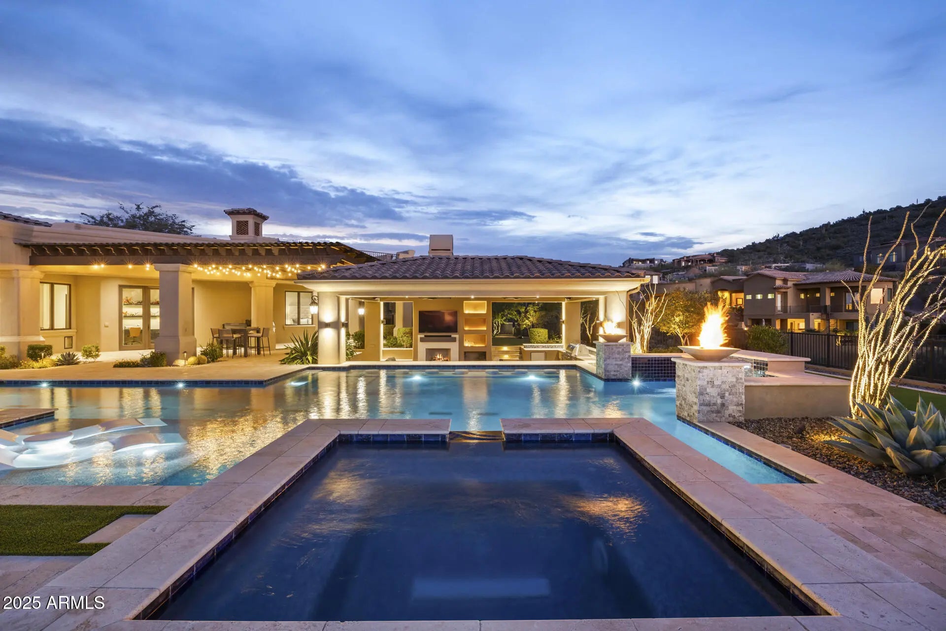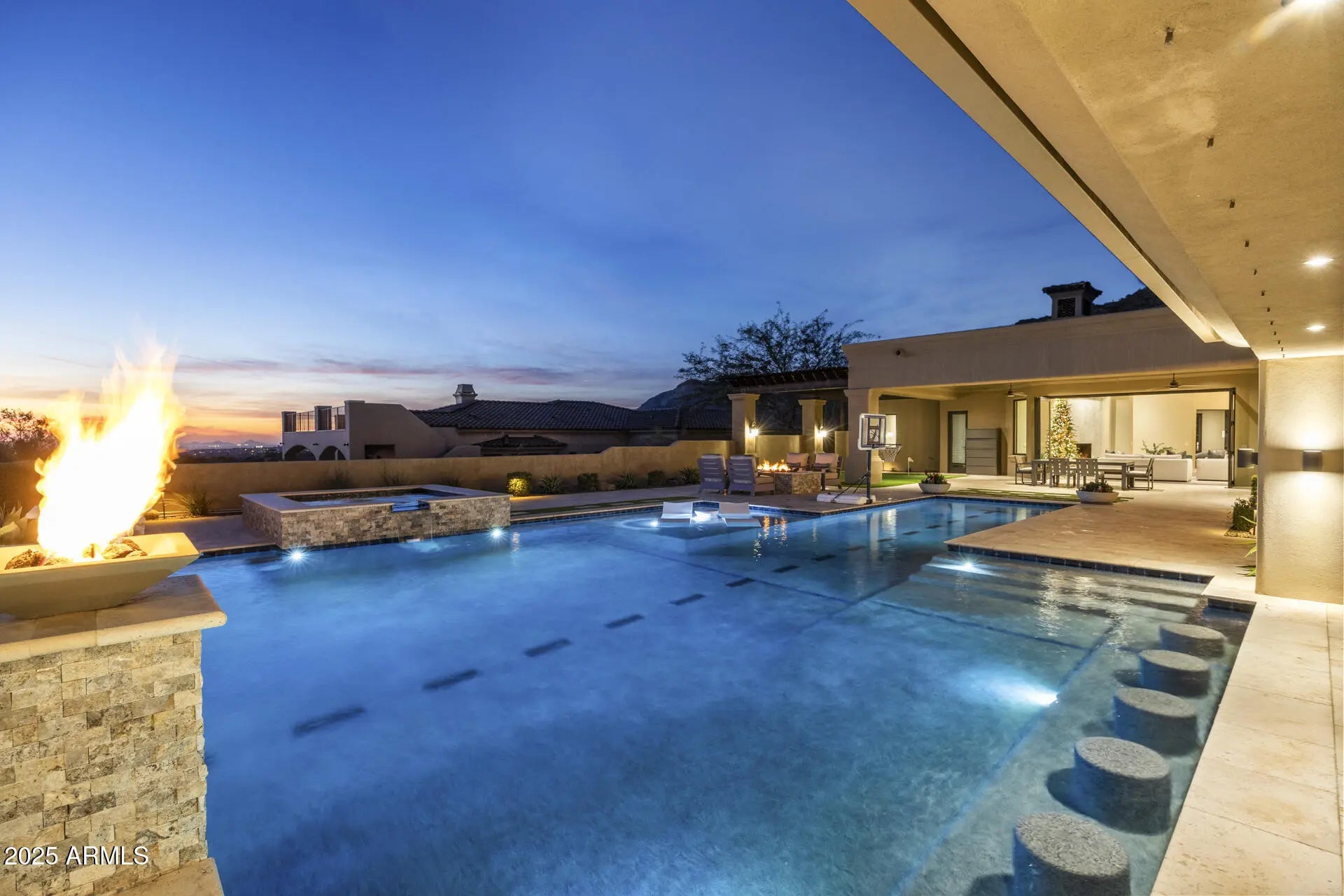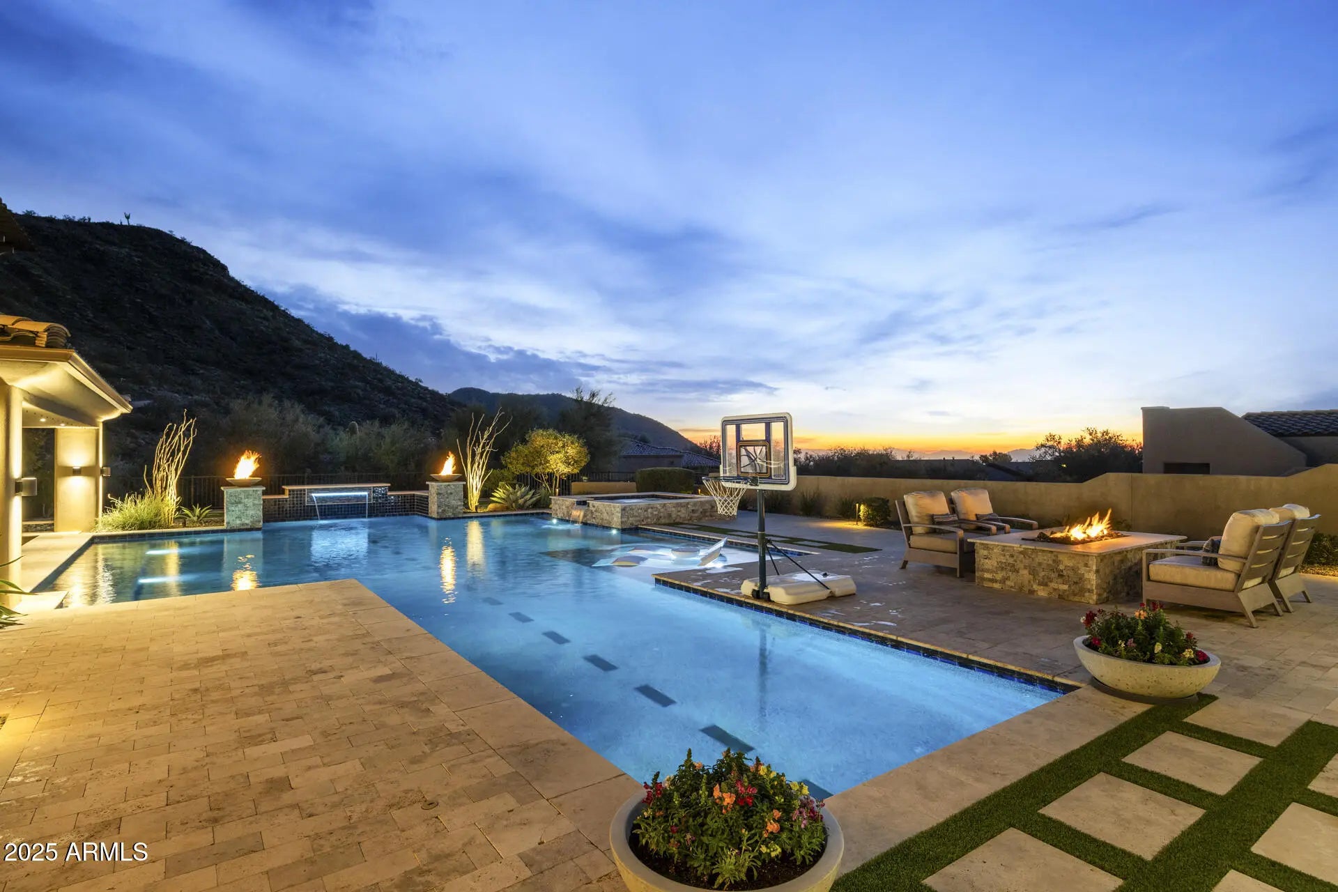 From the rooftop deck to the stunning backyard, this home was designed for entertaining while enjoying the surrounding desert and mountains and absolutely nothing has been left on the drawing table regarding finishes, amenities and design. Every bedroom has its own bathroom and the primary suite is amazing with the views, large fireplace and oversized walk-in closet. A walk-in shower boasts two showerheads, and the soaking tub is the perfect place to end the day. The family room blends seamlessly with the kitchen and the outdoors, making it the most popular indoor space when hosting family & friends. Double islands, a Wolf gas range, SubZero fridge & freezer and steam oven are only a few of the luxury amenities in the kitchen & eat-in area which bring the outdoors in with a large picture window & glass door. A wet bar finishes the area and adds more warmth to an already cozy and warm space while providing that perfect extra touch to a home designed for welcoming guests. The gas fireplace in the family room is a gorgeous focal point as are the detailed ceilings and other architectural highlights. As you enjoy the play pool, your family and friends will delight in hanging out on the bocce court, putting green or in the outdoor kitchen & family room backdropped by the mountains and a swim up bar. Multiple gathering areas are available for play, dining or just hanging out...because where else would you rather be than under the gorgeous Sonoran Desert sky while in the comfort of your own home? Hidden Hills is a desirable North Scottsdale gated custom luxury home community nestled in the McDowell Mountain foothills. It is close to hiking trails, golf courses, schools, parks, shopping, dining and entertainment. Homes like this don't come along often, so don't wait on this one!