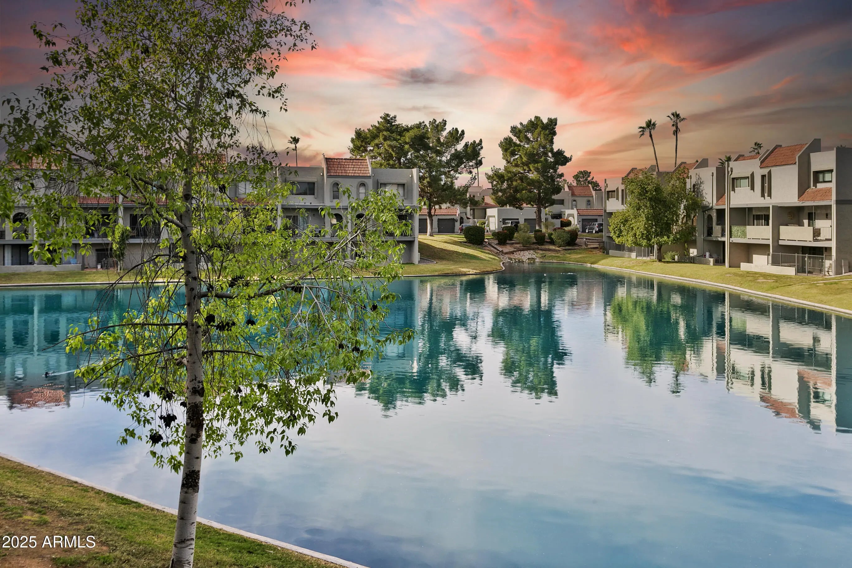 Whatta beauty! This waterfront 2 bed, 2 bath home is located in a gated community with a beautiful lake view off the back patio! This home sits on the beautiful Dobson Ranch Golf Course and features open concept living with great spaces for entertaining. Your home has the extremely rare floorplan with vaulted ceilings, a large master suite on the upper level, and a second on the bottom level for a functional split floor plan. There are large walk out patios on the middle and lower levels with amazing views. You will find shutters on all of the windows throughout the home, and a spacious open living room with a fireplace. New top of the line appliances! Perfect place to make your own!