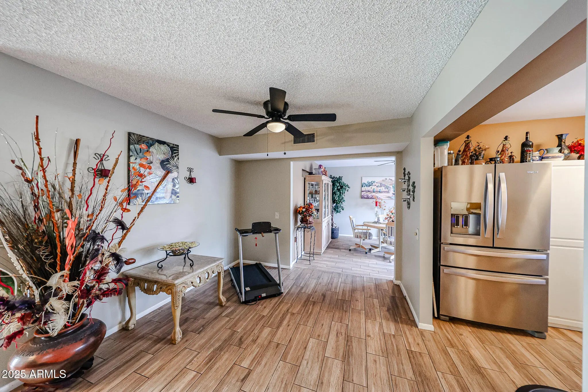 Charming home located in the desirable 55+ Sun City community! This warm and inviting residence features wood-like tile throughout and an open floorplan with a spacious great room, dining area, and a versatile bonus room—perfect for a den, exercise room, or craft space. The bonus room offers double sliding doors that open to a private patio, ideal for indoor-outdoor living. The kitchen includes newer appliances, ample cabinetry, and the refrigerator is included. The large primary bedroom features an equally spacious primary bath. The garage offers built-in cabinets for added storage. Enjoy Sun City's incredible amenities including 8 recreation centers, swimming pools, tennis courts, racquetball, pickleball, bowling, multiple golf courses, and more.