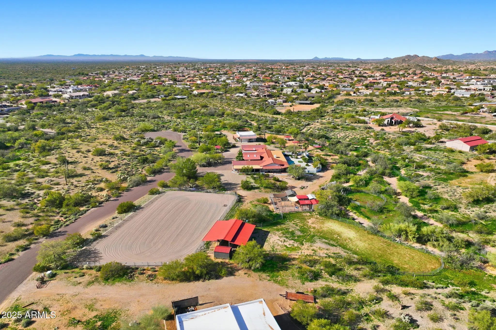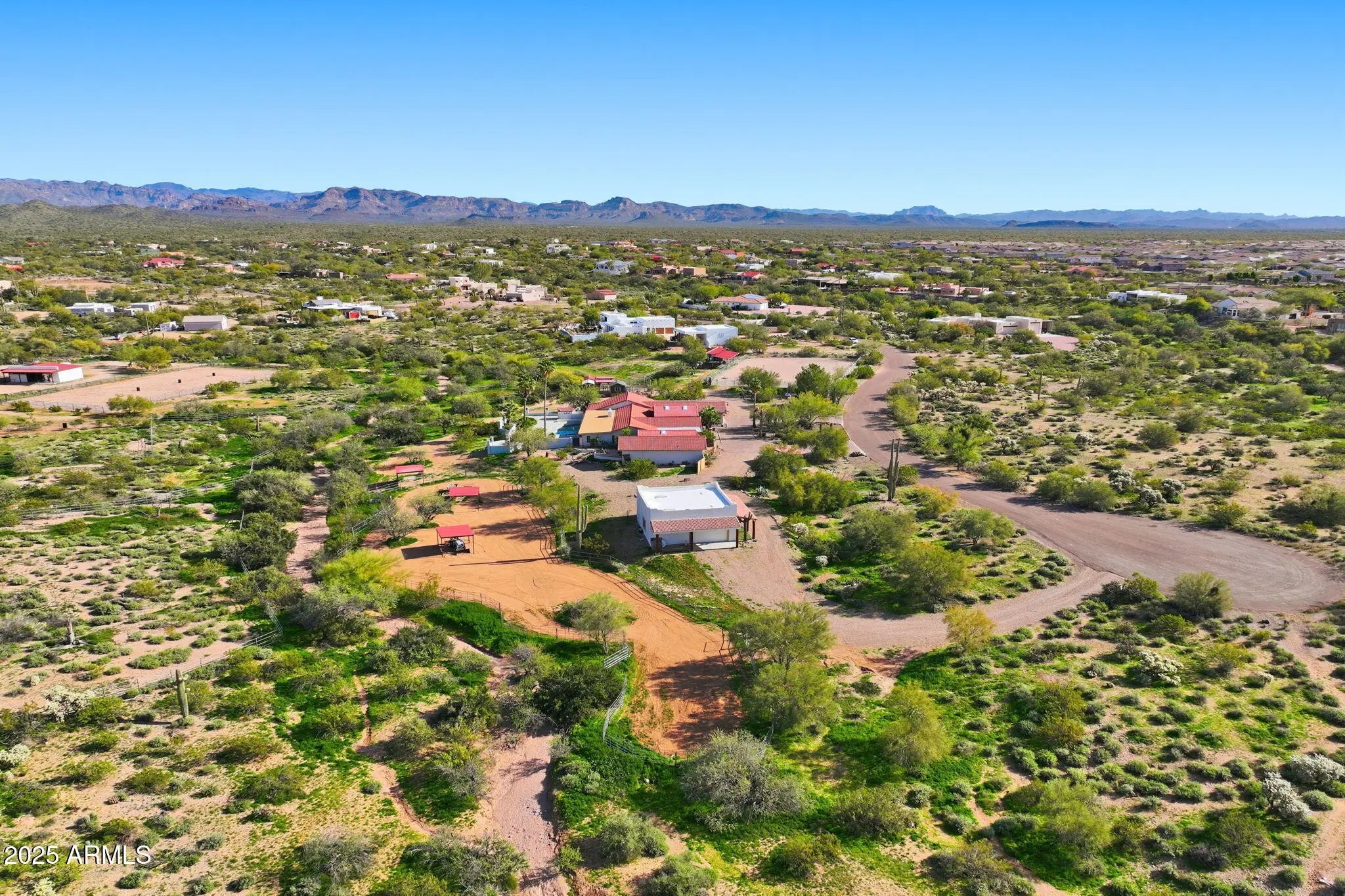 Set On Almost 4 Acres With Sweeping Panoramic Superstition Mountain Views w/ Heated Pool & Spa, This Horse Property Delivers The Full Equestrian Lifestyle. Built For 8+ Horses, The Setup Includes A Large Sand Arena, Lit And Covered Stalls, Paddock, Turnout, Chicken/Peacock Coop And A Round Pen. Riding Trails Connect Directly To The Property, Eliminating The Need For Any Trailering. The Single-Level Main Home Offers 2,650 Sq Ft, UPDATED & UPGRADED-New Roof 2025, Recently Added 32X32 Detached Garage, Gourmet Chef's Kitchen Featuring A Giant Quartz Island, Bright LED Lighting And A Walk-In Pantry. Open Great Room Concept. Formal Sunken Living Room With A Fireplace. Indoor Workshop. The Primary Suite Showcases An Updated Bathroom And Giant Walk-In Closet. The Full Guest House Is 1,024 Sq Ft.