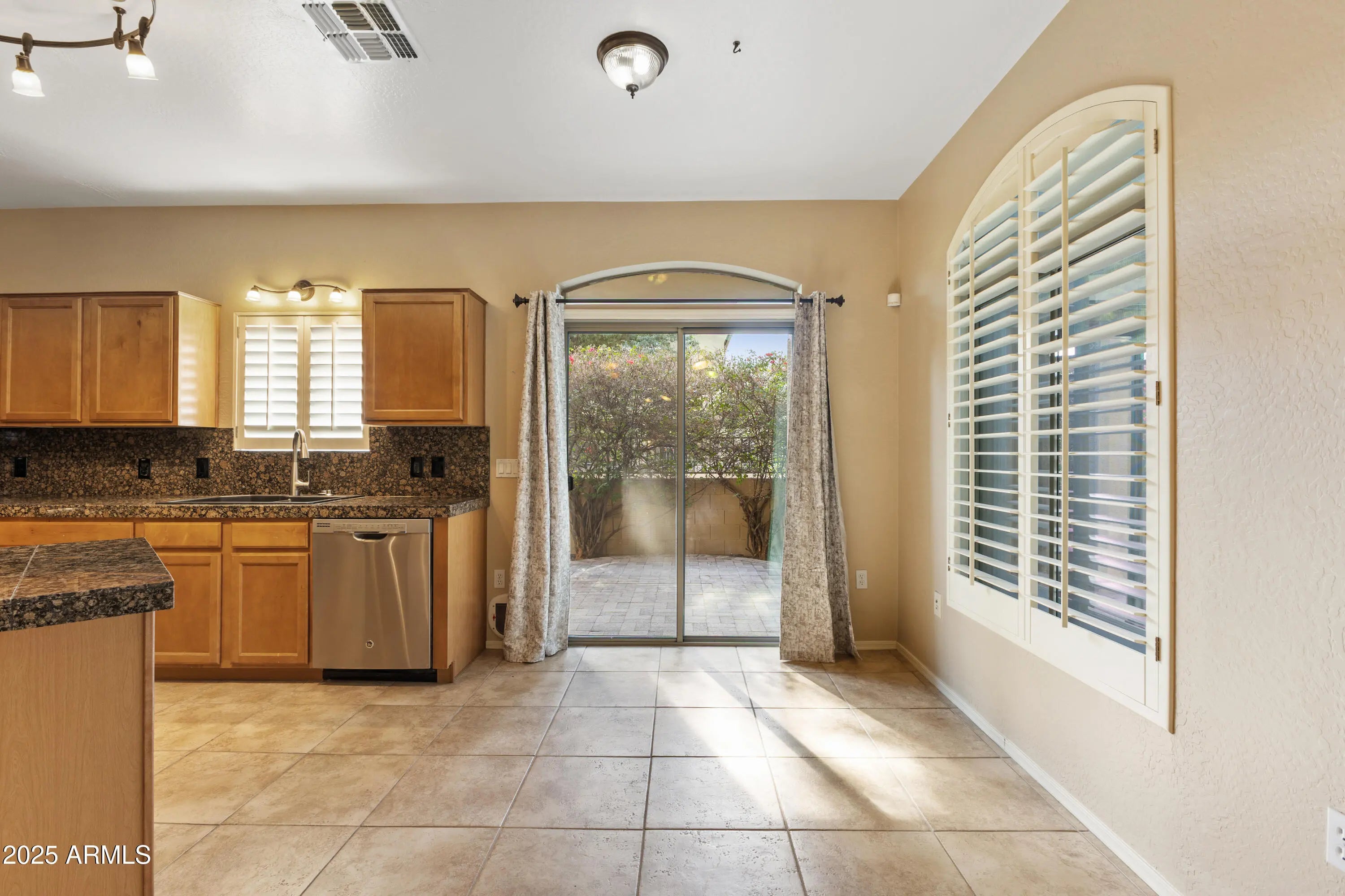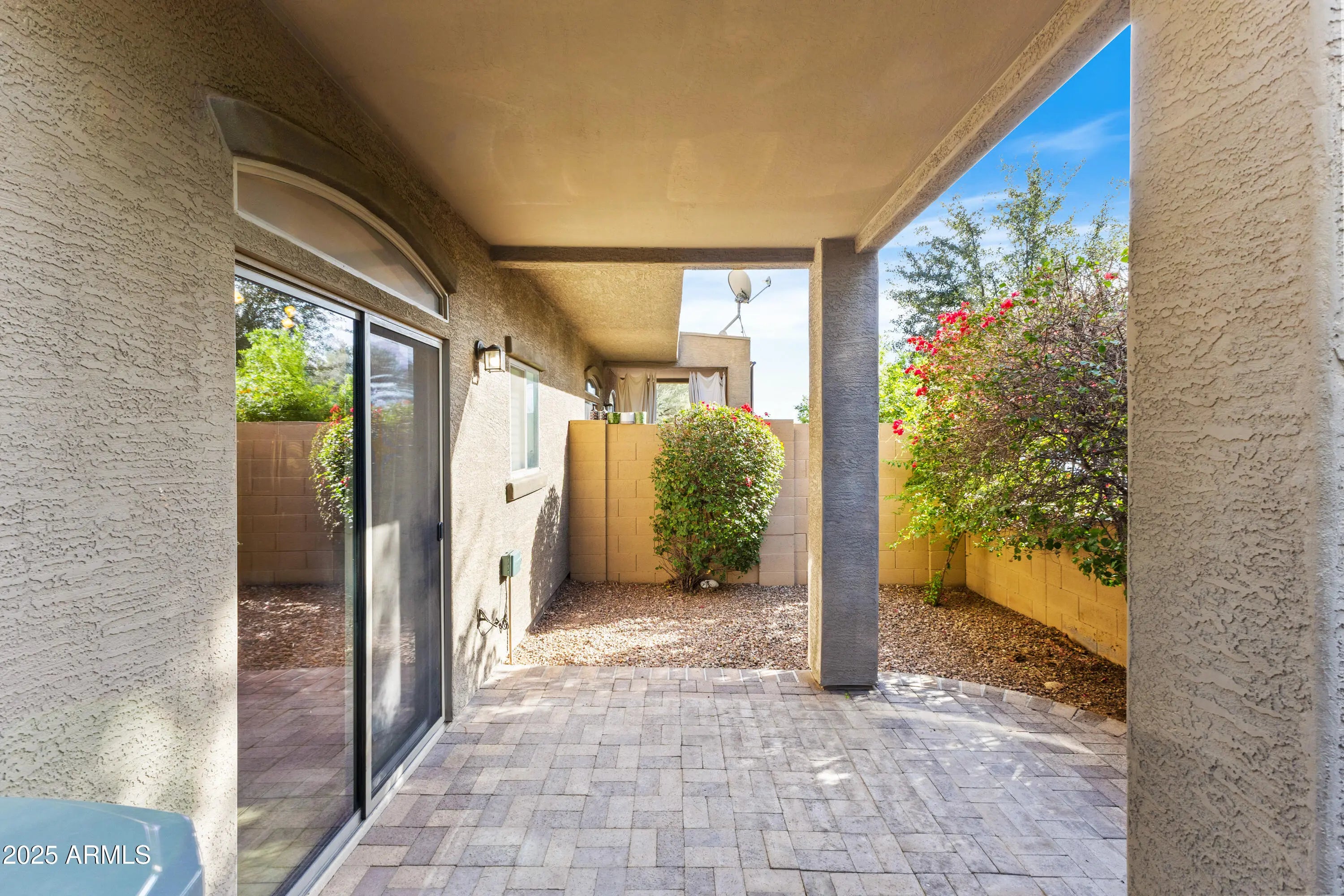 Beautiful 3-bedroom, 2.5-bath end unit townhome located in a quiet, gated community in a highly desirable area. New Trane AC 2025. This open and spacious floor plan features a well-appointed kitchen w/ island & granite tile countertops, seamlessly opening to the dining area & family room with direct access to a private backyard & covered patio perfect for indoor/outdoor living. Plantation shutters t/o and an additional downstairs room offers flexibility as a living room, home office, or media space. The primary suite upstairs boasts a private bath and walk-in closet, while two additional generously sized bedrooms share a full bath. A convenient powder room on main level. Ideally situated near Loop 101 and Paradise Valley Community College. Washer, dryer, and refrigerator are included..... truly move-in-ready home. Enjoy the benefits of an open end unit adjacent to open space, just steps from the community swimming pool. The two-car garage features an epoxy floor and direct entry into the home. Very nice this one is a must-see!