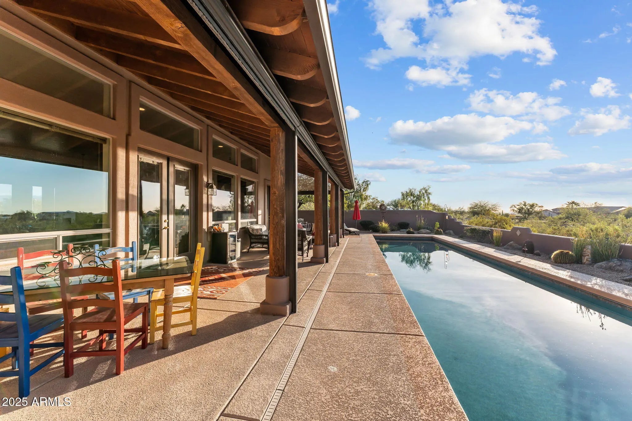 Set on just over two acres, this Southwest-style home offers space, privacy, and a layout that feels intentional and easy to live in. The great room is wide and welcoming, with tall ceilings, clerestory windows, and a wall of glass that keeps the patio and desert views in constant view. Natural light carries through the living, dining, and kitchen areas without feeling stark, creating a comfortable flow that works just as well day to day as it does when hosting. The kitchen is warm with granite counters, generous knotty alder cabinetry, and a large island that anchors the space and supports everyday routines. A spacious primary suite with an inviting layout. The en suite bath includes dual vanities, a walk-in shower and oversized walk in closet. Two additional bedrooms provide flexibility for guests, office space, or hobbies, supported by a second full bath. Tile flooring and baseboard run throughout the home. Outdoor living is a natural extension of the home, with a covered patio in the back, full power sunshades front and rear and a 60 foot heated/cooled saltwater lap pool positioned to take in the surrounding views. The property includes a four-stall horse setup with shade and turnouts, almost a full acre of pipe rail fencing with multiple gates for easy cross fencing access, RV hookup, and an extended-length garage with room for vehicles, equipment, and storage. Miles of desert riding right from the property. Owned solar adds long-term efficiency, rounding out a property that supports a true desert lifestyle.