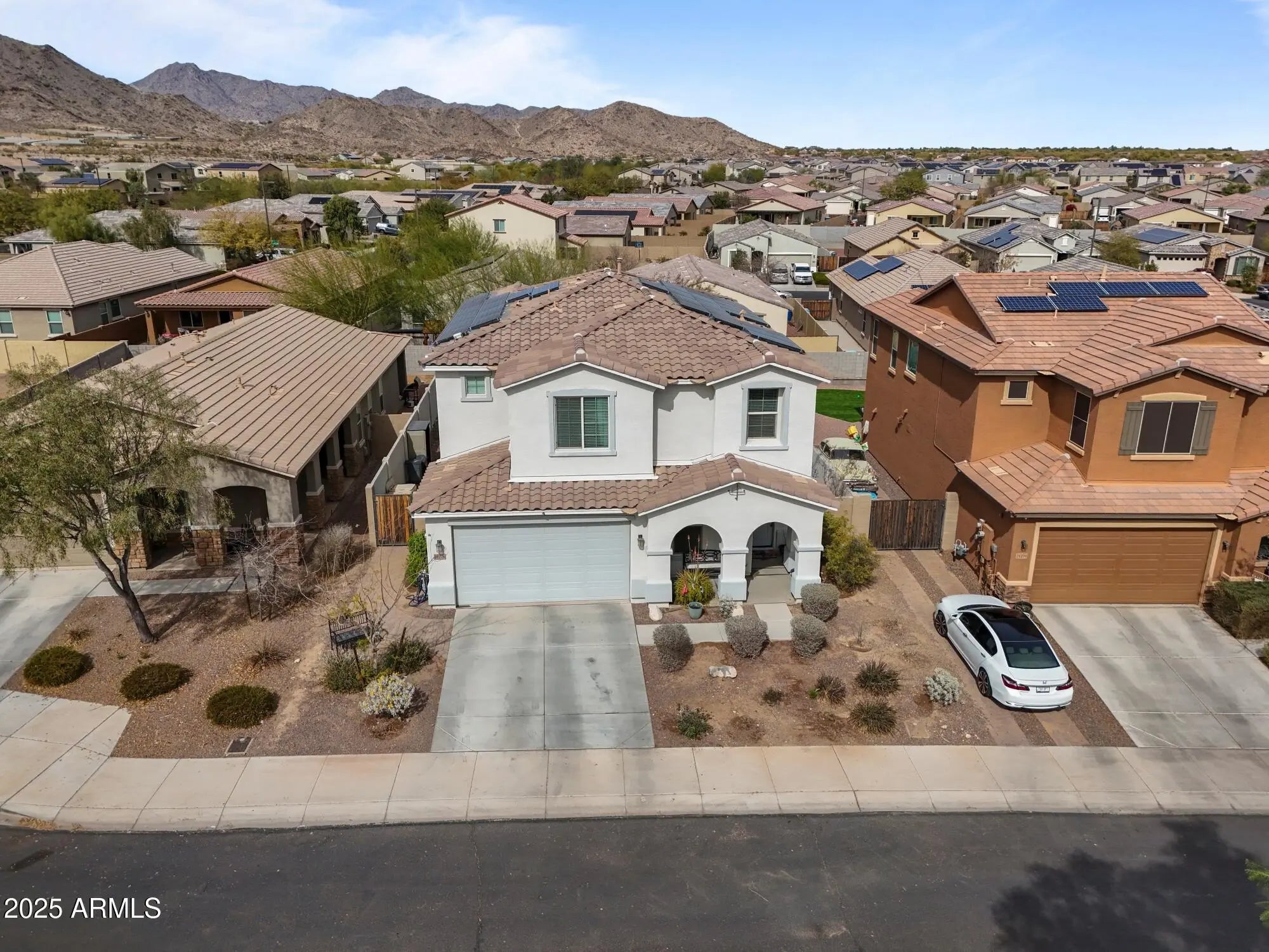 Stunning home in one of the fastest-growing cities in the country! This 3-bed, 2.5-bath residence with a versatile den and spacious loft sits in the desirable Sienna Hills community—soon to be walking distance to the 50-acre Verrado Marketside Mall set to open 2026. The chef's kitchen impresses with stainless steel appliances, double ovens, 5-burner gas cooktop, modern wood-slab island, granite counters, and a walk-in pantry. Flexible spaces include a large loft, private den, and a 3-car tandem garage. Step outside to a beautifully landscaped backyard with covered patio, pavers, and mature greenery—all framing breathtaking mountain views and unforgettable Arizona sunsets.
