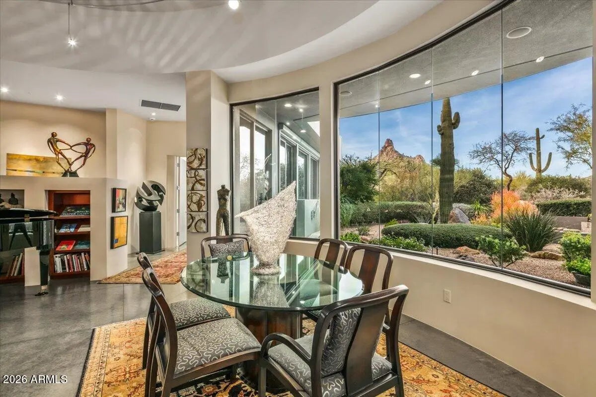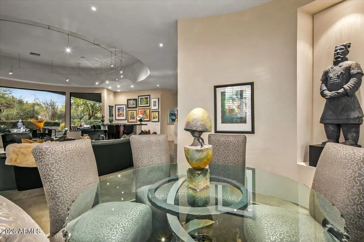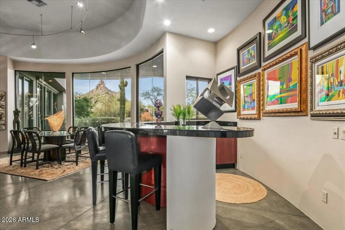 IMMEDIATE GOLF MEMBERSHIP AT CLOSE OF ESCROW. A true architectural statement in North Scottsdale, this one-of-a-kind residence is defined by its distinctive round design, thoughtfully imagined and designed by the original/current owners to create effortless flow and visual intrigue throughout. Walls of glass frame clear, unobstructed Pinnacle Peak views, filling the home w/ natural light and a constant connection to the desert landscape. The lower level offers exceptional versatility, featuring multiple flex spaces and a private bedroom ideal for a media lounge, wellness retreat, home office, or guest suite. A climate-controlled wine room adds an elegant touch for collectors and entertainers alike. Discreetly tucked away, ascend the hidden staircase (only accessible from the... home's interior) that leads to the rooftop view deck where breathtaking mountain vistas set the stage for sunset gatherings and quiet moments alike. Below, a tranquil backyard oasis unfolds with a sculptural water feature that brings movement, sound, and a calming, zen-like atmosphere, creating a private sanctuary perfectly aligned with the home's architectural serenity. Bold yet timeless, artistic yet livable, this home delivers a rare blend of inspired design, elevated lifestyle, and unforgettable presence. Owners also had plans previously drawn up for a pool and guesthouse to be added on the back side of the property. Plans would need to be resubmitted to Desert Highlands Architectural Design Review Board to be approved.